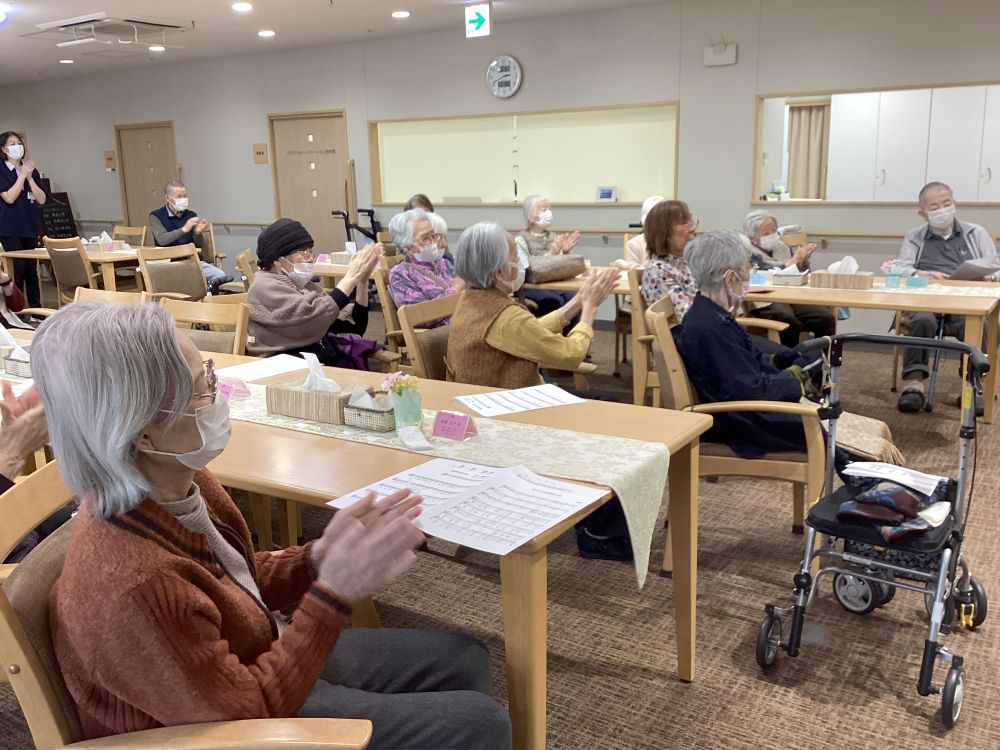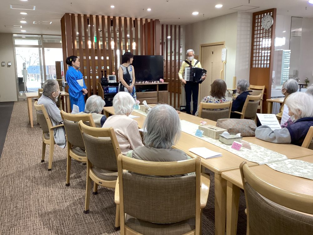 今回、ご入居者様のご紹介により、アコーディオン奏者と歌、そして日舞の鑑賞会を開催しました。