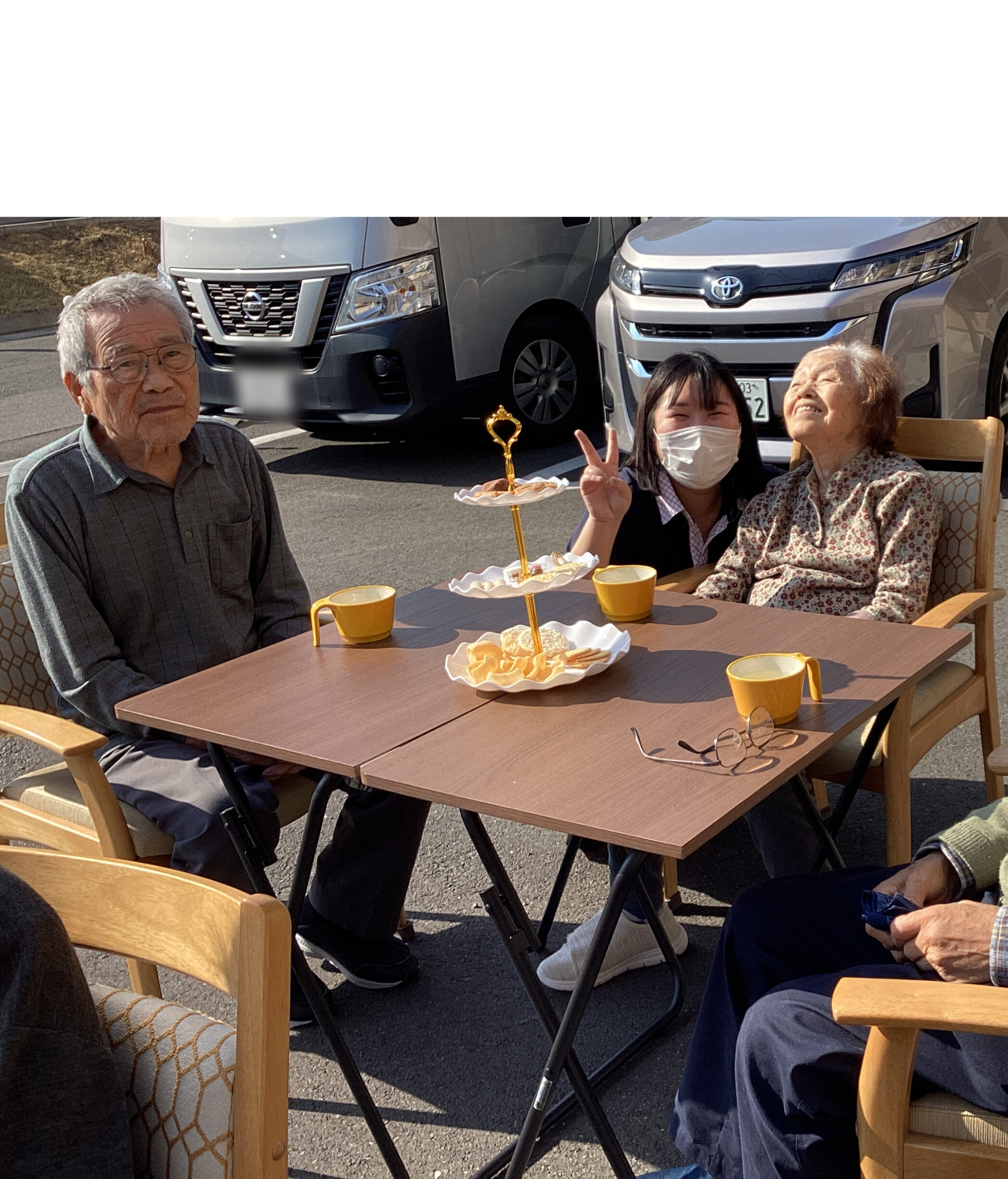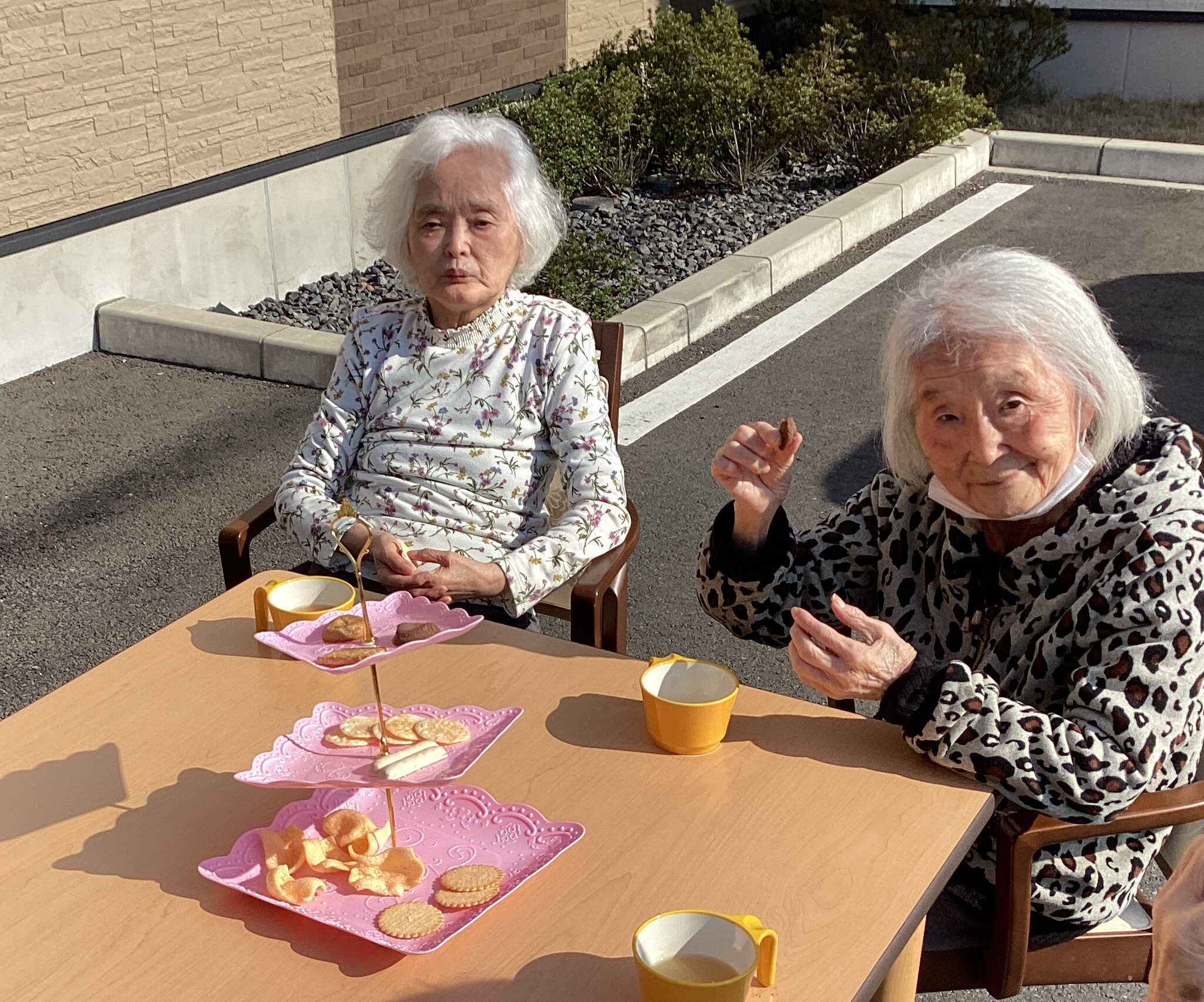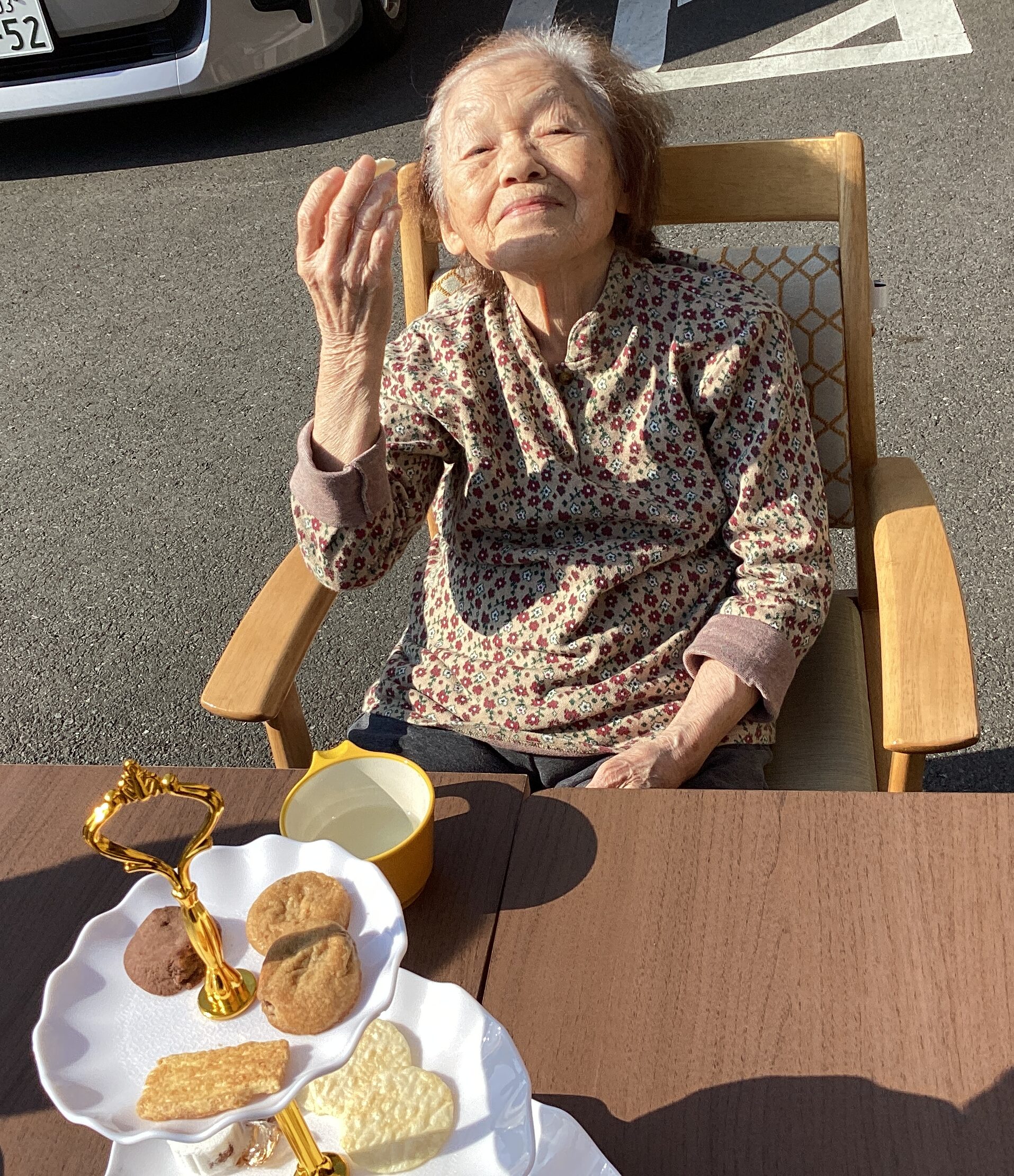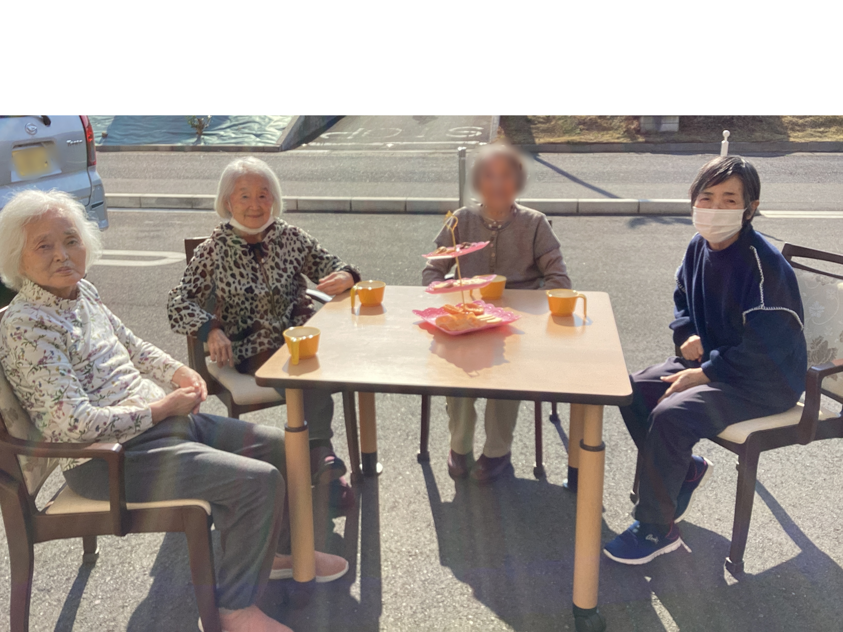 とっても良い天気だったのでこの日はお外でおやつを食べました♪ 皆様外の空気を吸って、美味しものを食べながらお話に花が咲いて楽しいひと時を過ごせたようでした💭