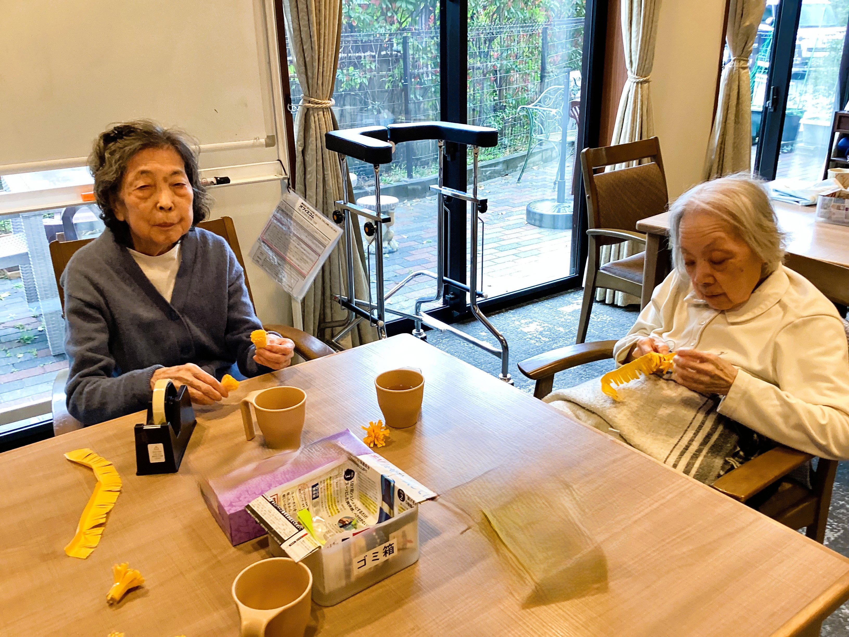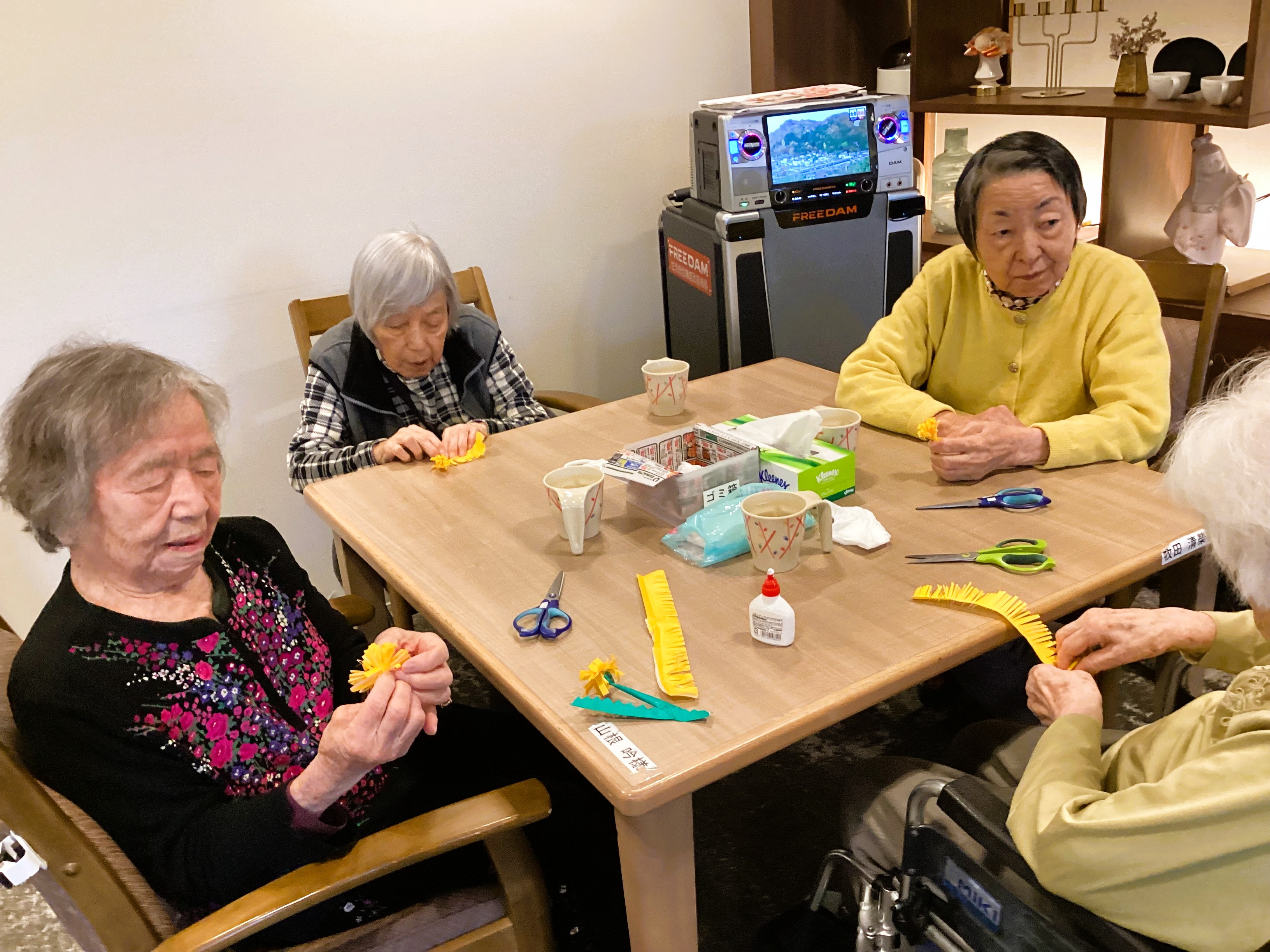 春の訪れを感じる今日この頃ですね✿ ご入居者の皆さまと、折り紙でお花作りをしました。 かわいくお花飾りをつけている方もいましたので、お写真を載せますね。