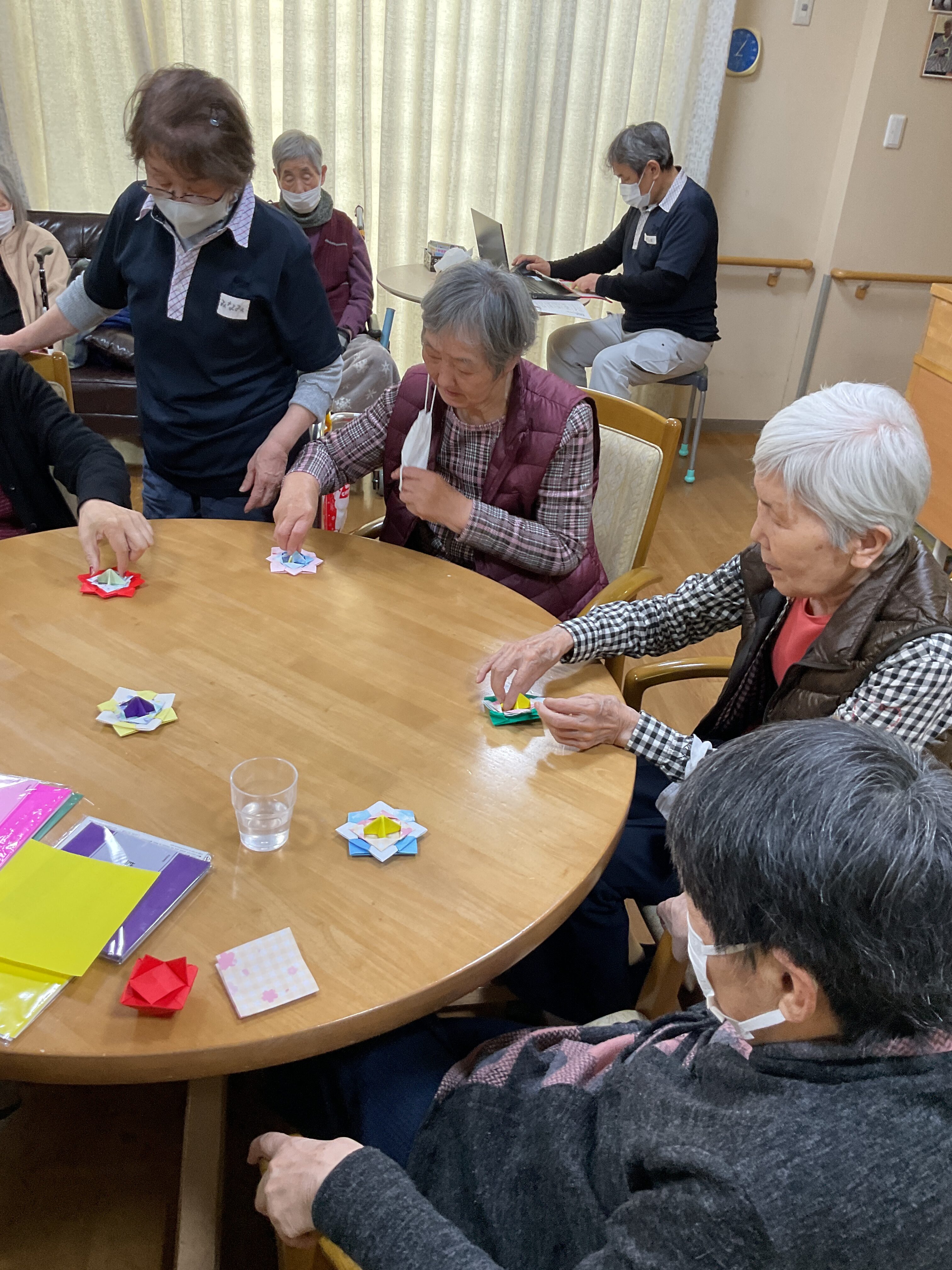 折り紙で水芭蕉と駒を折りました。駒を折るのには苦戦しておりましたが、それぞれ回すと完成度の良さに微笑んでおりました。皆さん良く頑張りましたね。