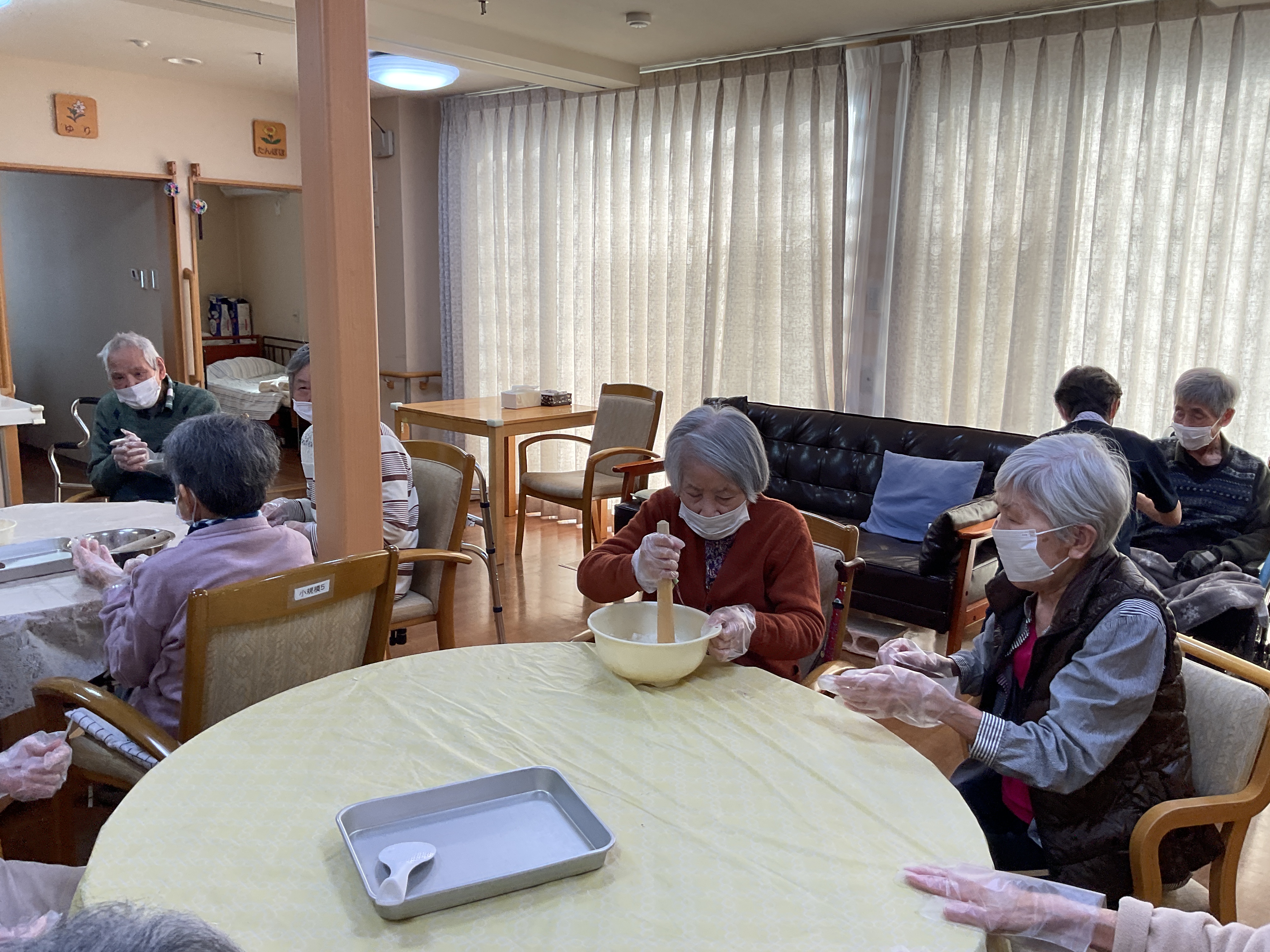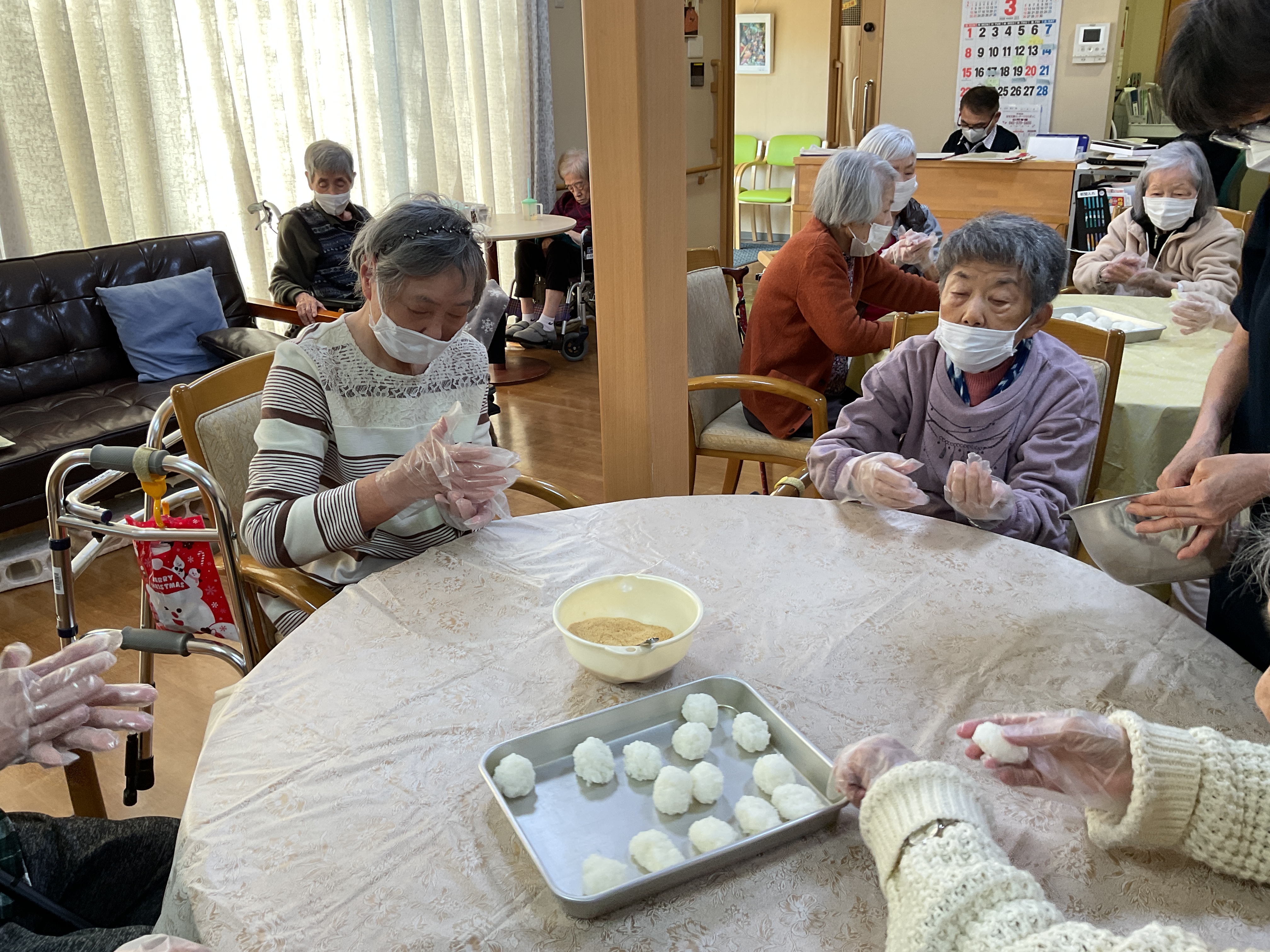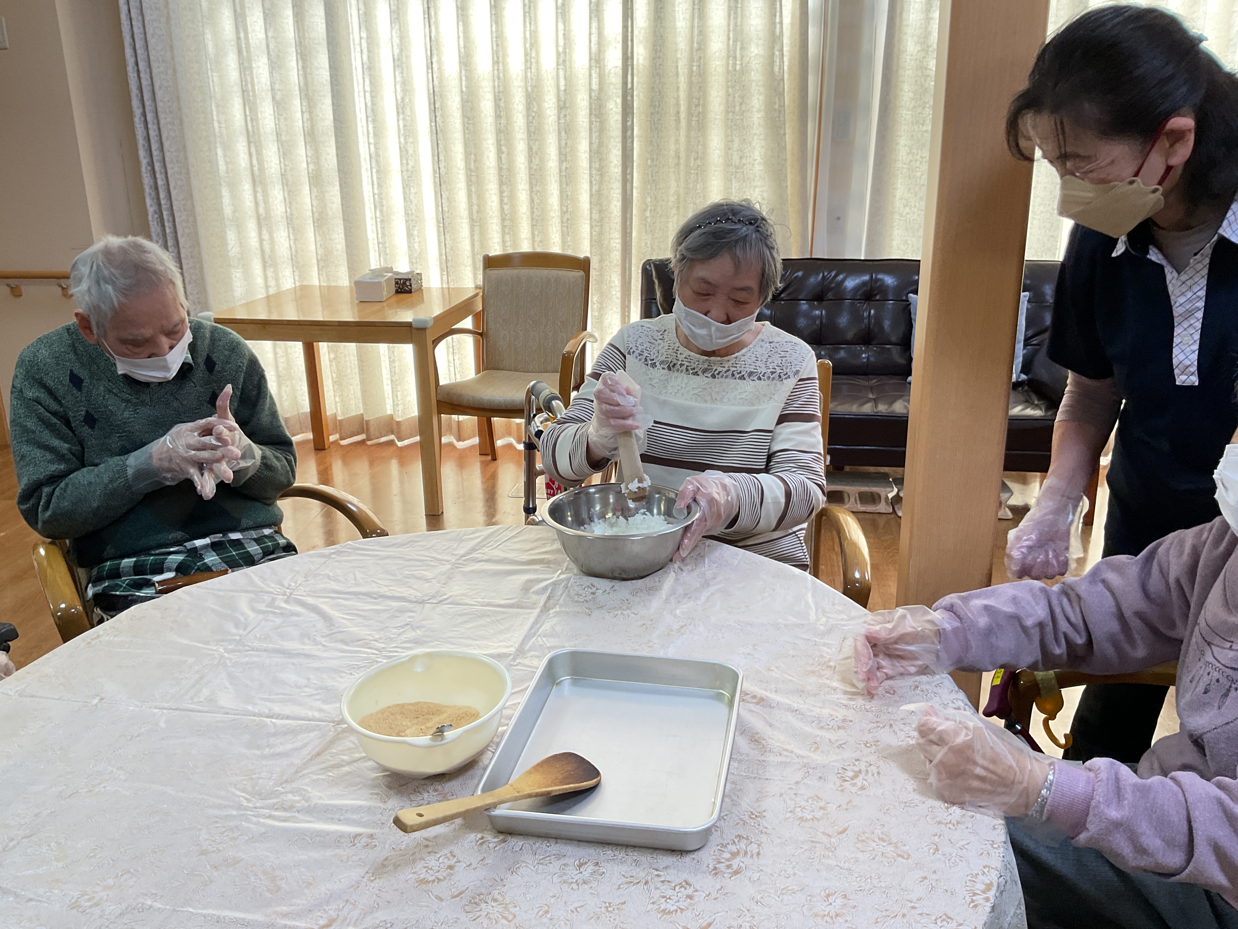 ぼたもちときなこもちを作りました。交代でもち米をはんごろししてますね。上手に丸めて完成。美味しく出来上がりました。