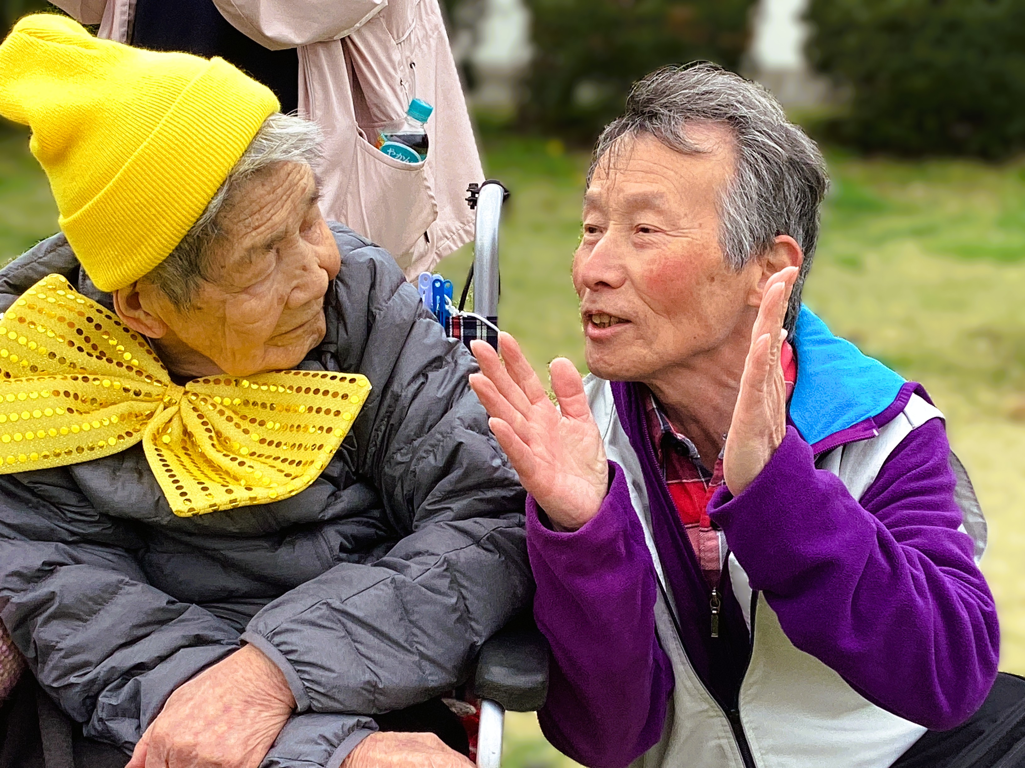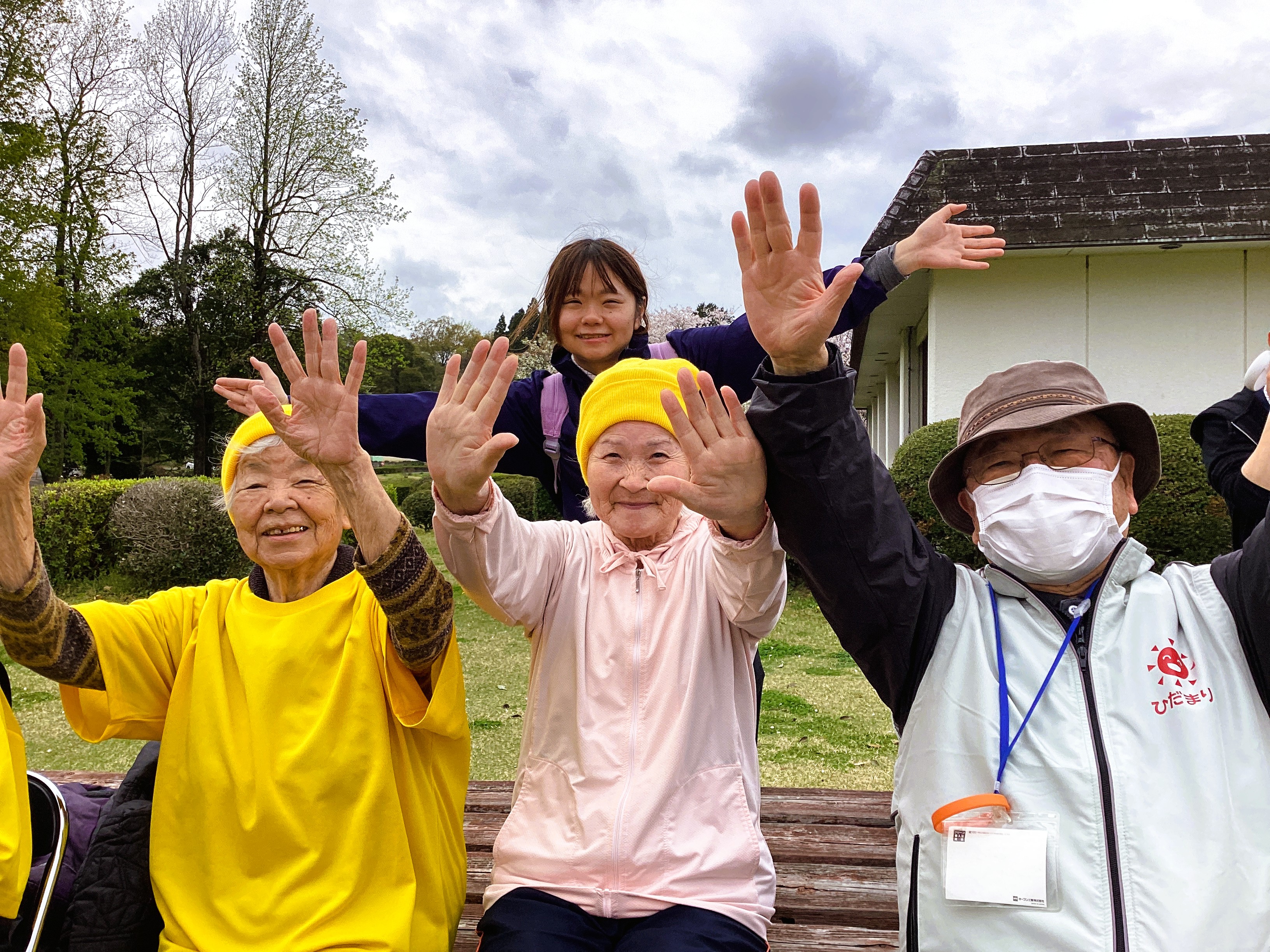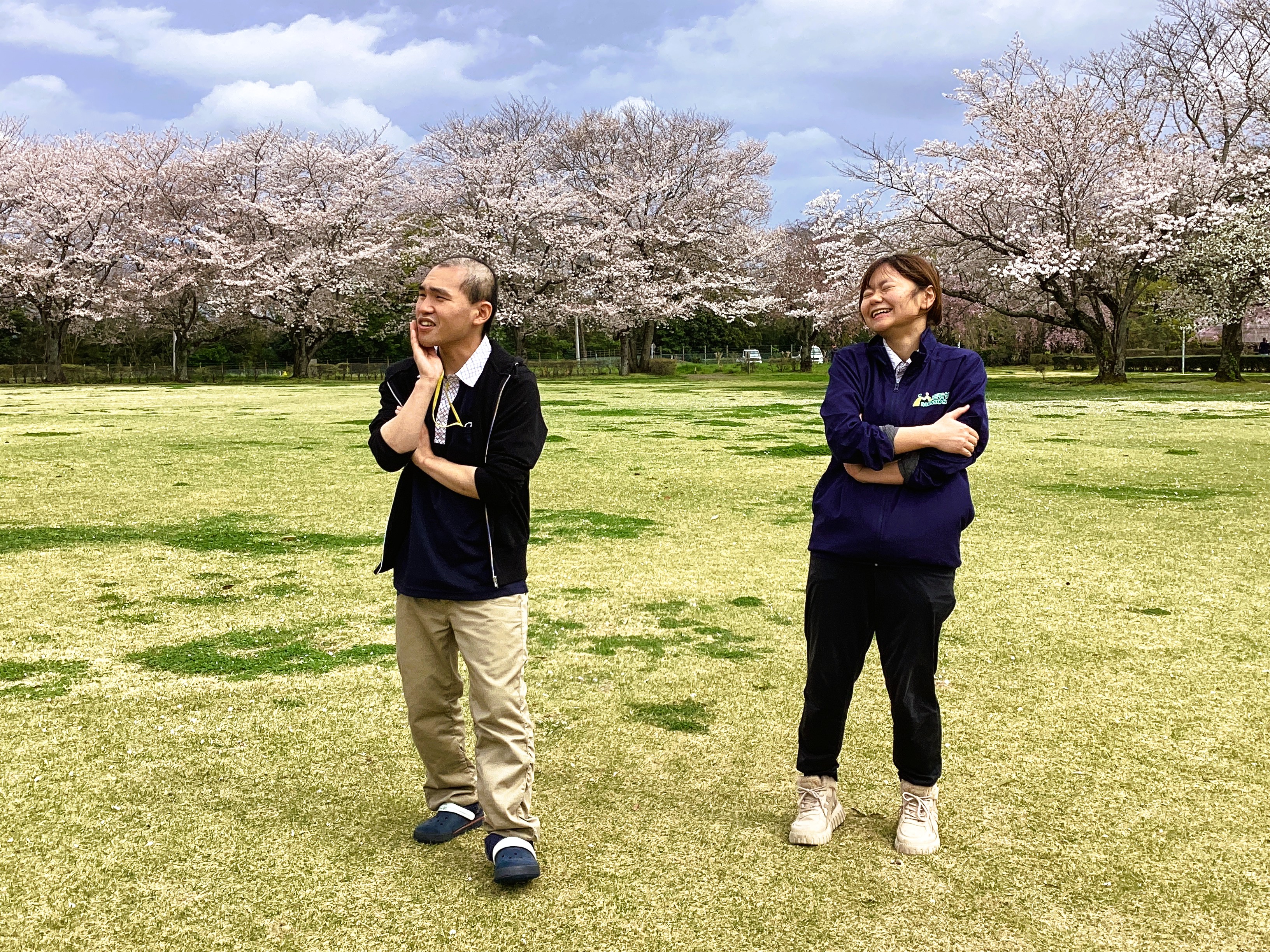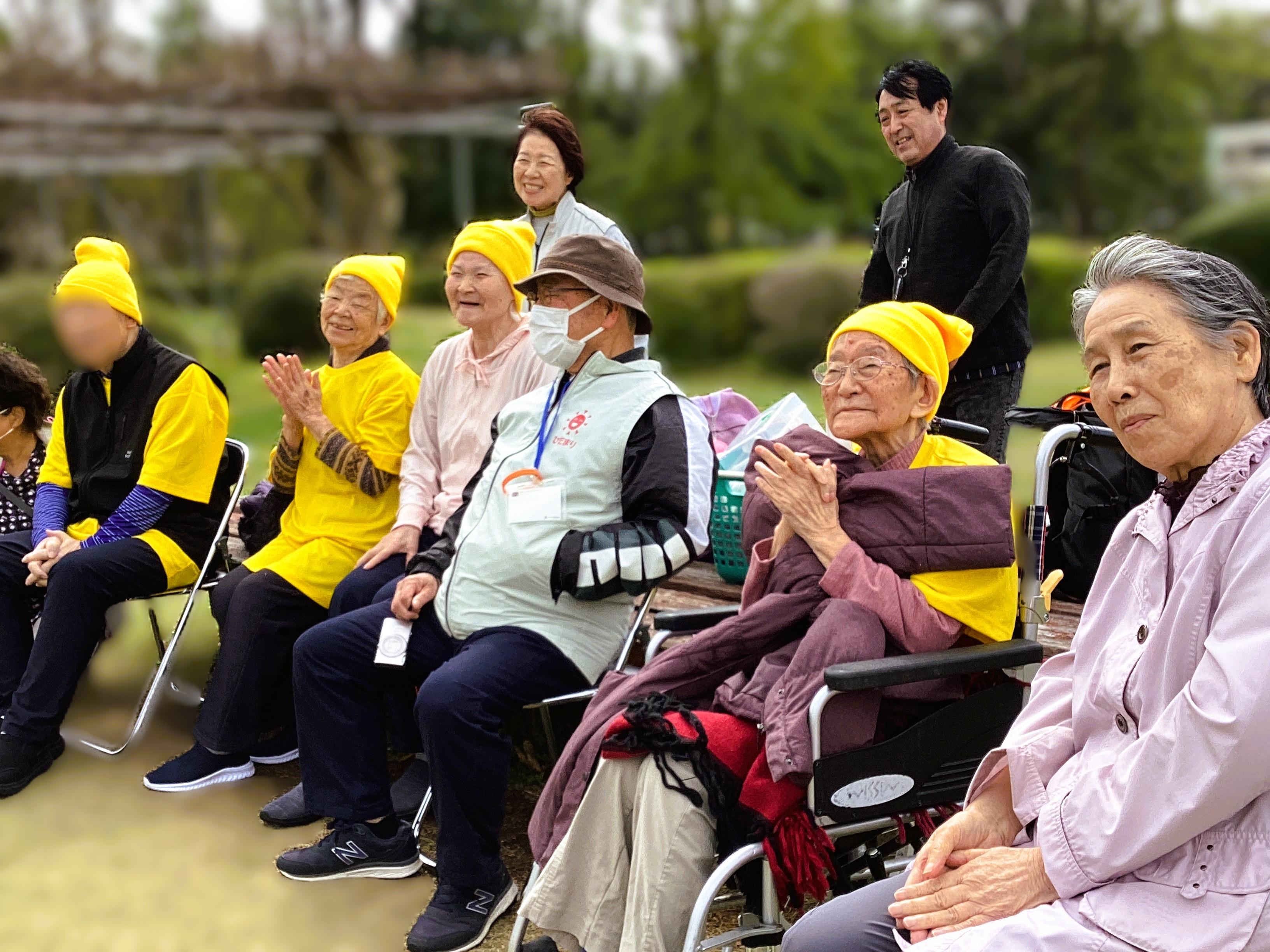 いよいよ到着!ツアーの目的地あずの里へ! ボランティアさんと利用者様と桜の木の下で記念撮影💛 桜は満開!笑顔も満開! ミモザ市原GH即席漫才でもっと笑顔にしちゃいました🌟
