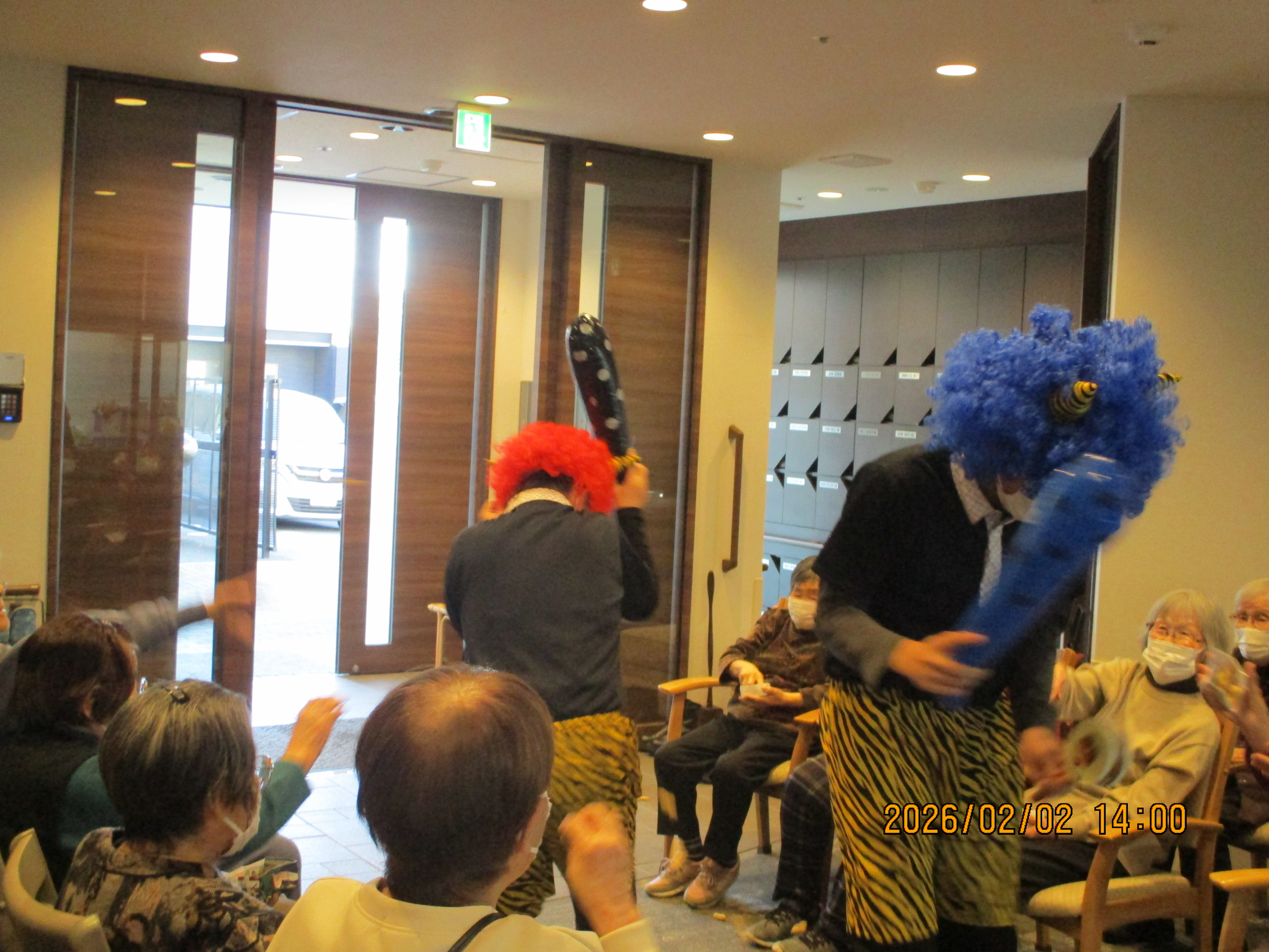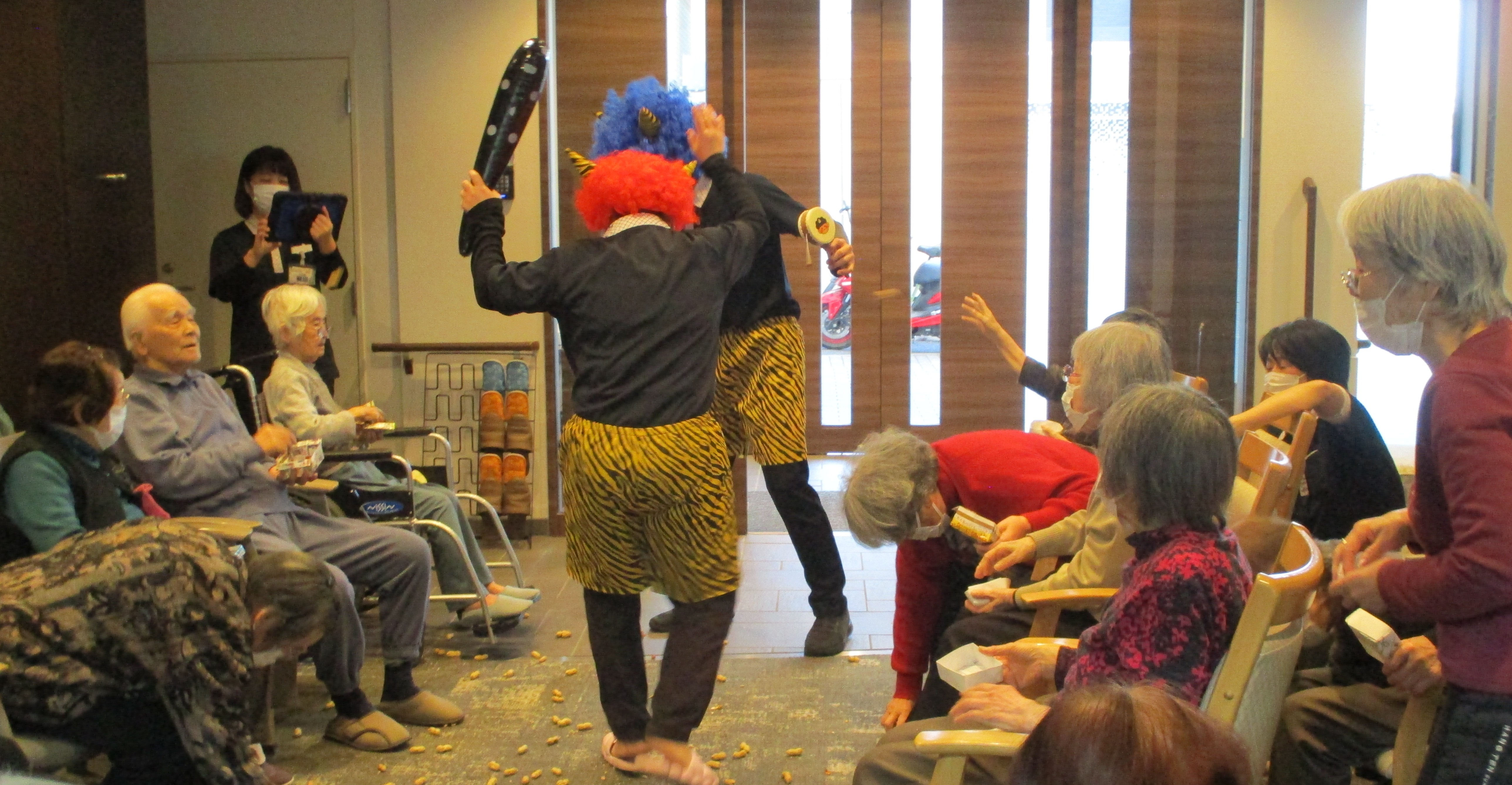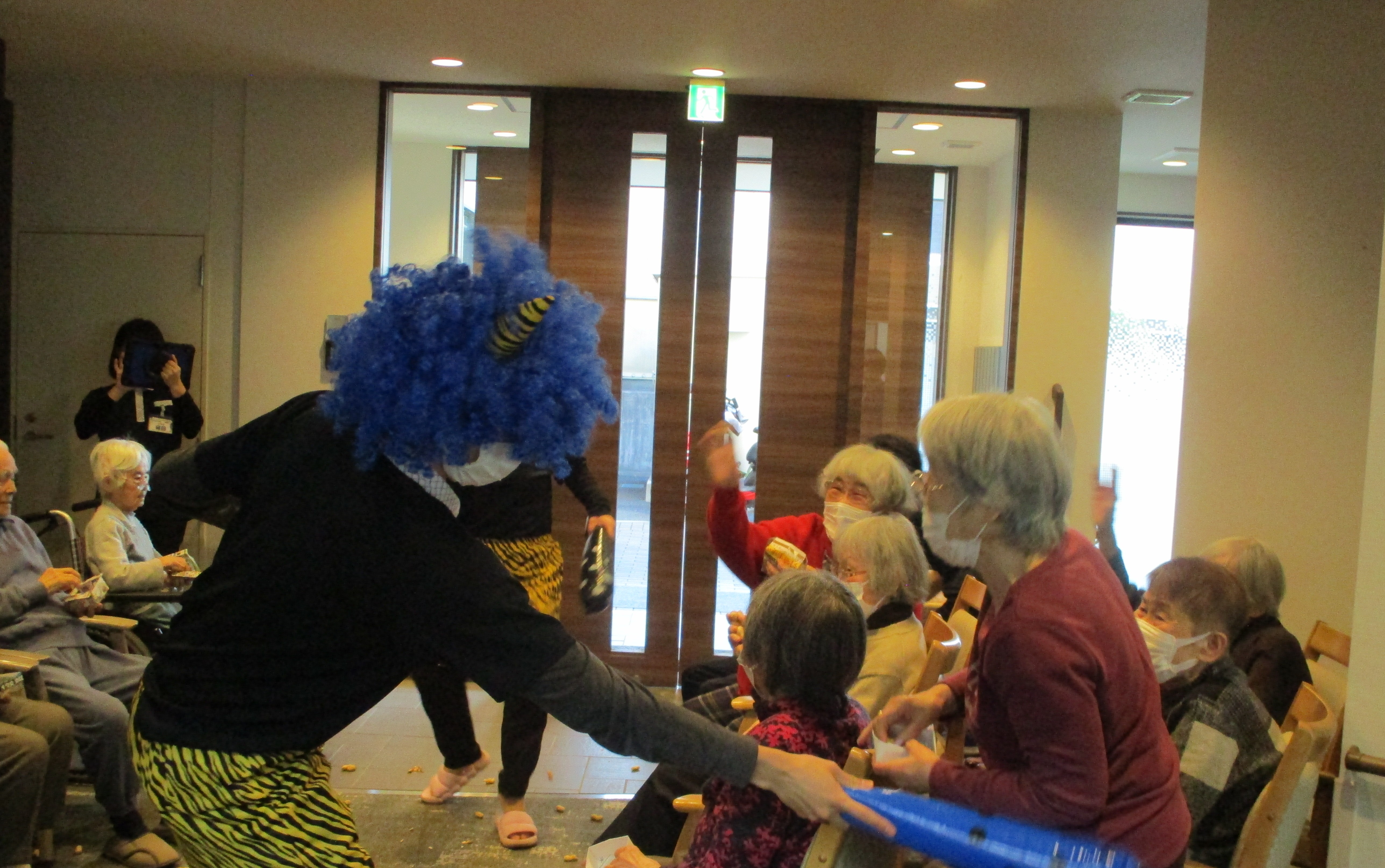 併設デイサービスと合同で節分イベントを行いました! 玄関で鬼に向かって豆を投げられました🫘 皆様に福が来ますように😊