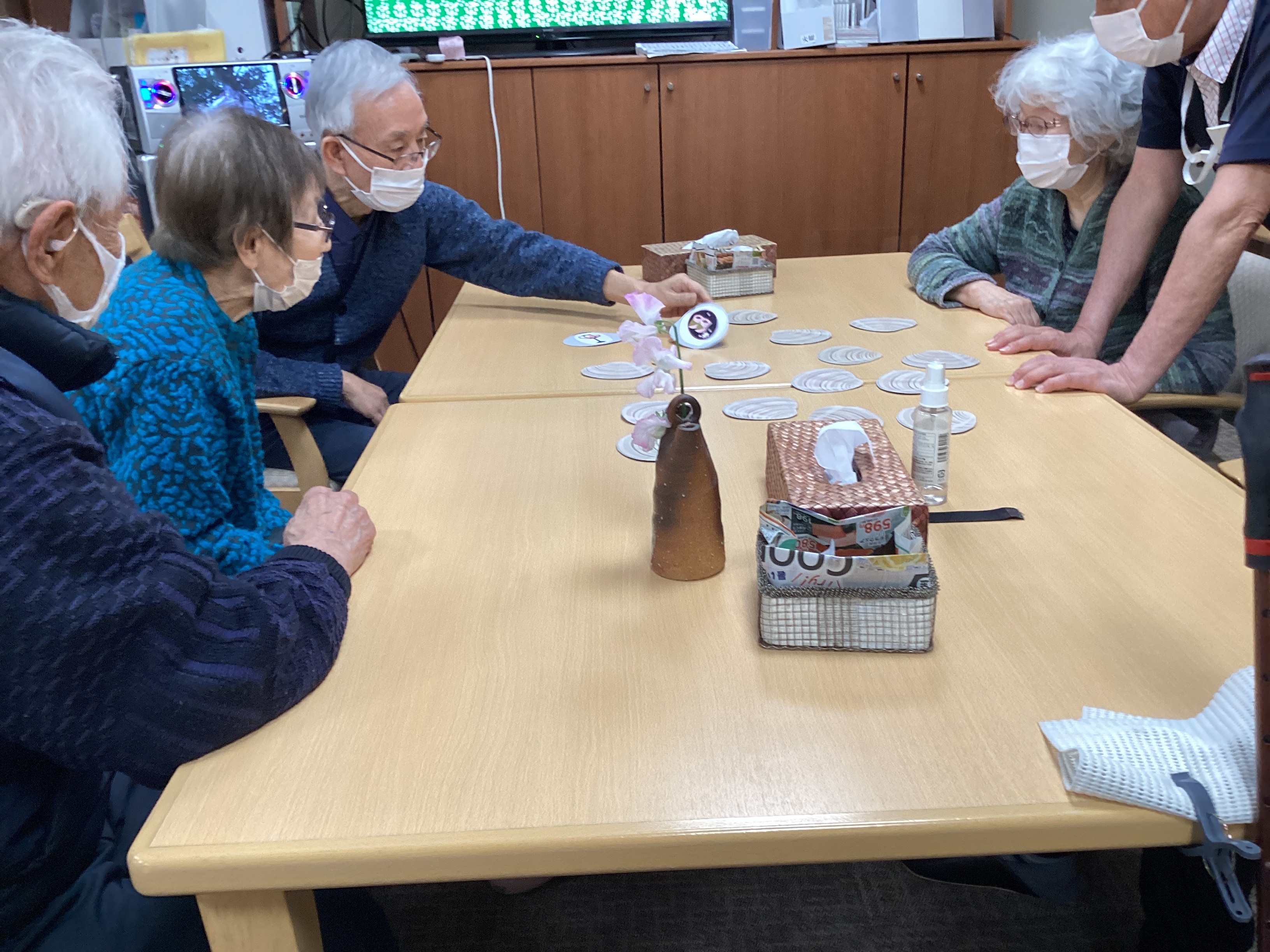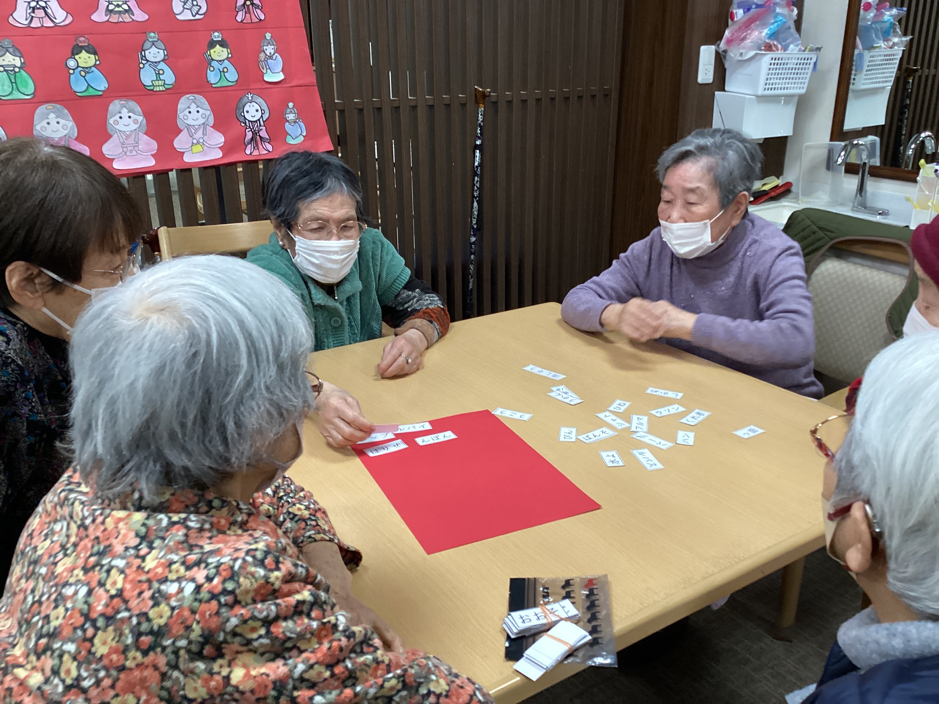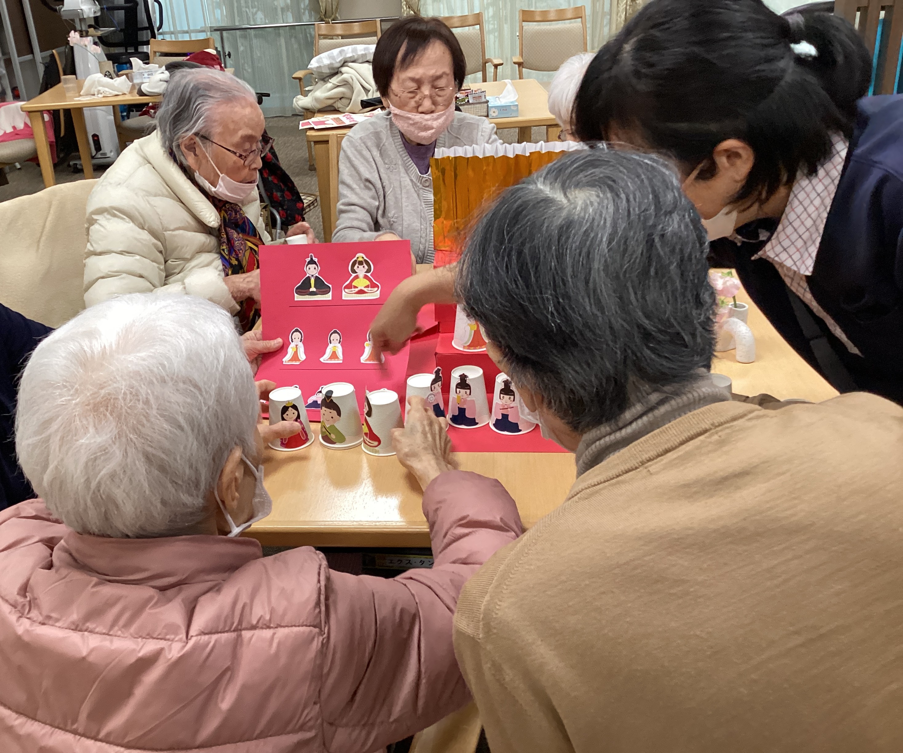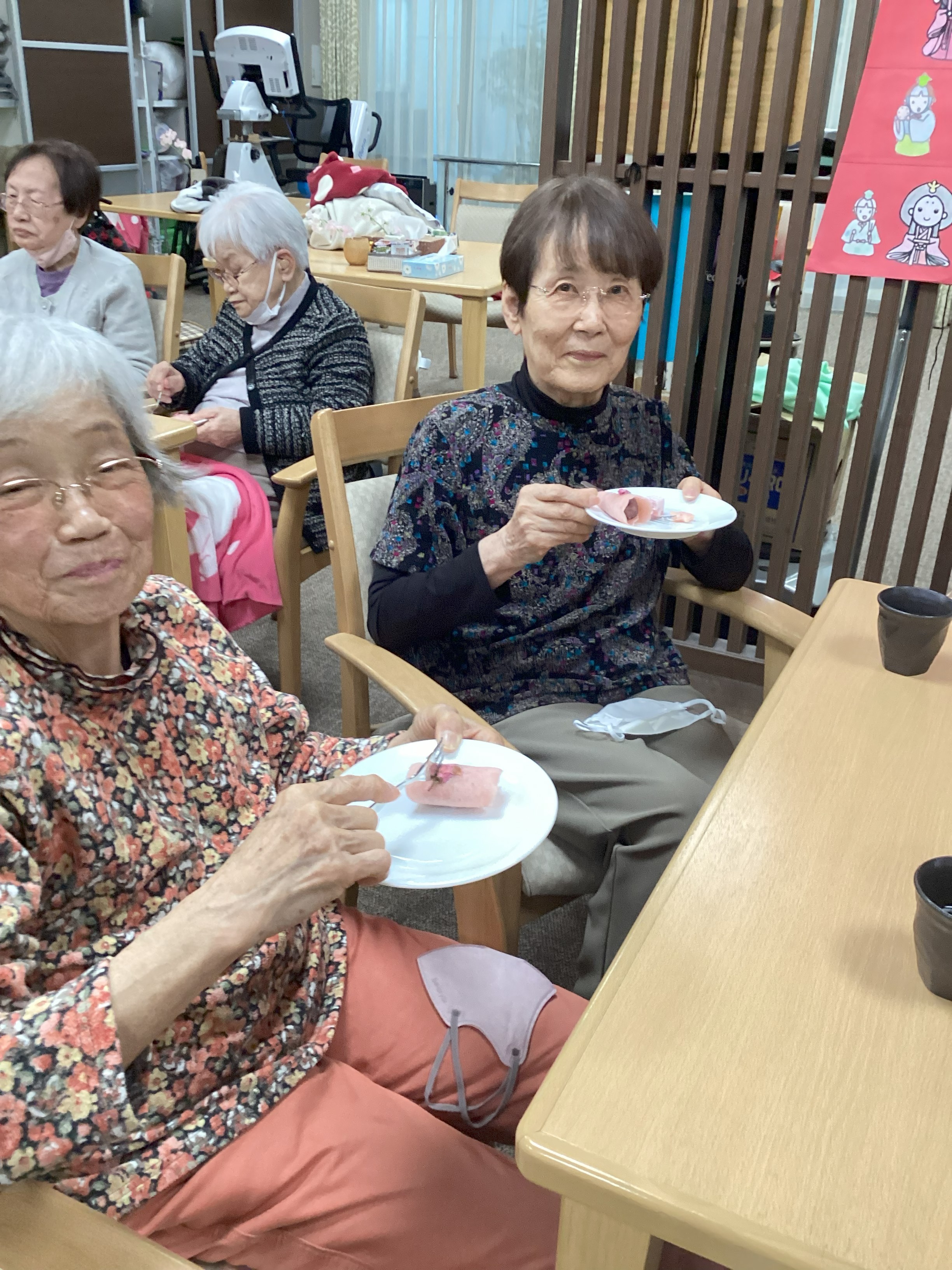 ご利用者からの要望もあり、ひな祭りイベントを開催!!春の歌を歌い、ひな段揃えゲームや貝の絵合わせ、言葉つながりクイズなどのゲームで盛り上がり、手づくり桜もちでおやつをお楽しみいただきました。