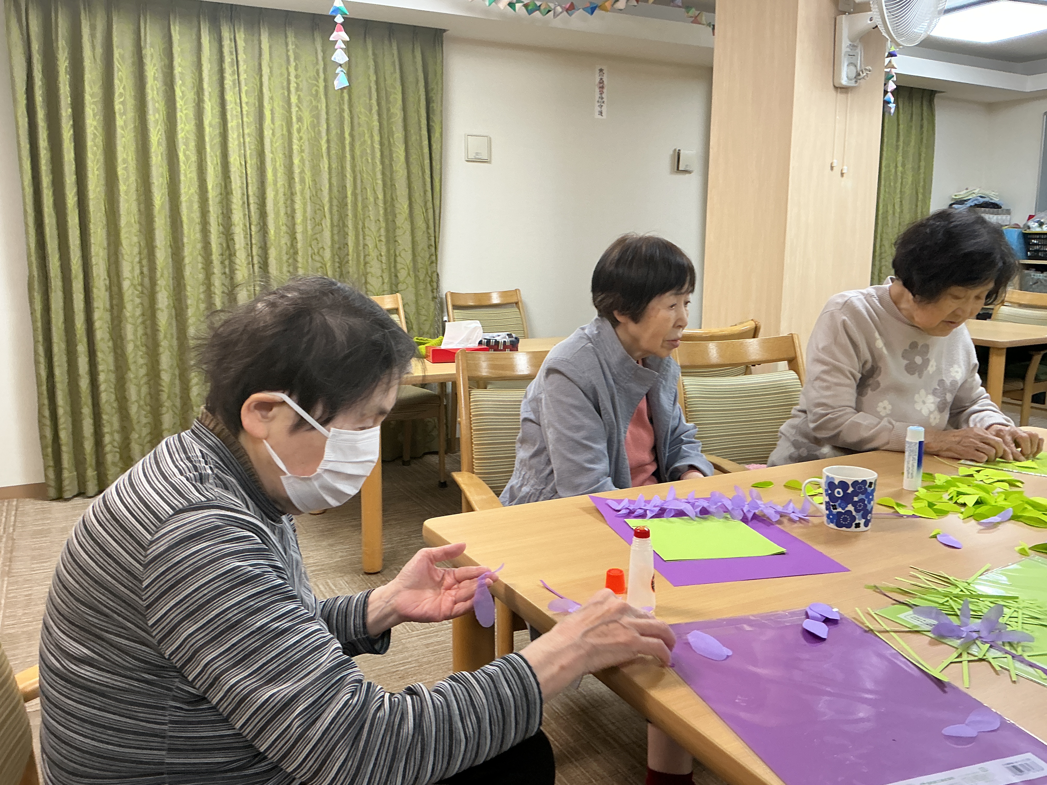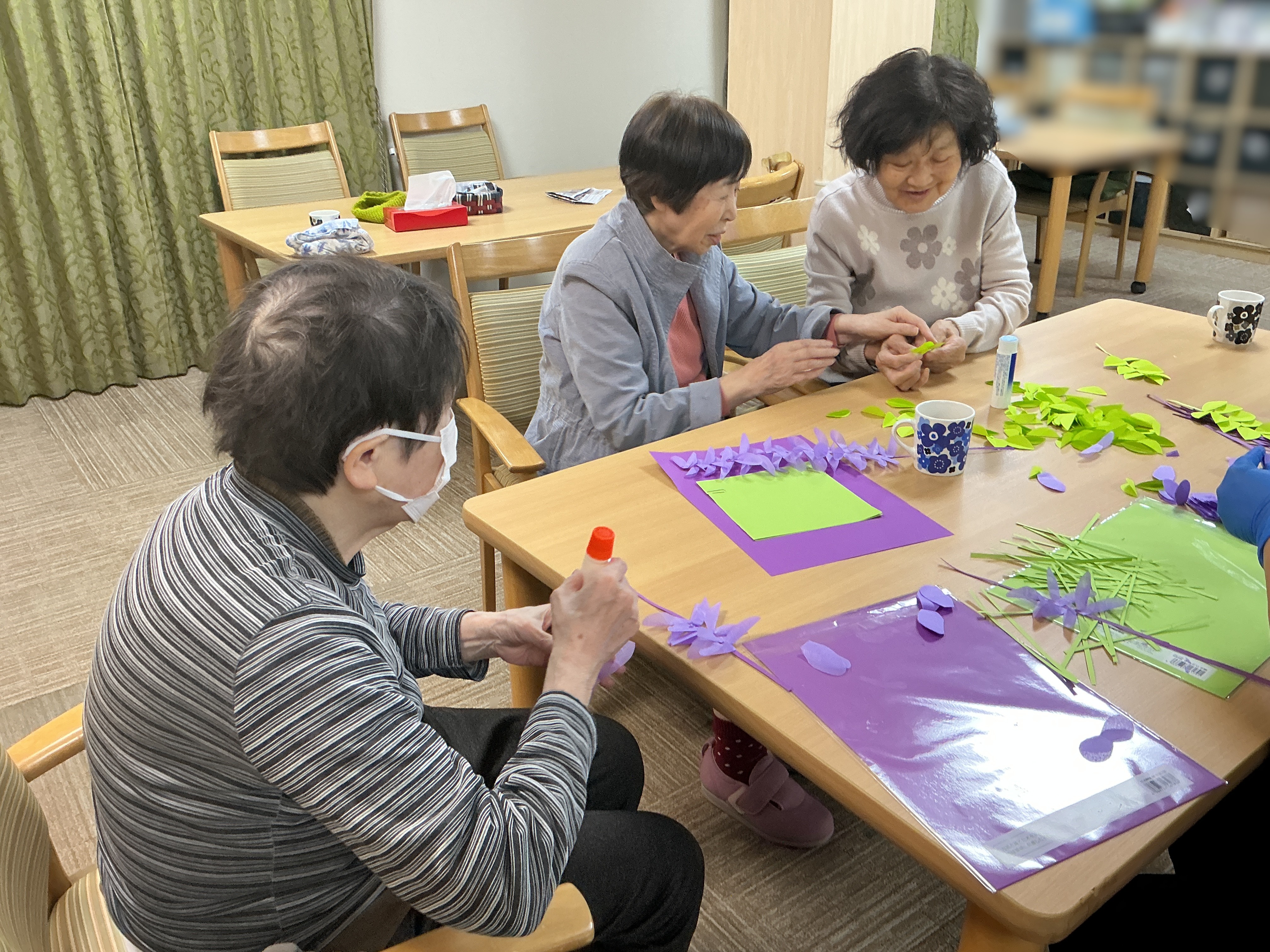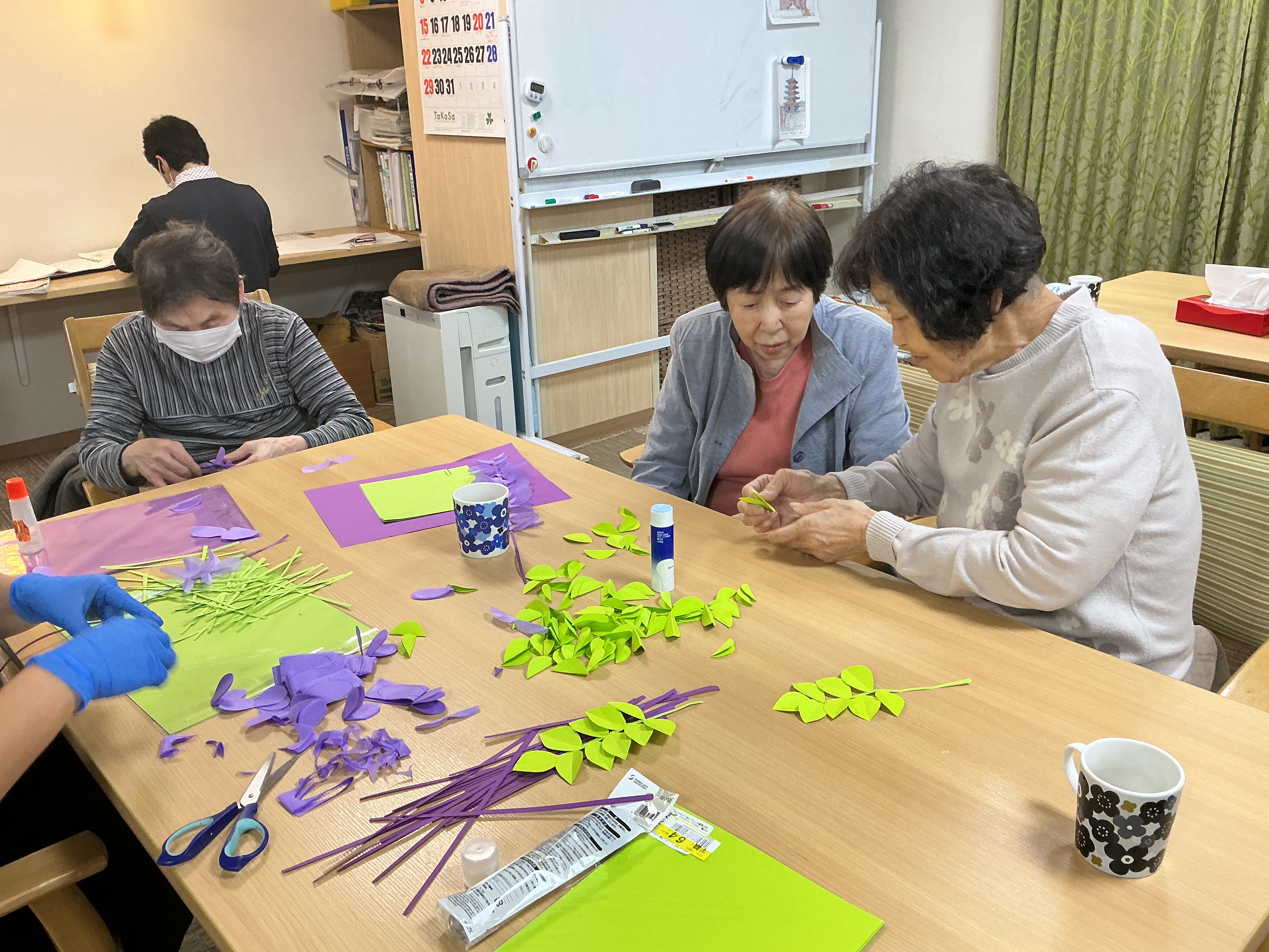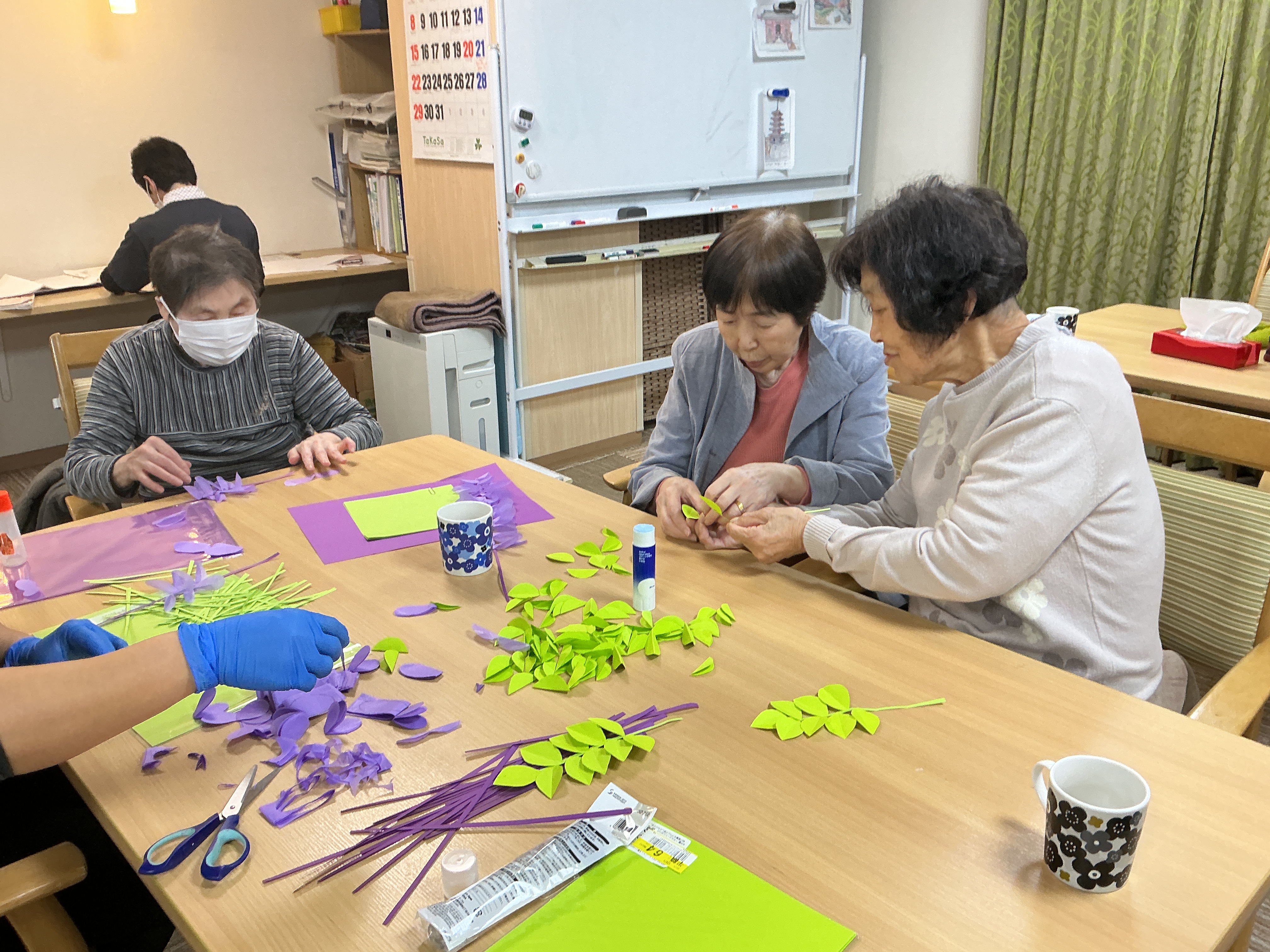 藤の花の飾り物を作成している風景をご紹介します! 宿泊される皆さんが、就寝される前に職員と一緒に作成中~ 花弁や葉が綺麗に切られており、とても細かな箇所まで丁寧に作られています…😐