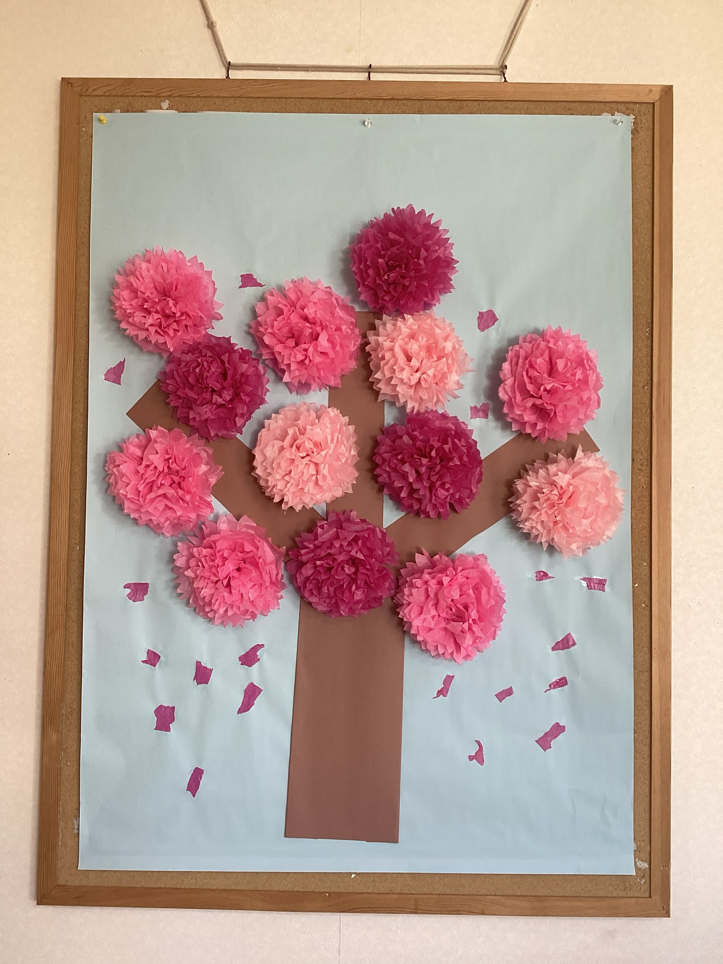 皆さんと桜の花飾りを作りました。 薄い色紙をゆっくりめくっておられました。 皆さんが作った飾りを集めて桜の壁紙にしました。