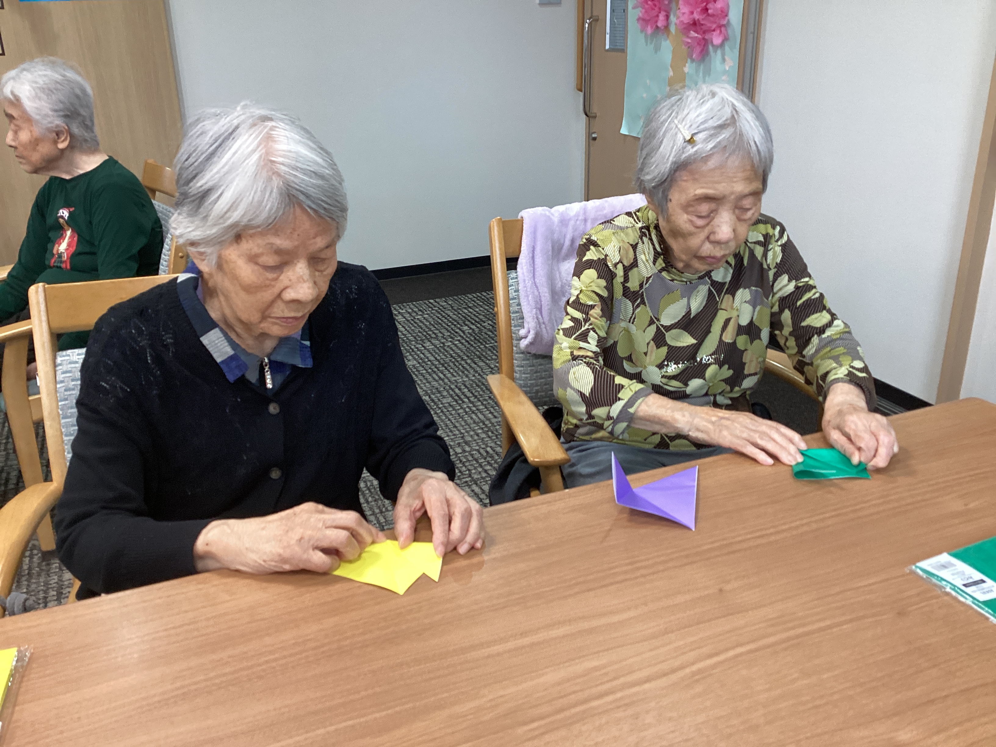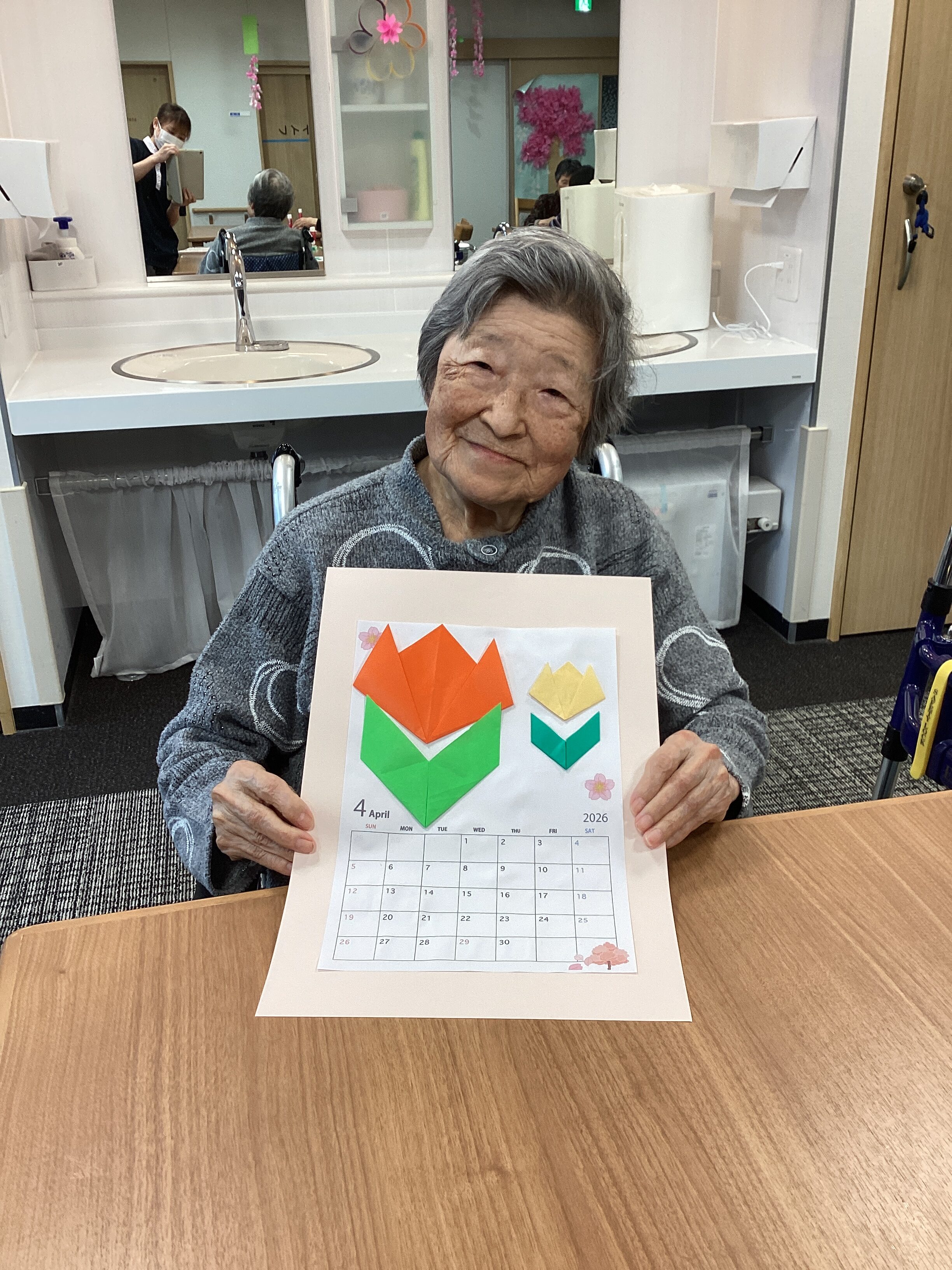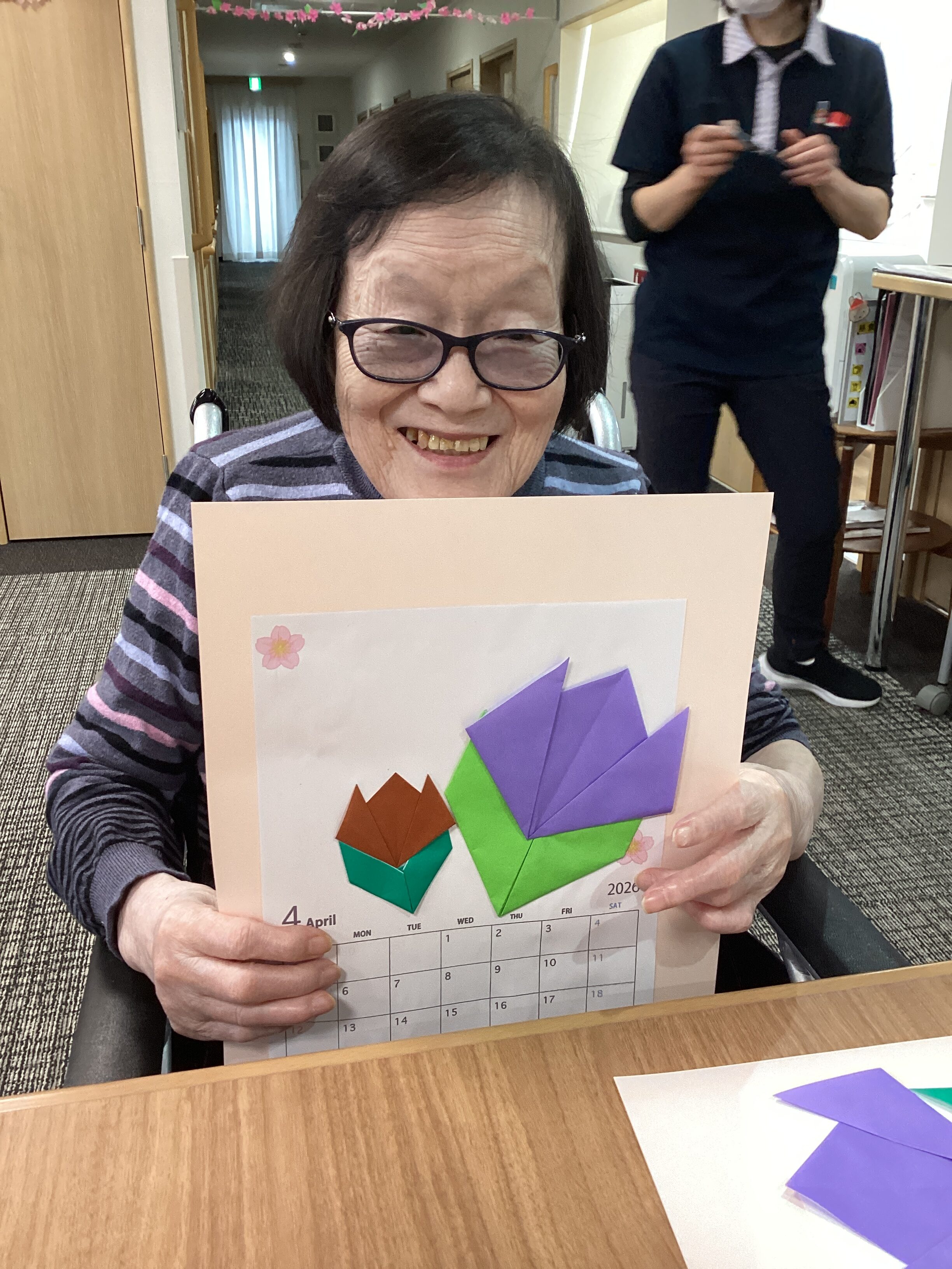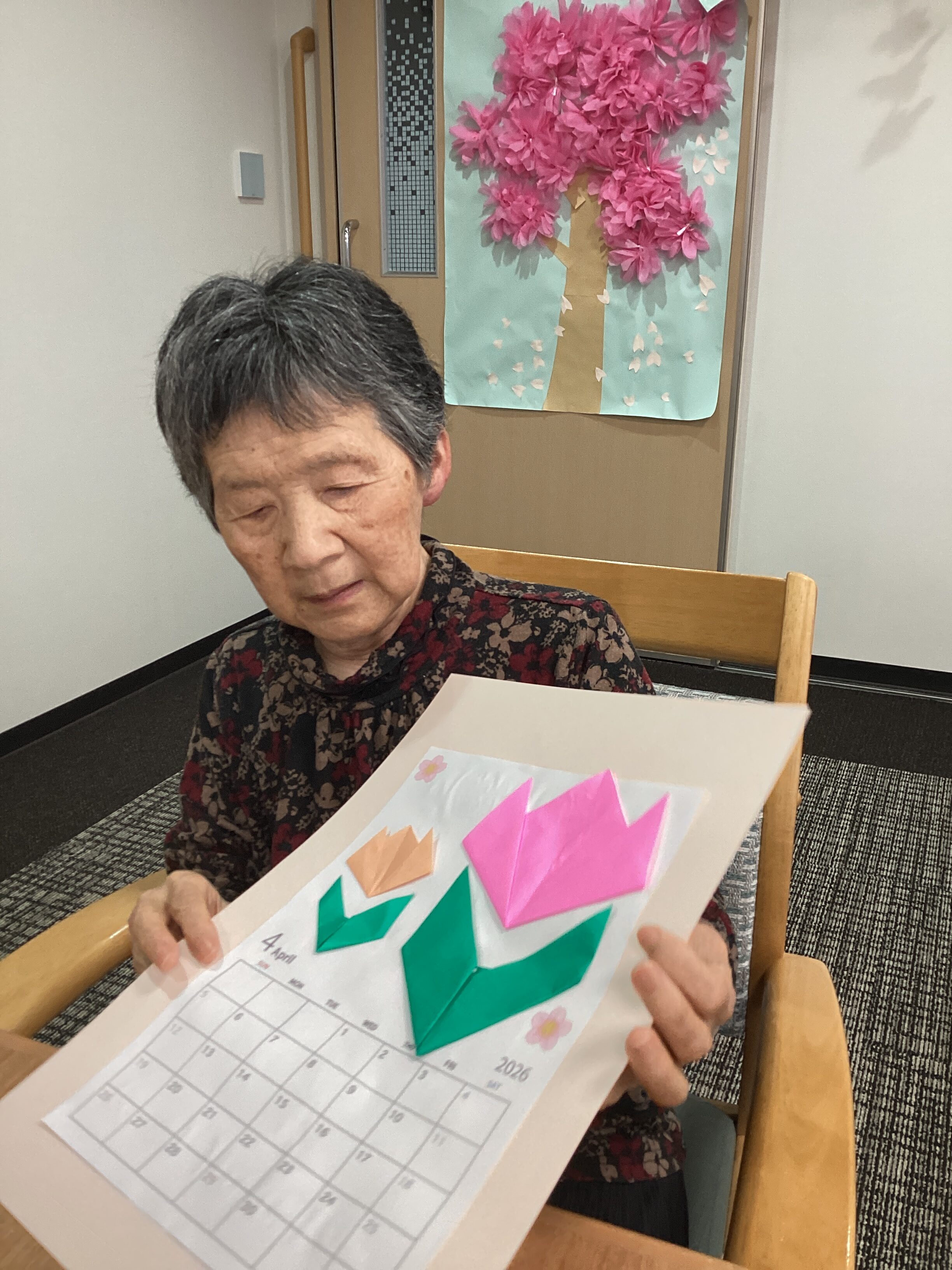 4月のカレンダーを作りました! 好きな色の折り紙でチューリップを作り、飾り付けました。 カラフルで素敵に仕上がりました😊