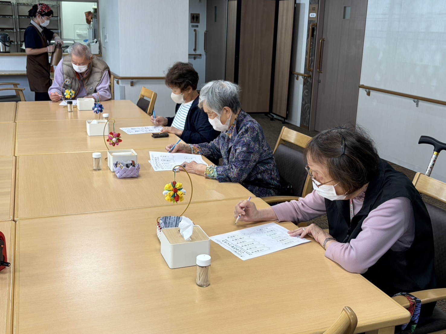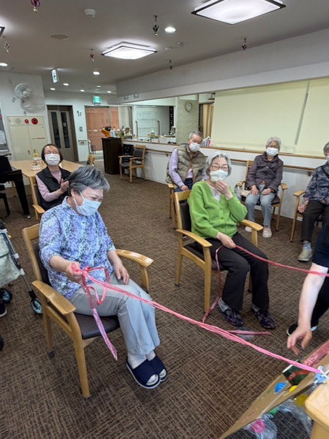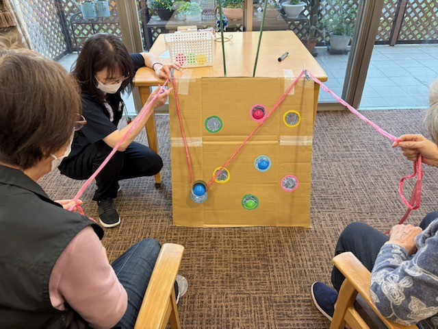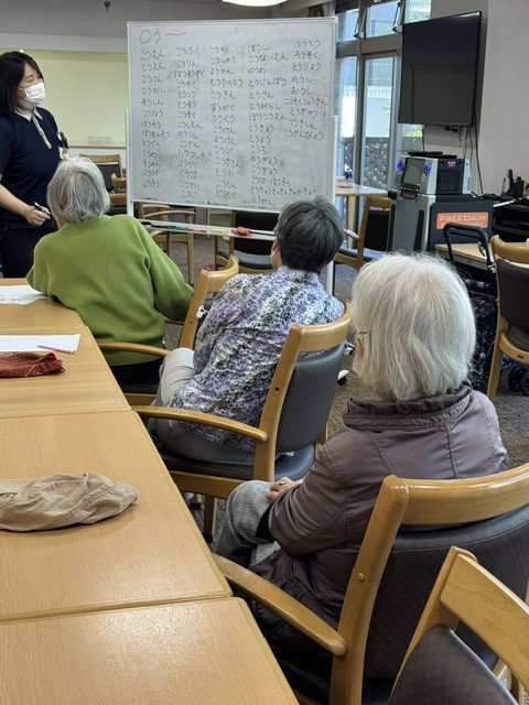まずは脳トレプリントでウォーミングアップ。次はホワイトボードを使って、2番目に『う』の付く言葉を出し合います。皆で知恵を絞れば沢山出てきますね!最後は手作りのゲームで体を動かします。「はいれ~」と念を送る姿に一同大爆笑!楽しいひとときでした。