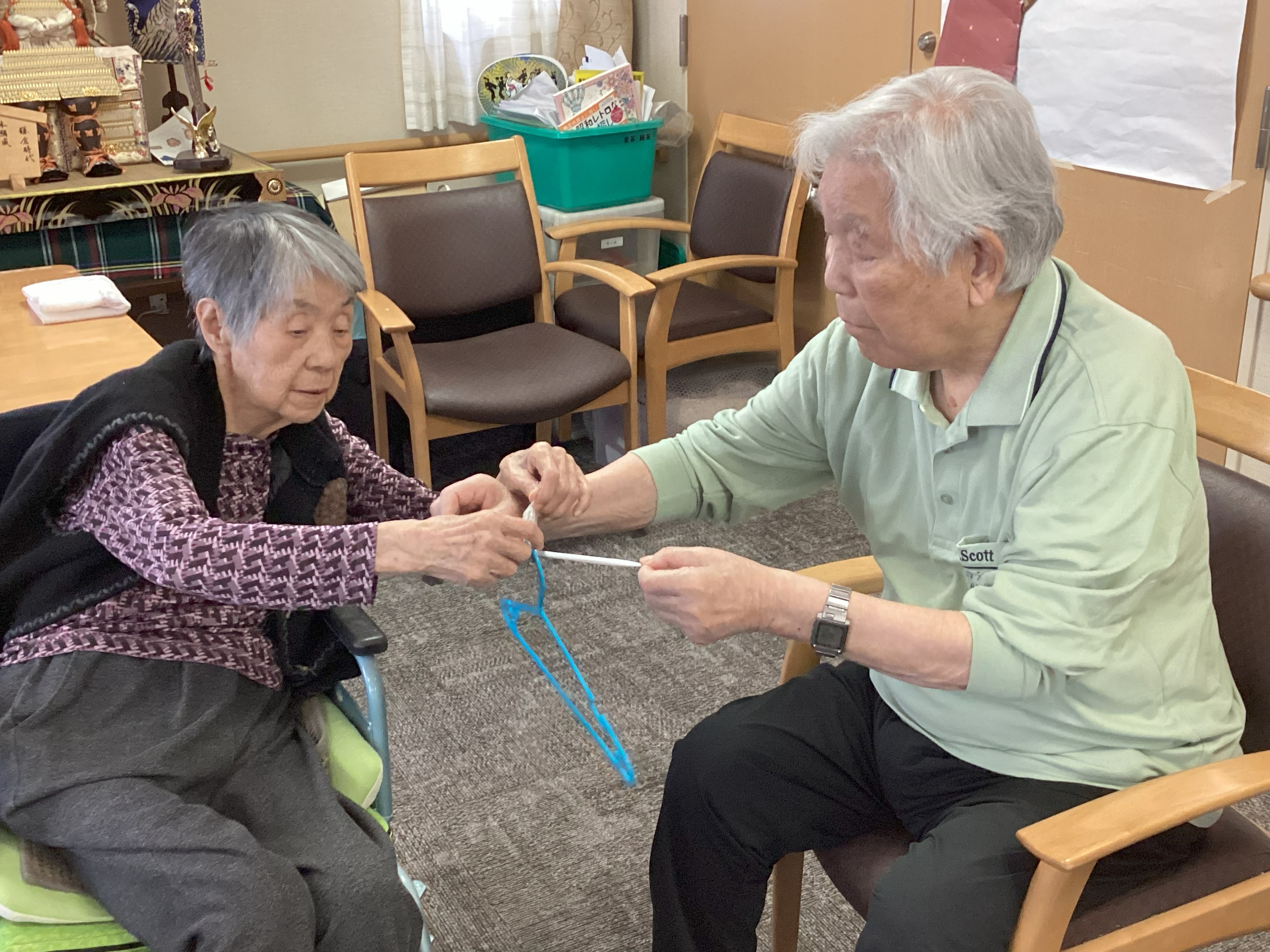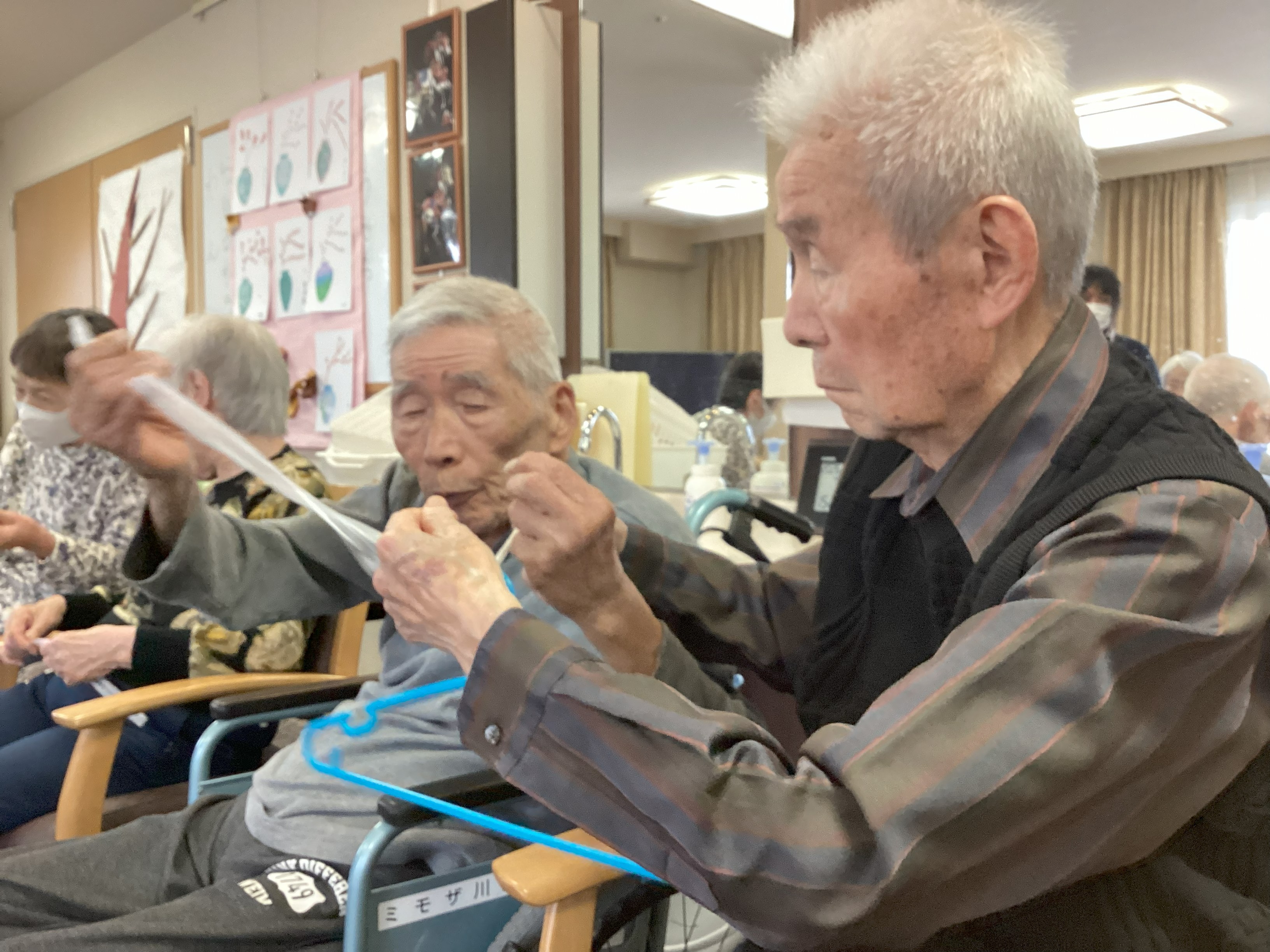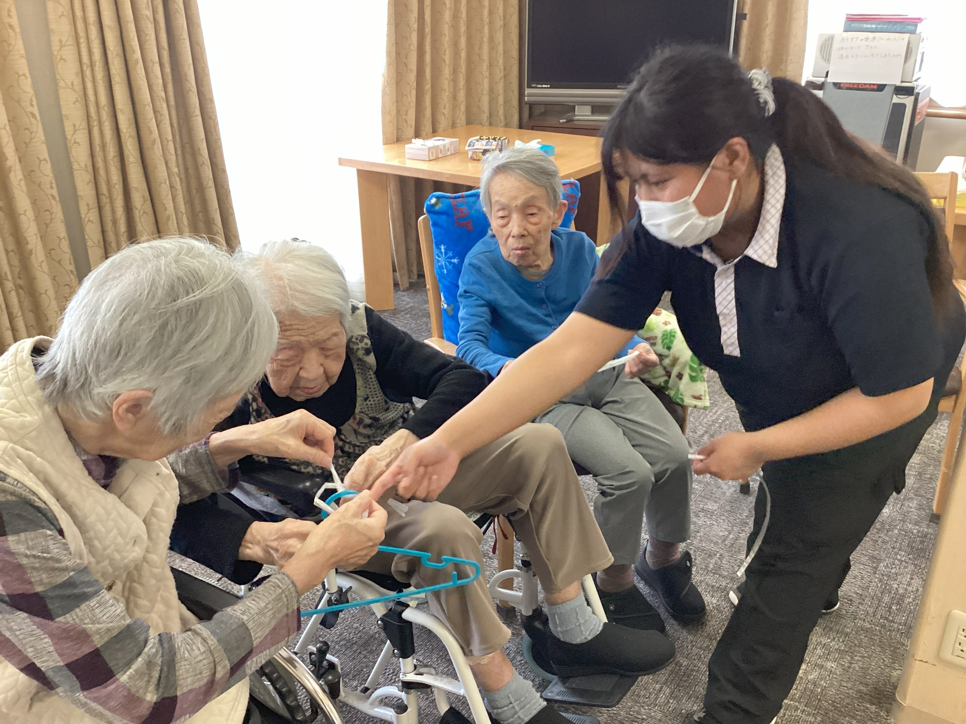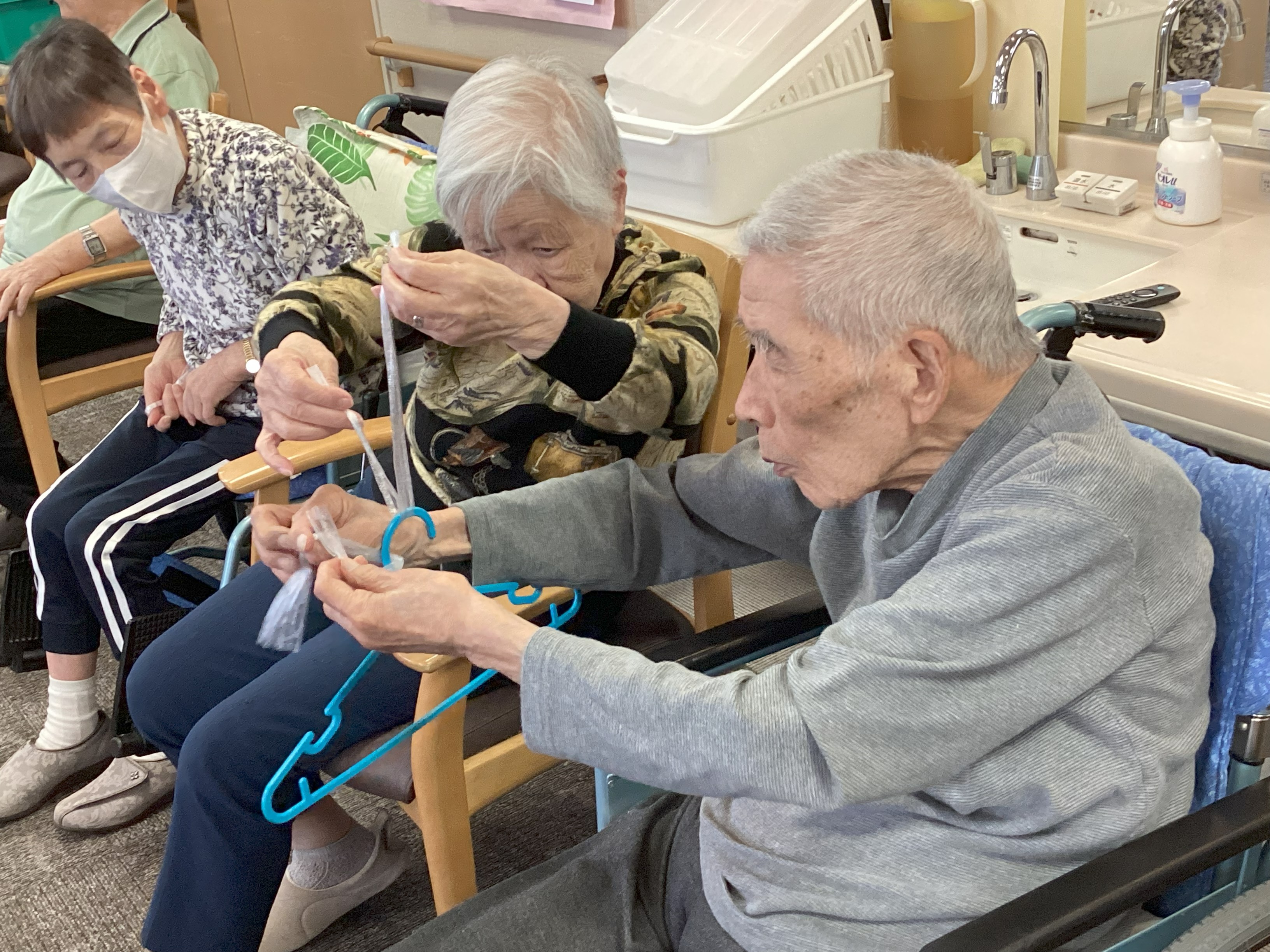 ハンガーとビニールテープでの機能訓練レクリエーション。皆様、真剣な顔と笑顔で取り組めました(#^^#)何気ない動作も、ゲーム感覚で楽しめるのが良いですね。