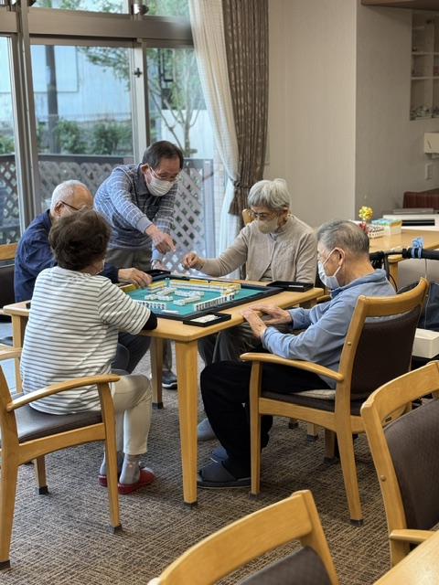 始めての方も入って「豚のしっぽ」です。賑やかな笑い声が聞こえてきました。 お隣のスペースでは麻雀です。「今日は●●さんの一人勝ちだよ」と楽しまれていました。