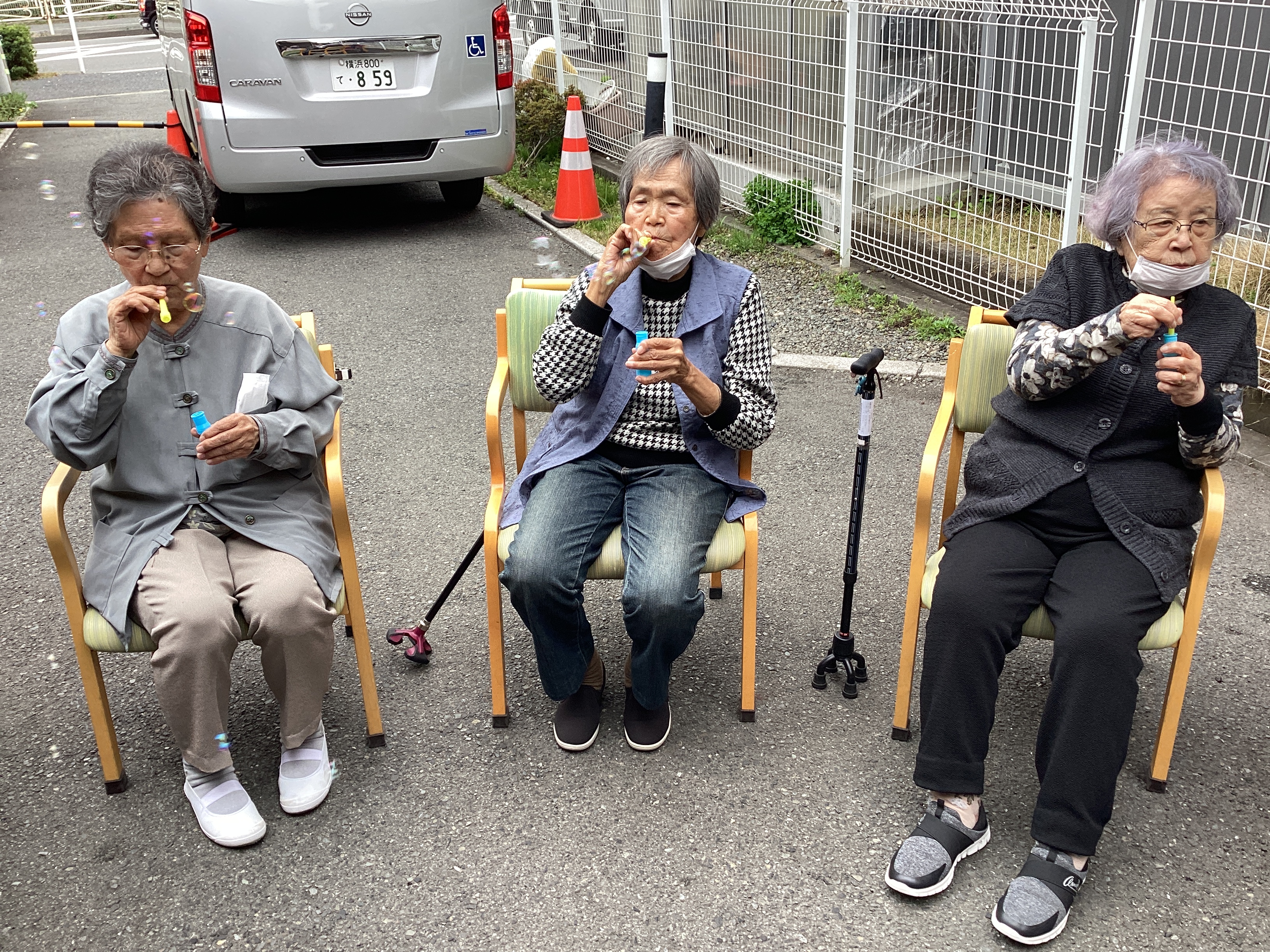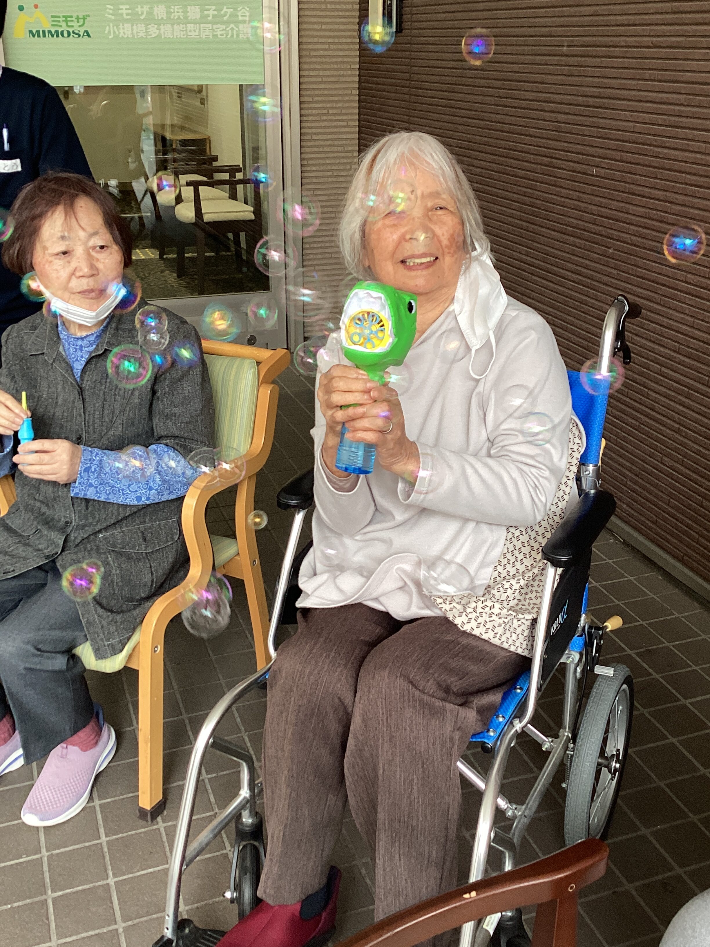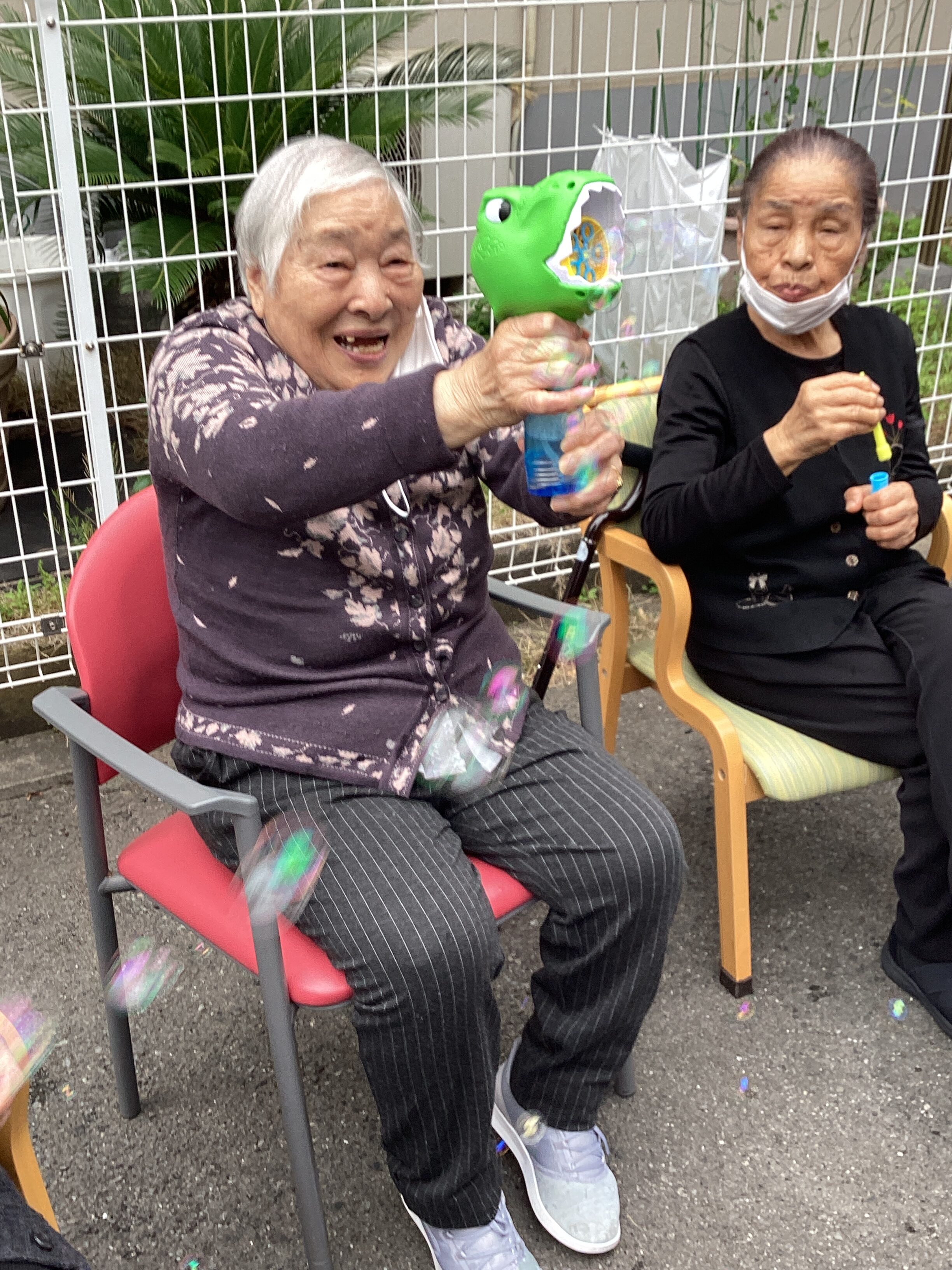 シャボン玉いっぱい作る職員に皆さん大笑い!「きれいねー」と・・・