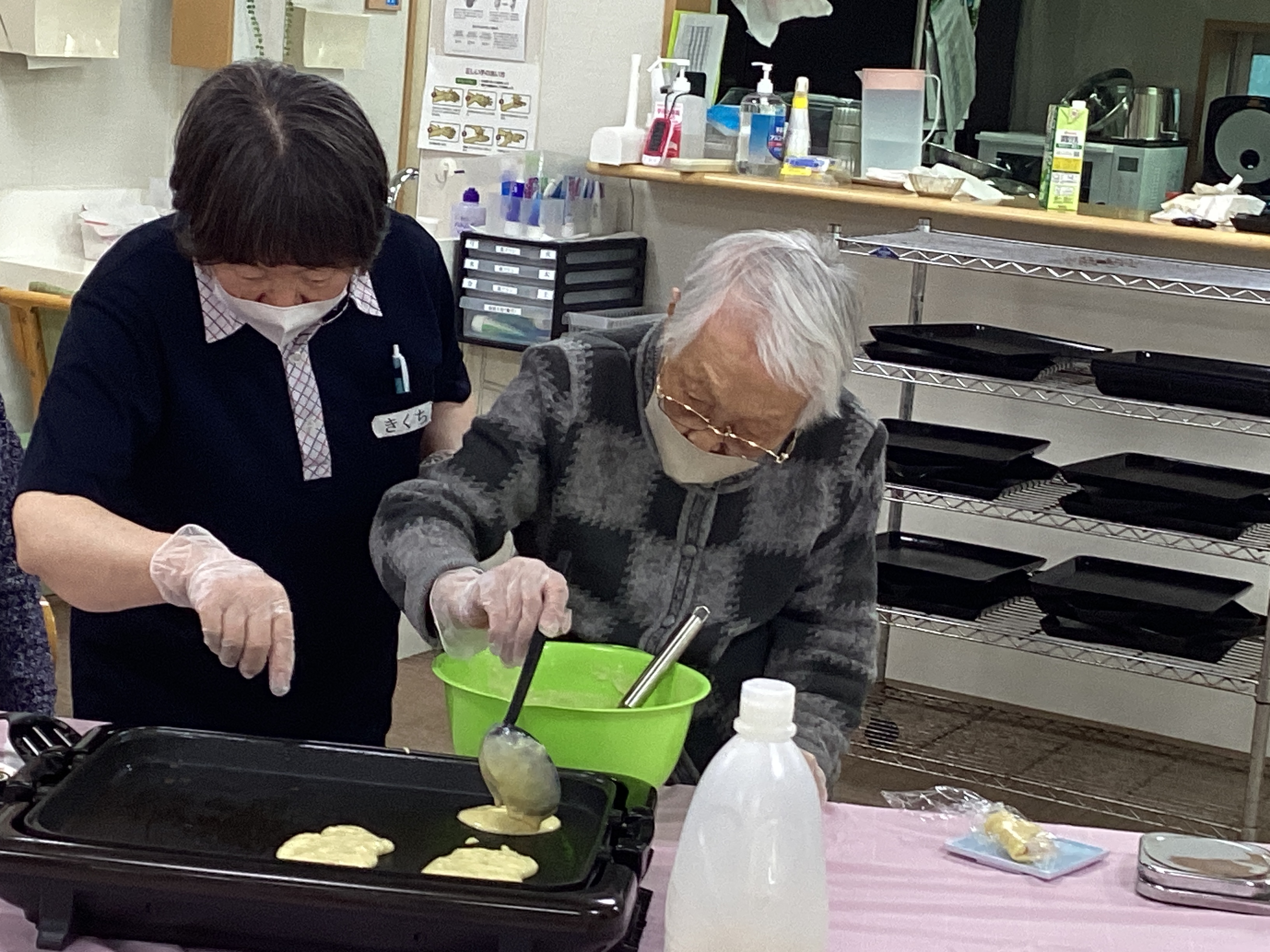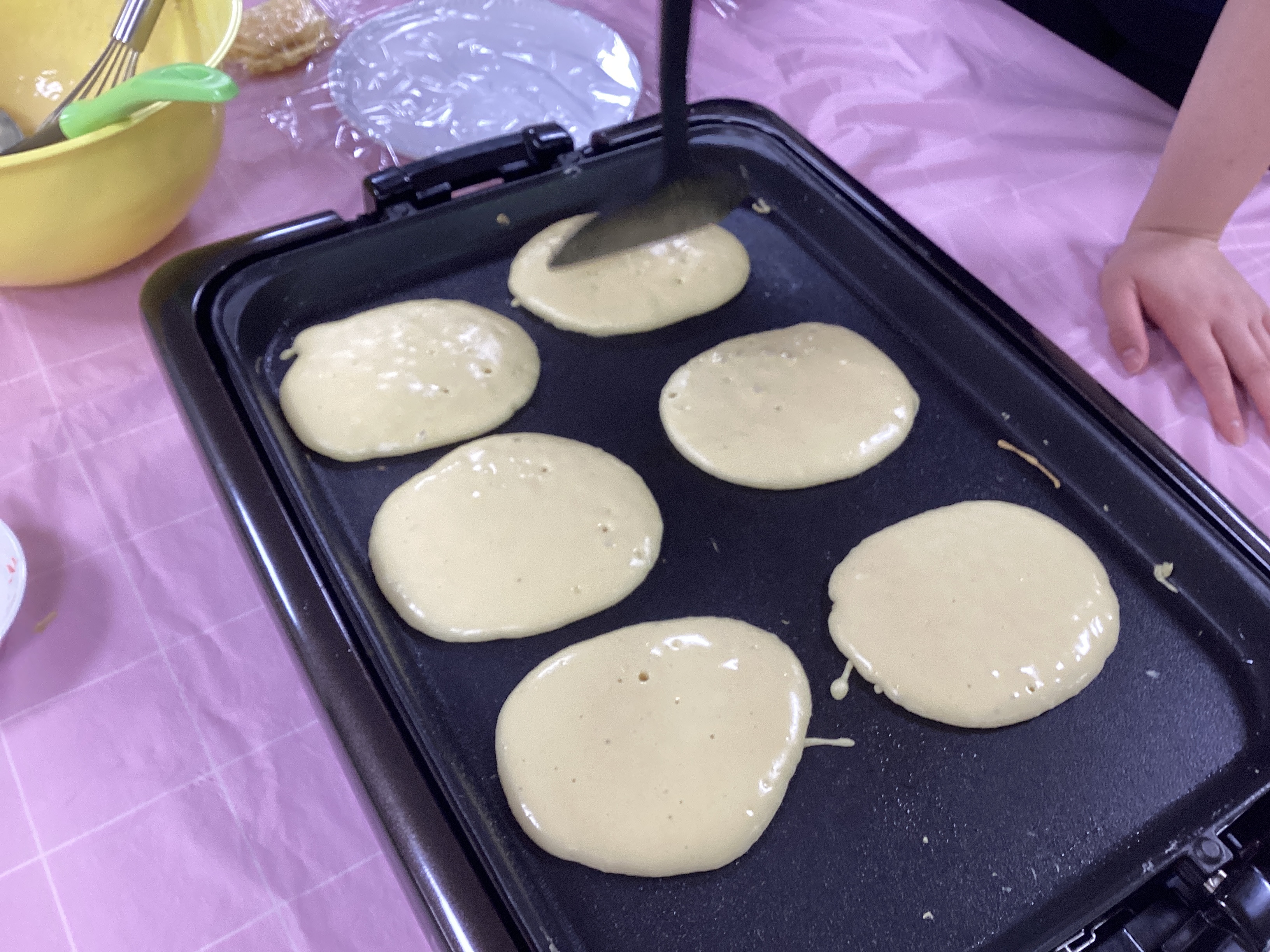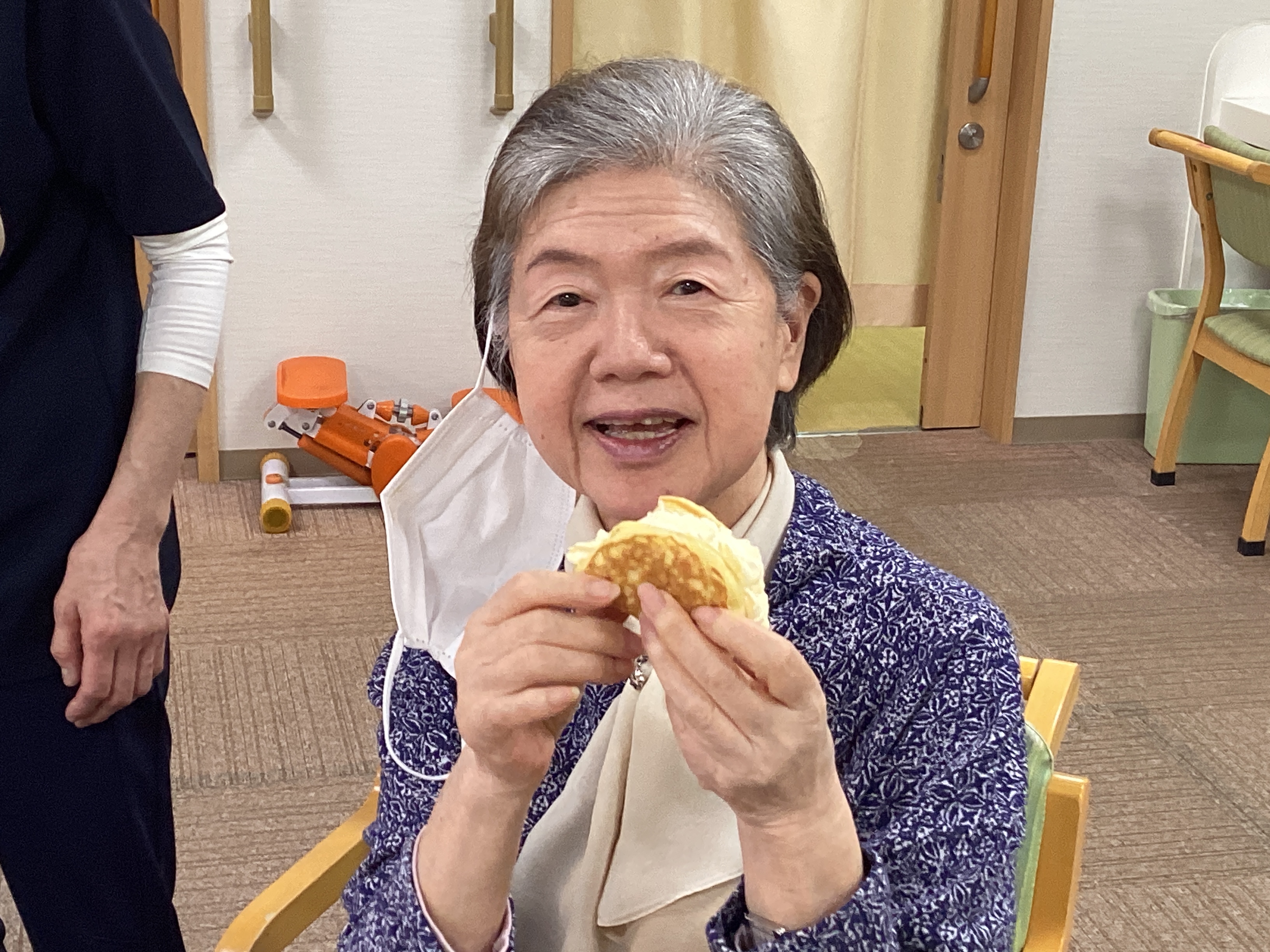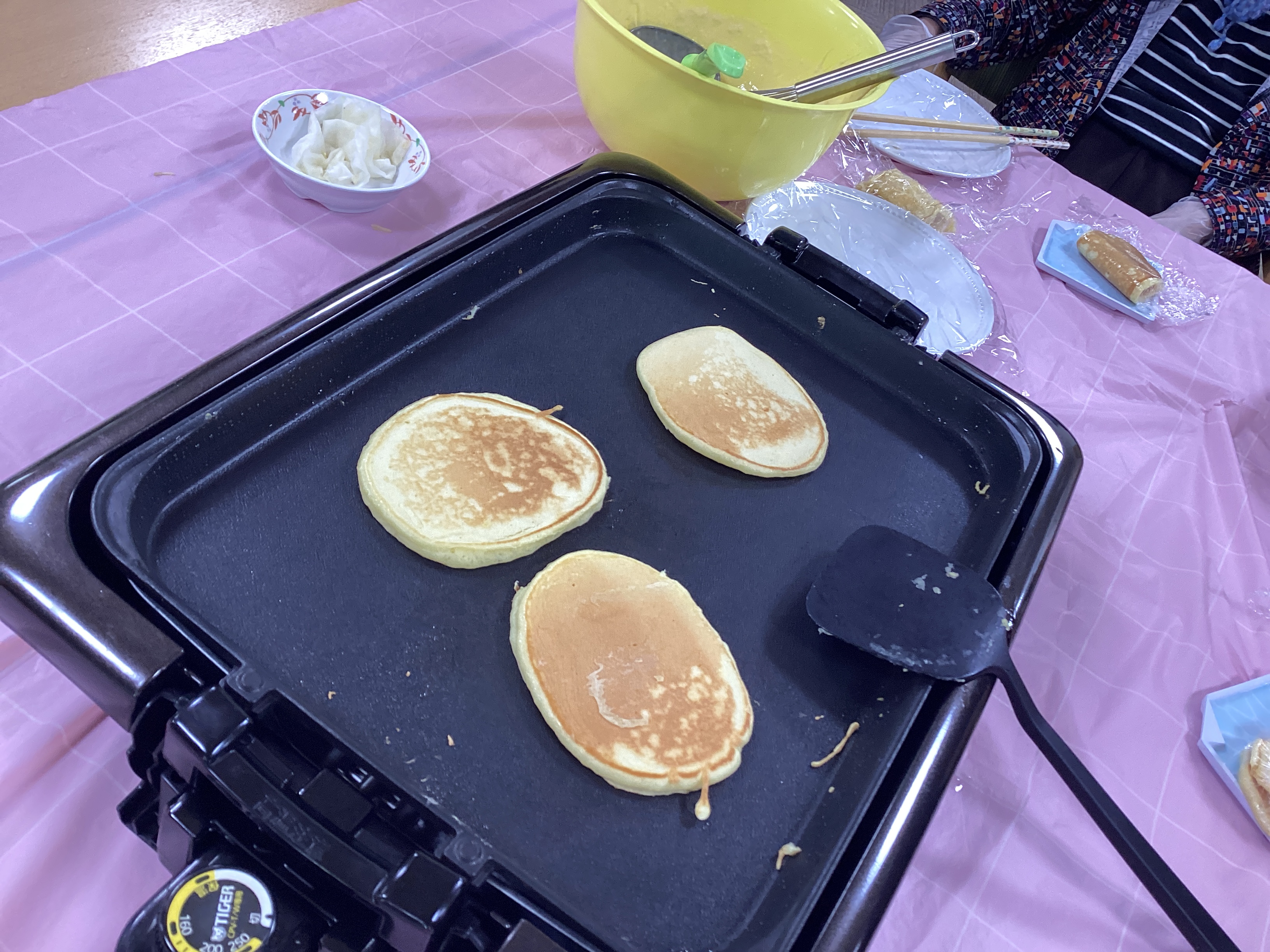 ワッフルにカスタードを包みました⭐ ふわふわに焼きあがってクリームをタップリいれて一口食べるとあふれてしまいます💦 皆さんいっぱいクリームをいれてご満悦でした❣