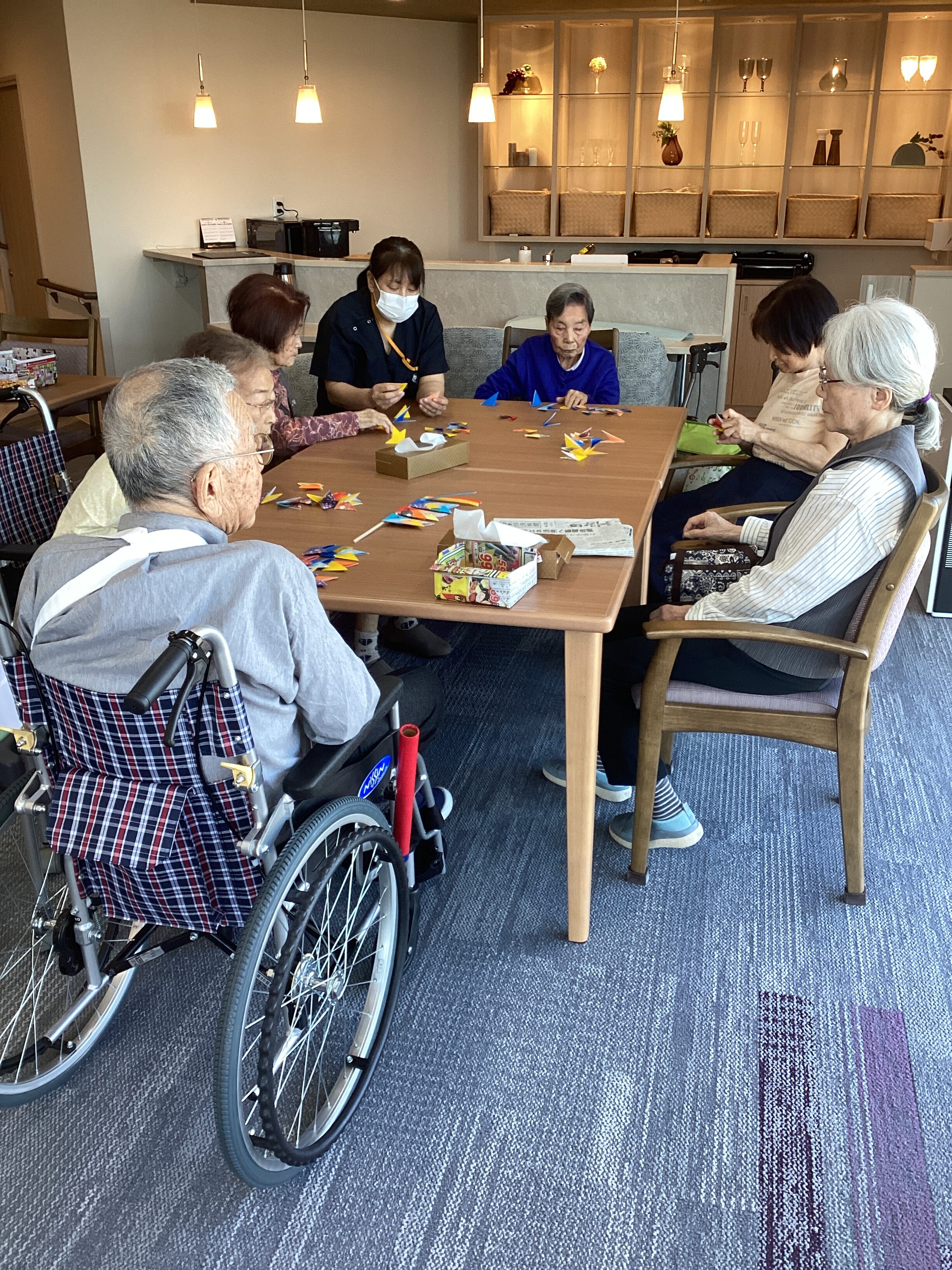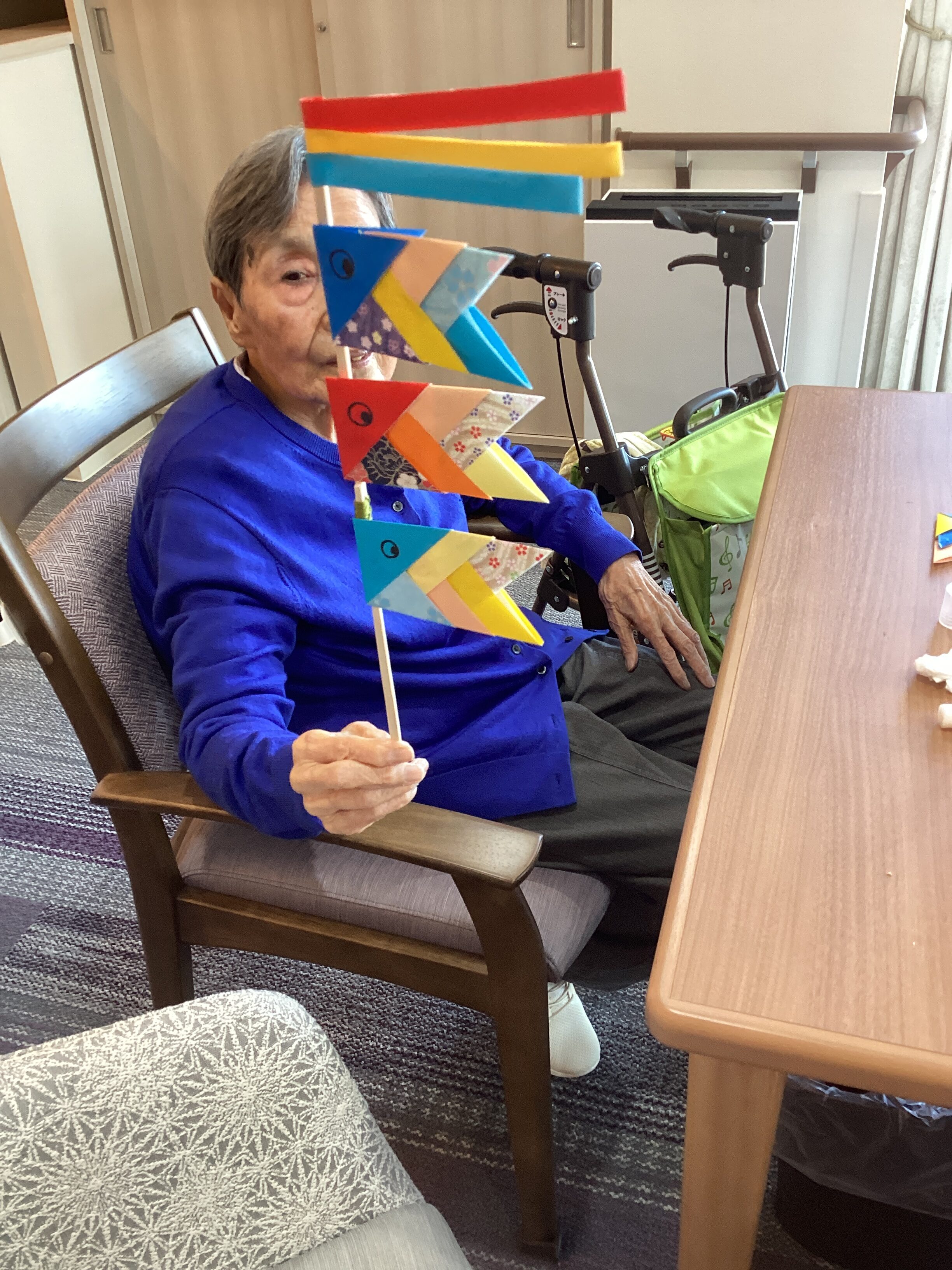 テーブルを囲んで鯉のぼり作成🎵「子供の頃どんな遊びをされていましたか?」「まあ、もうそんな季節になったのね」「私の小さな時は・・・」と子供の頃よく遊んだことをお話ししてくださいました🎏