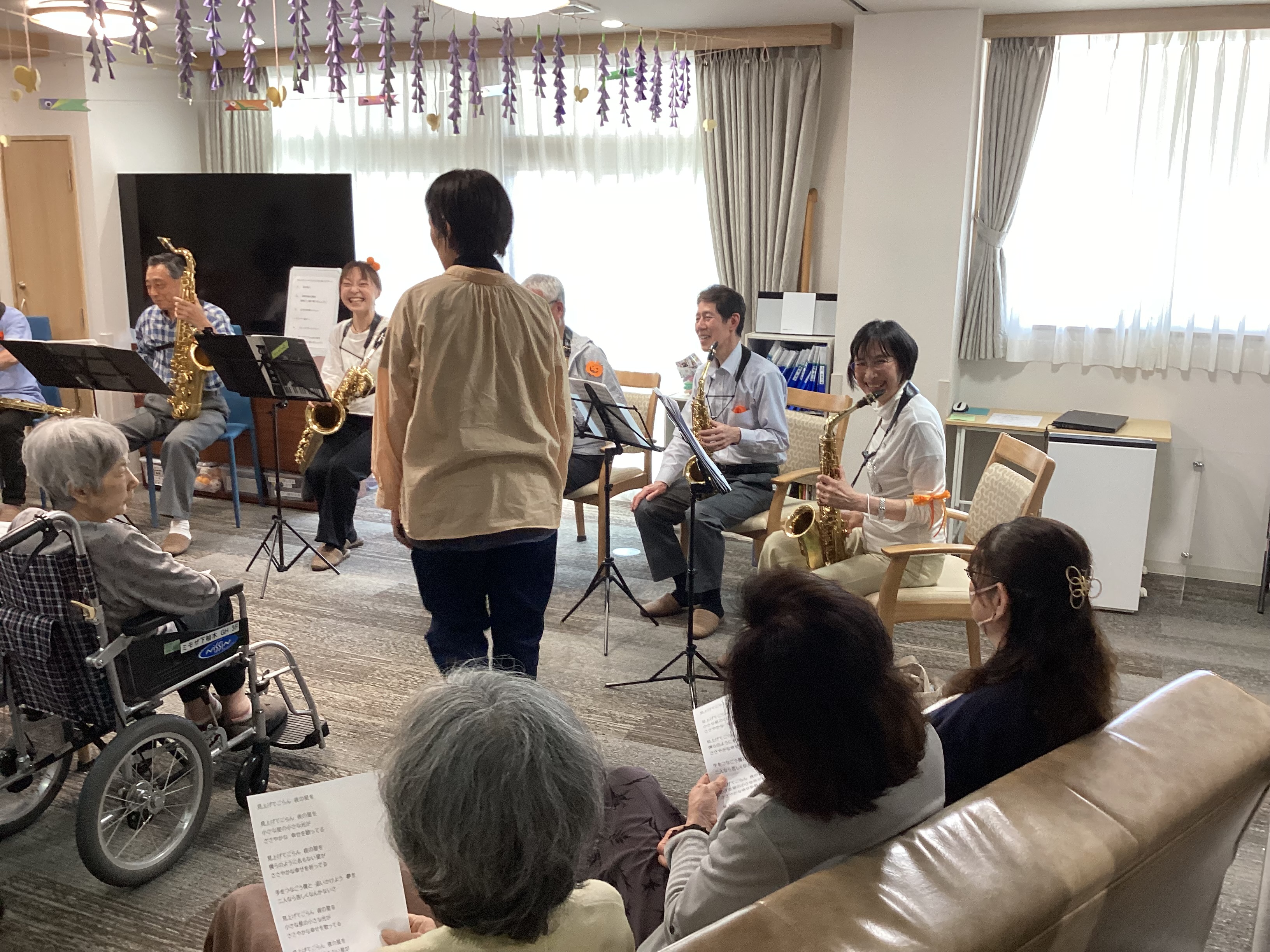 オレンジノートアンサンブルさんによる定期演奏会が開かれました。花は咲く・色々なメドレー・見上げてごらん夜の星を等やメンバーの皆様とサックスの紹介をしていただきました。演奏を聴いたり、一緒に歌ったり…和やかで素敵な演奏会でした!また来てください!