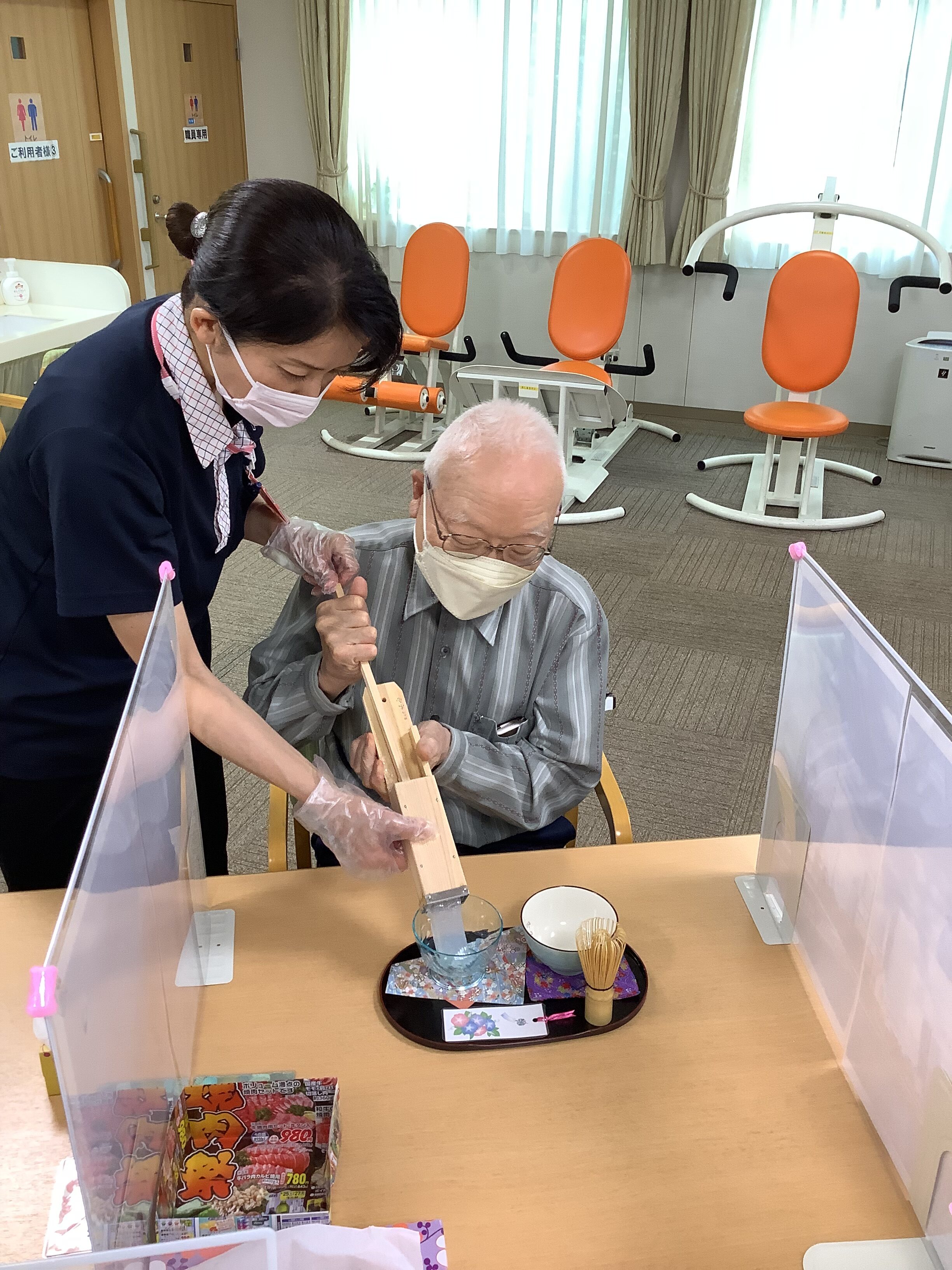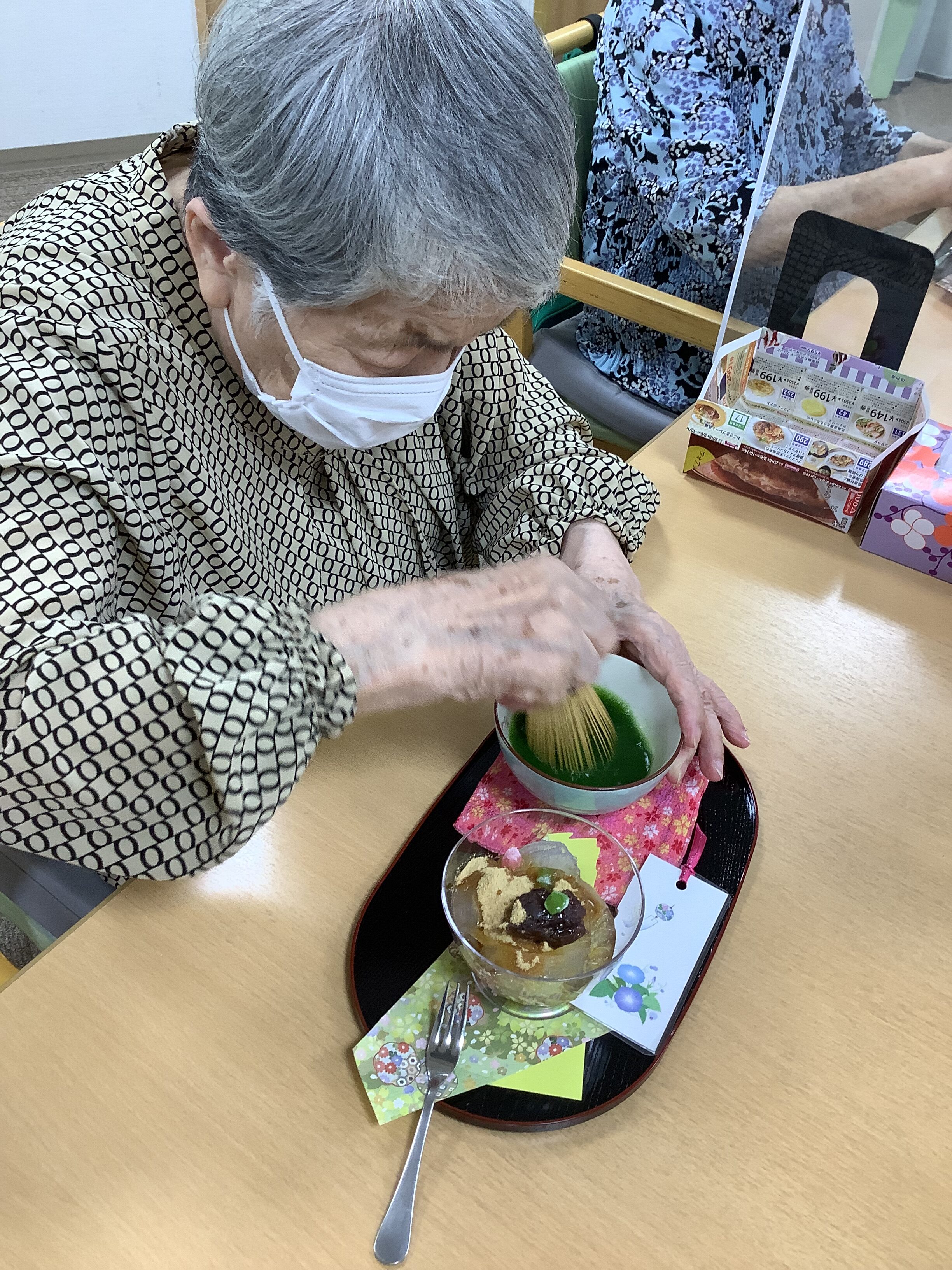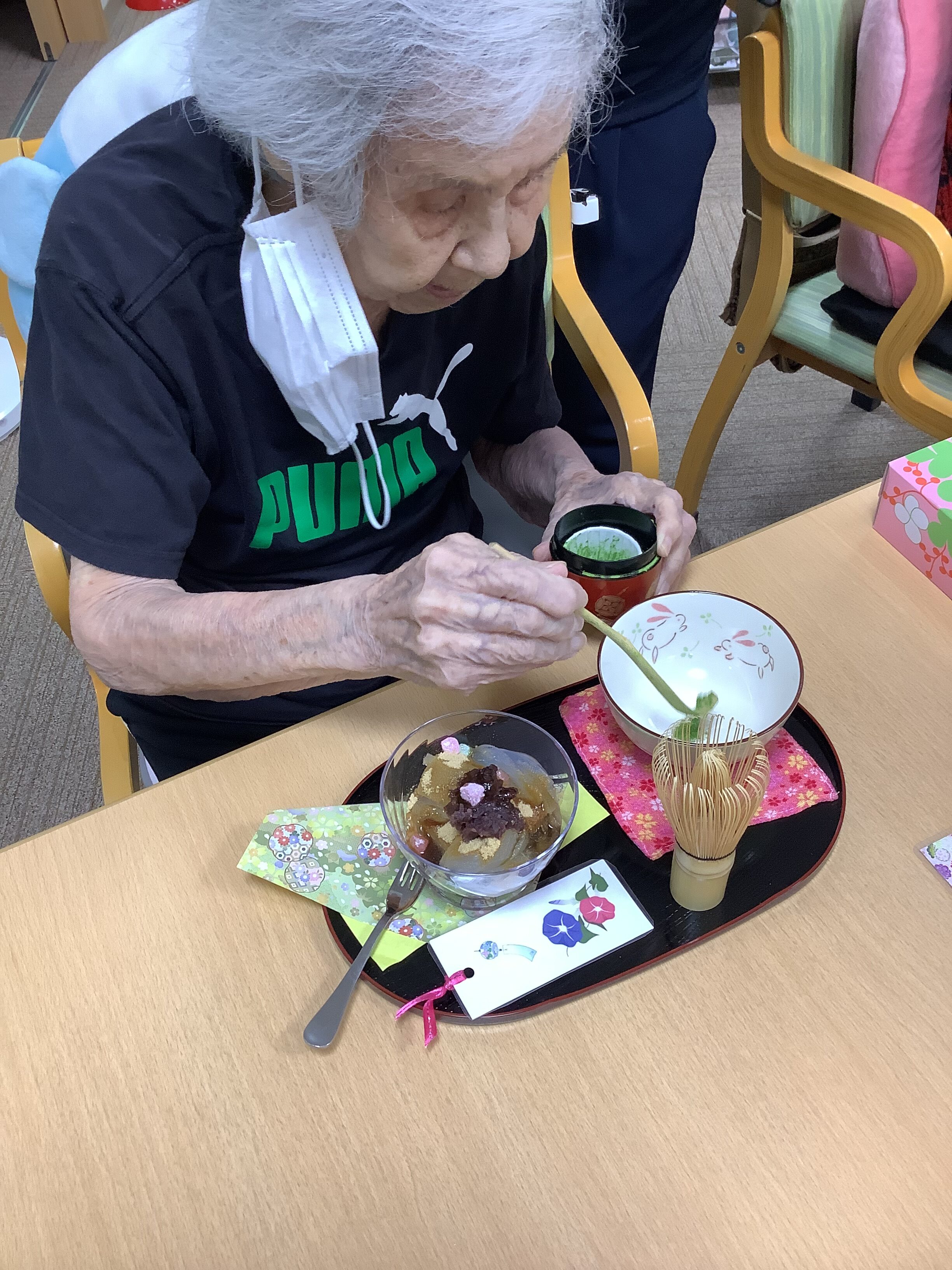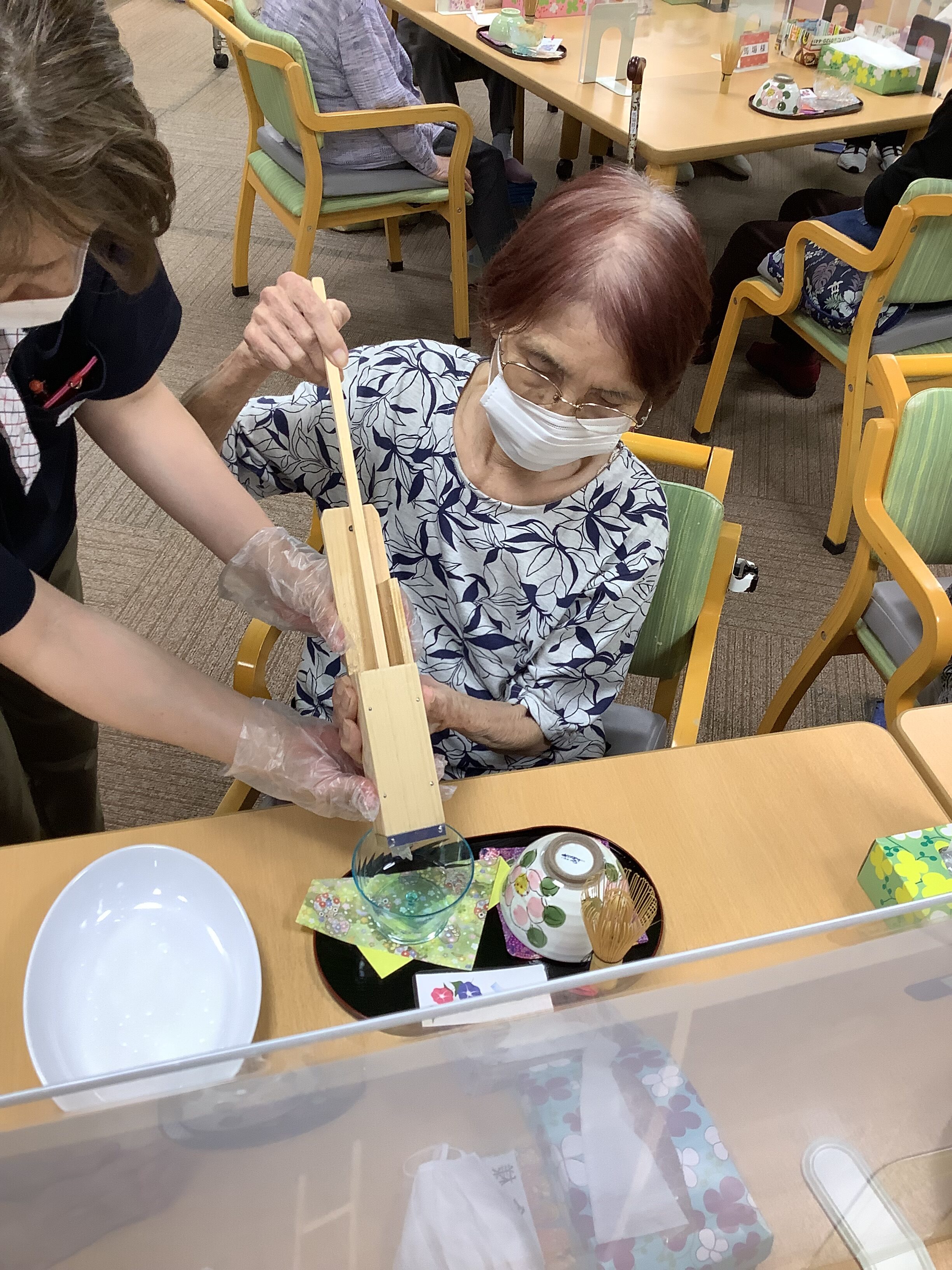 今日のイベントは「お茶会🍵」でした。お抹茶と茶菓子にはところてん。きな粉・黒蜜をかけたらあんこと求肥をのせて甘~いところてんの出来上がりです。『甘~い』『またやって欲しい』と言うお声も頂きました。