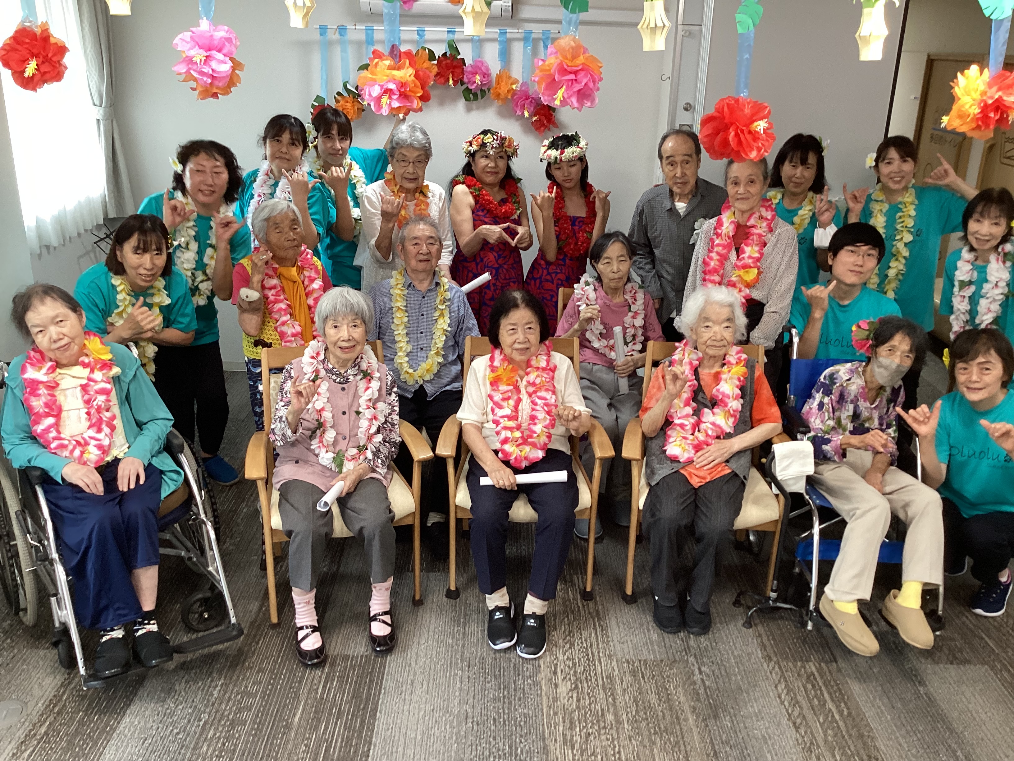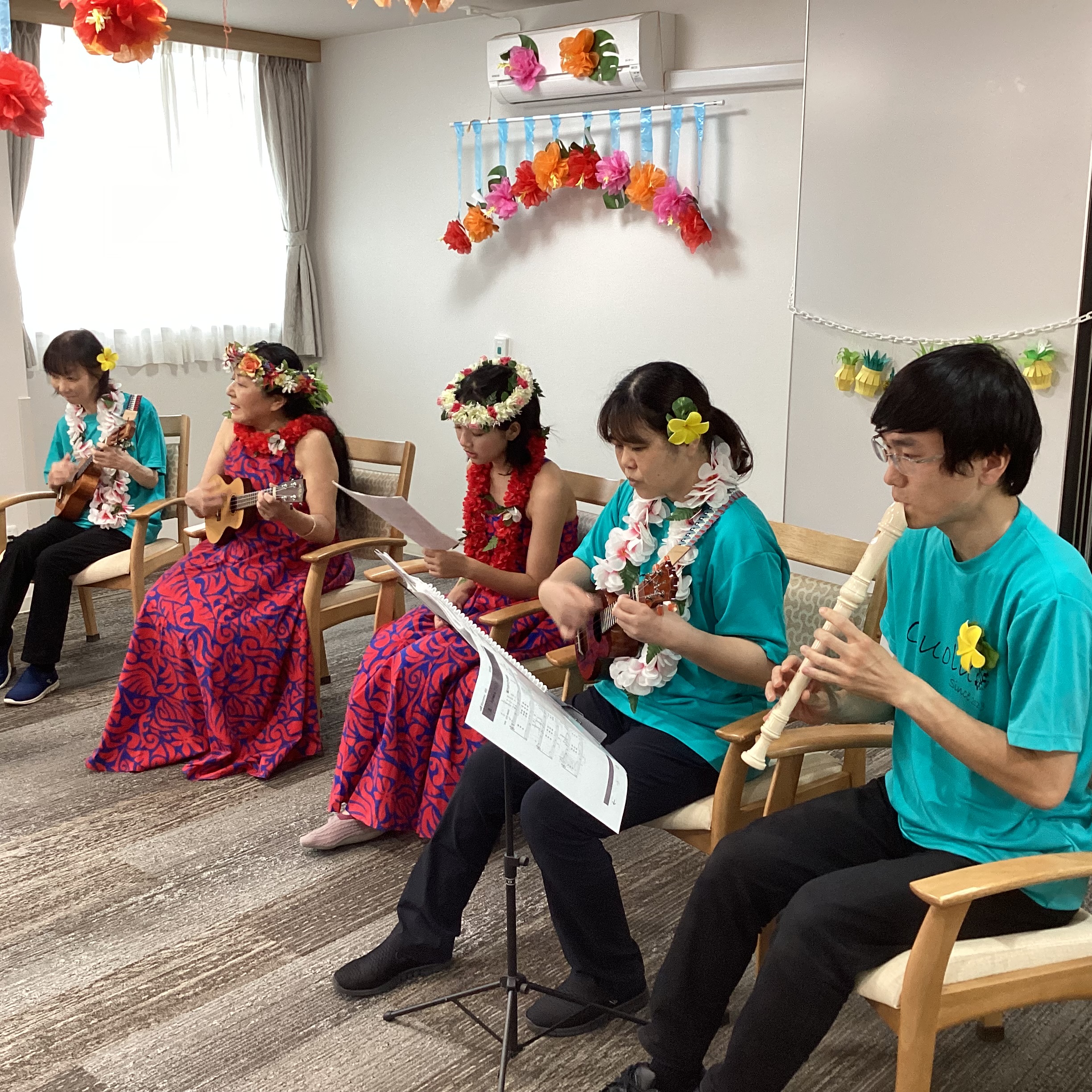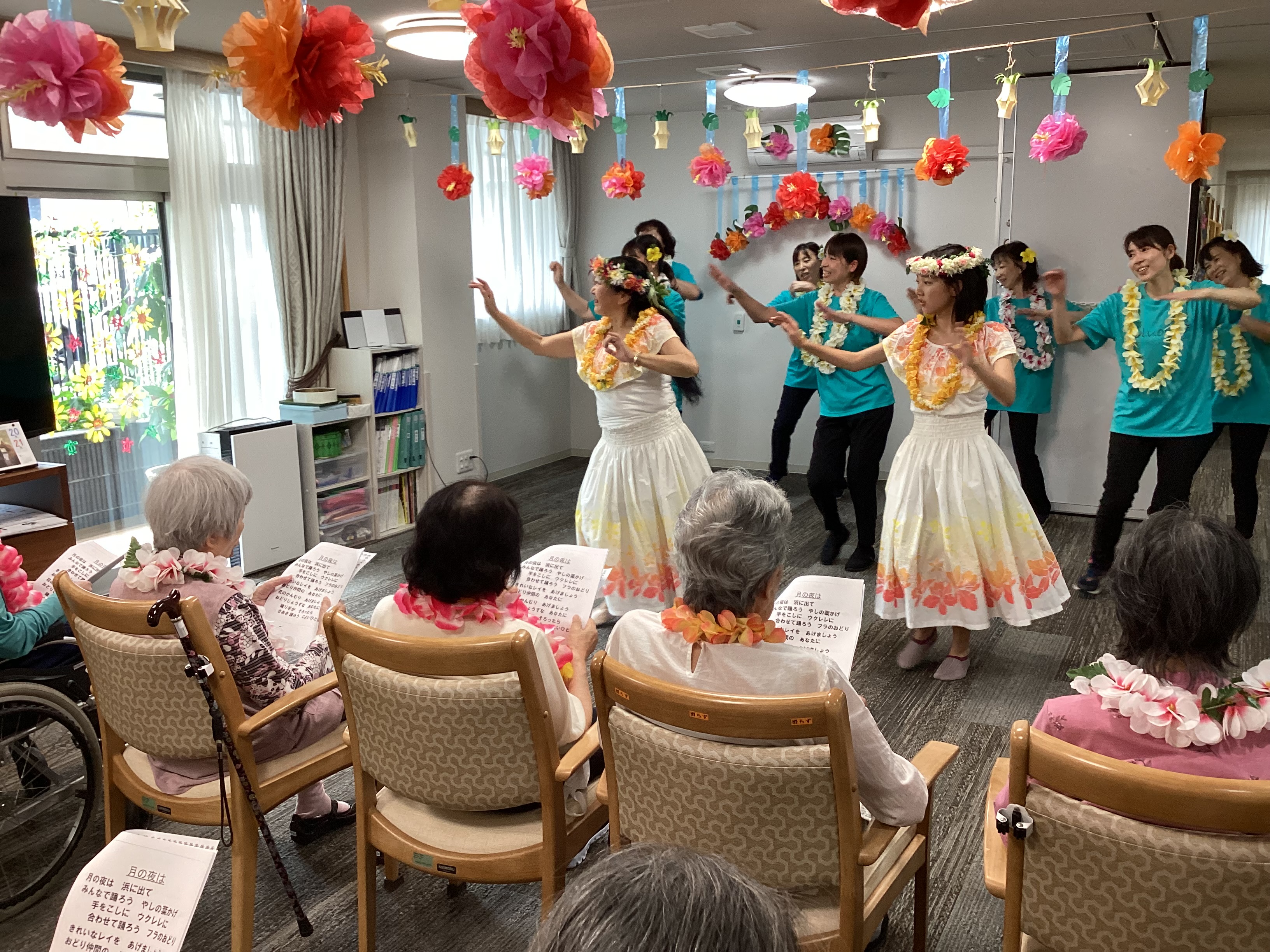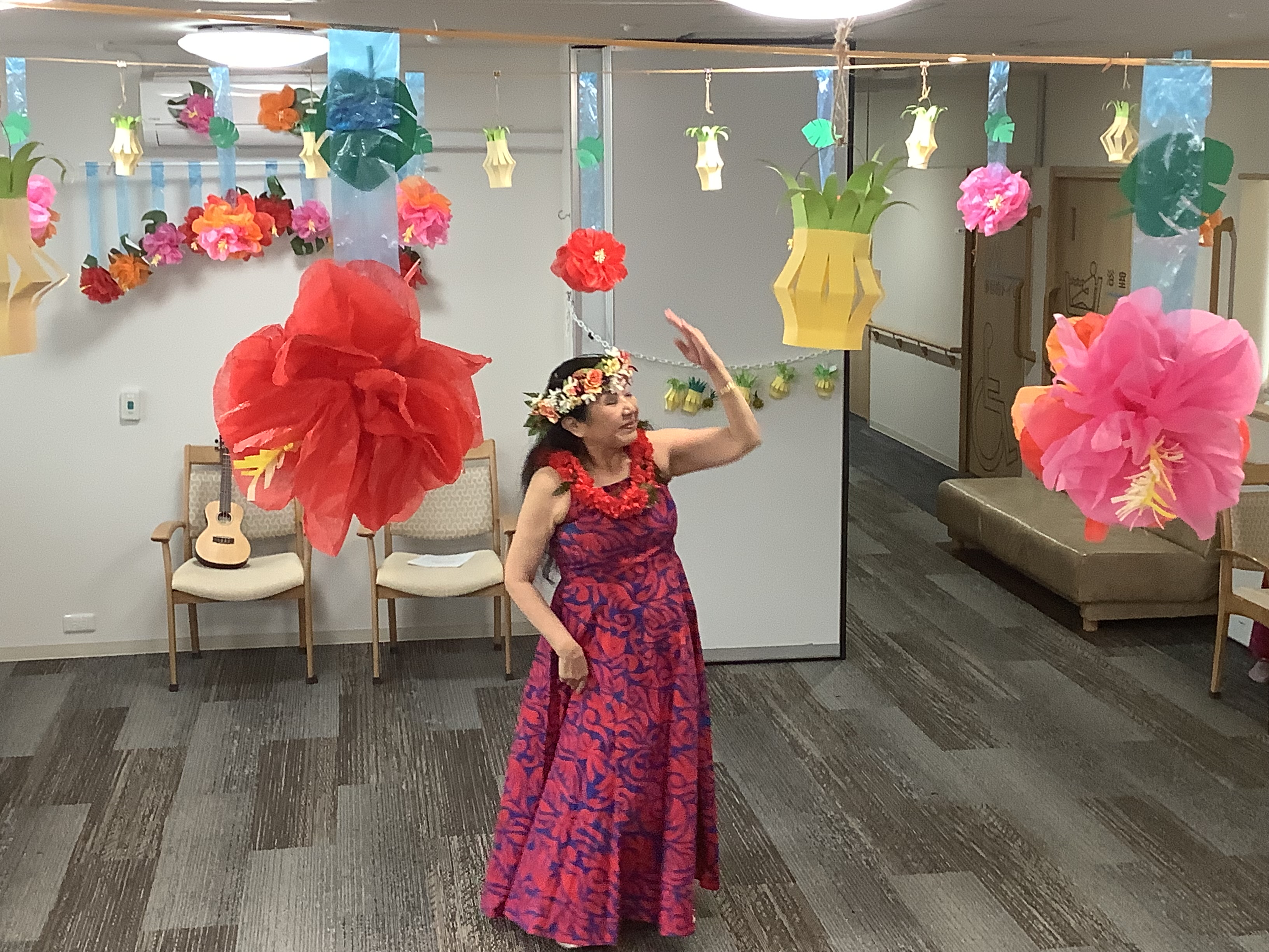 フラダンスの先生方をお招きしてフラダンスの鑑賞や演奏に合わせて歌を歌いました。フラダンスはとても優雅でした。歌は皆様で盛り上がりました。