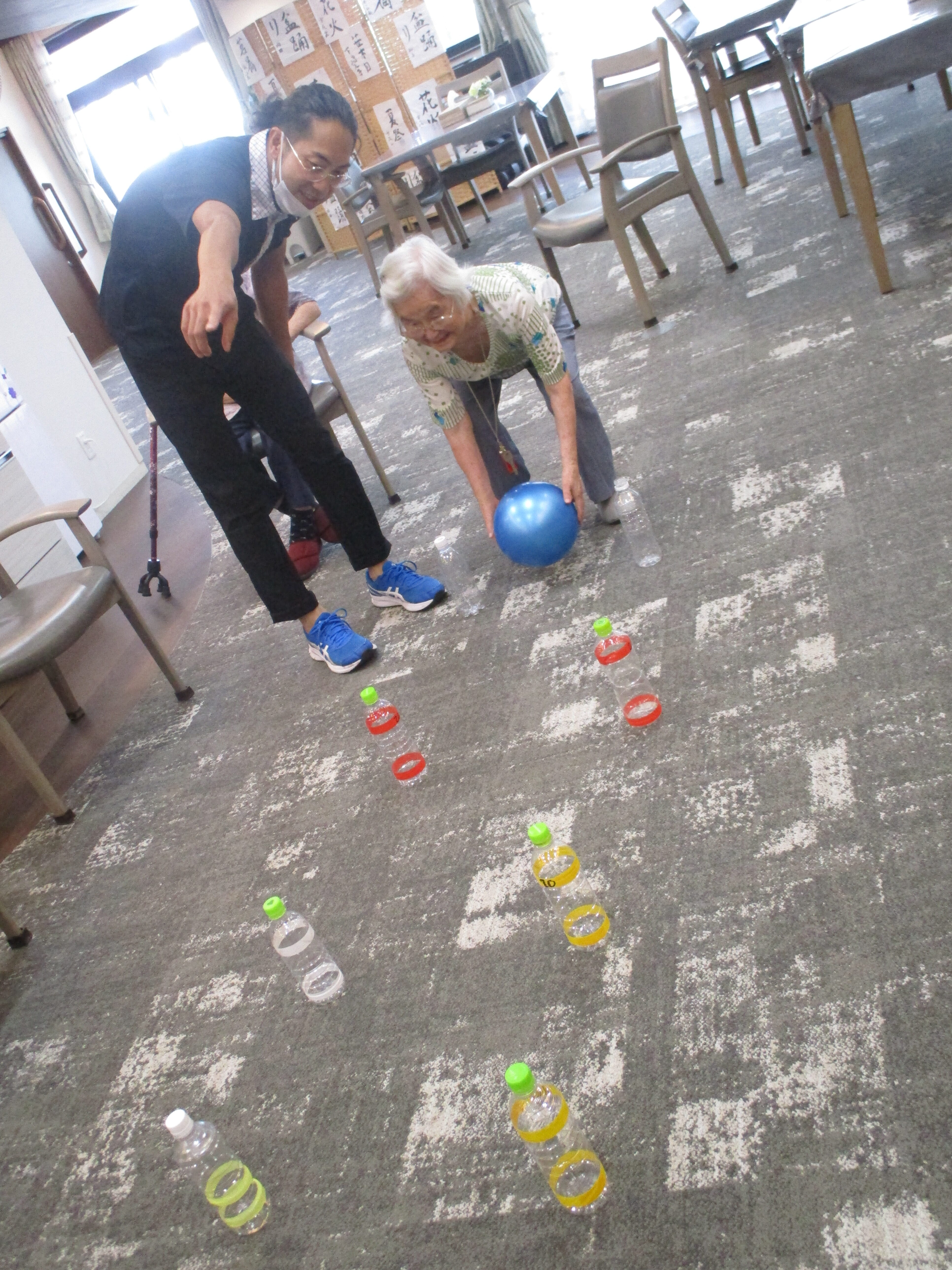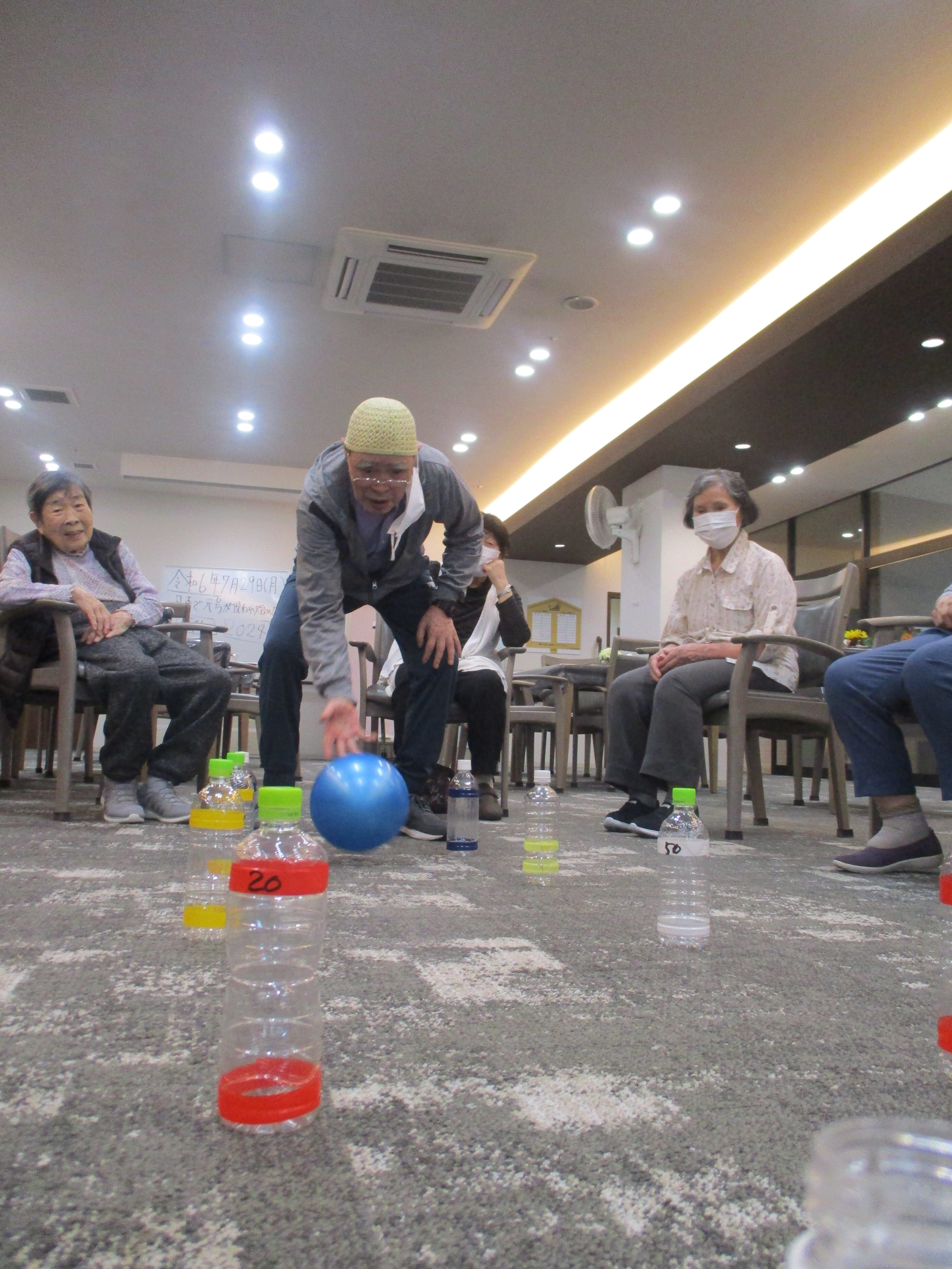 普通のボウリングとは逆の、ペットボトルに当てないようにまっすぐ投げるゲームです。 意外と難しく皆さん苦戦されていました!