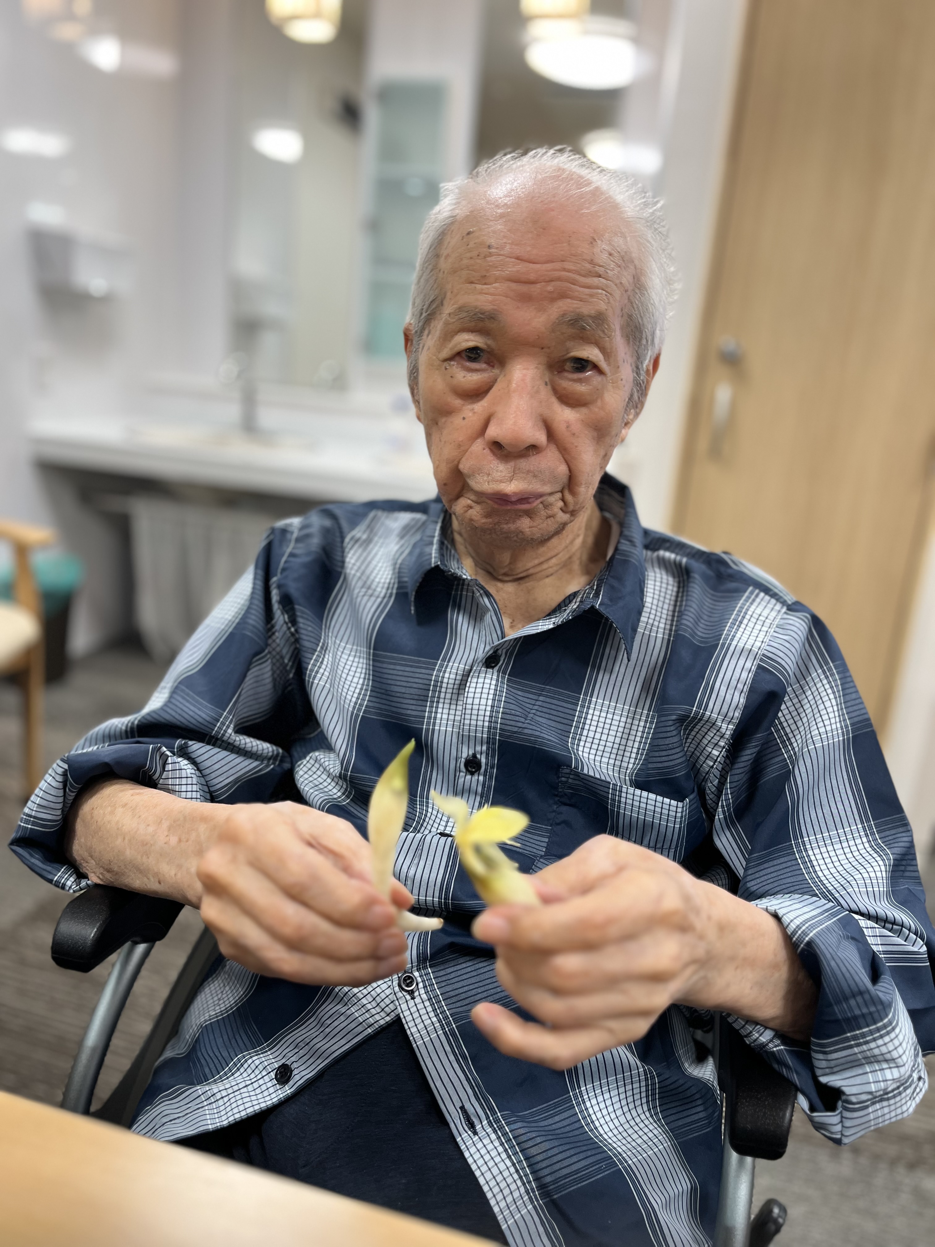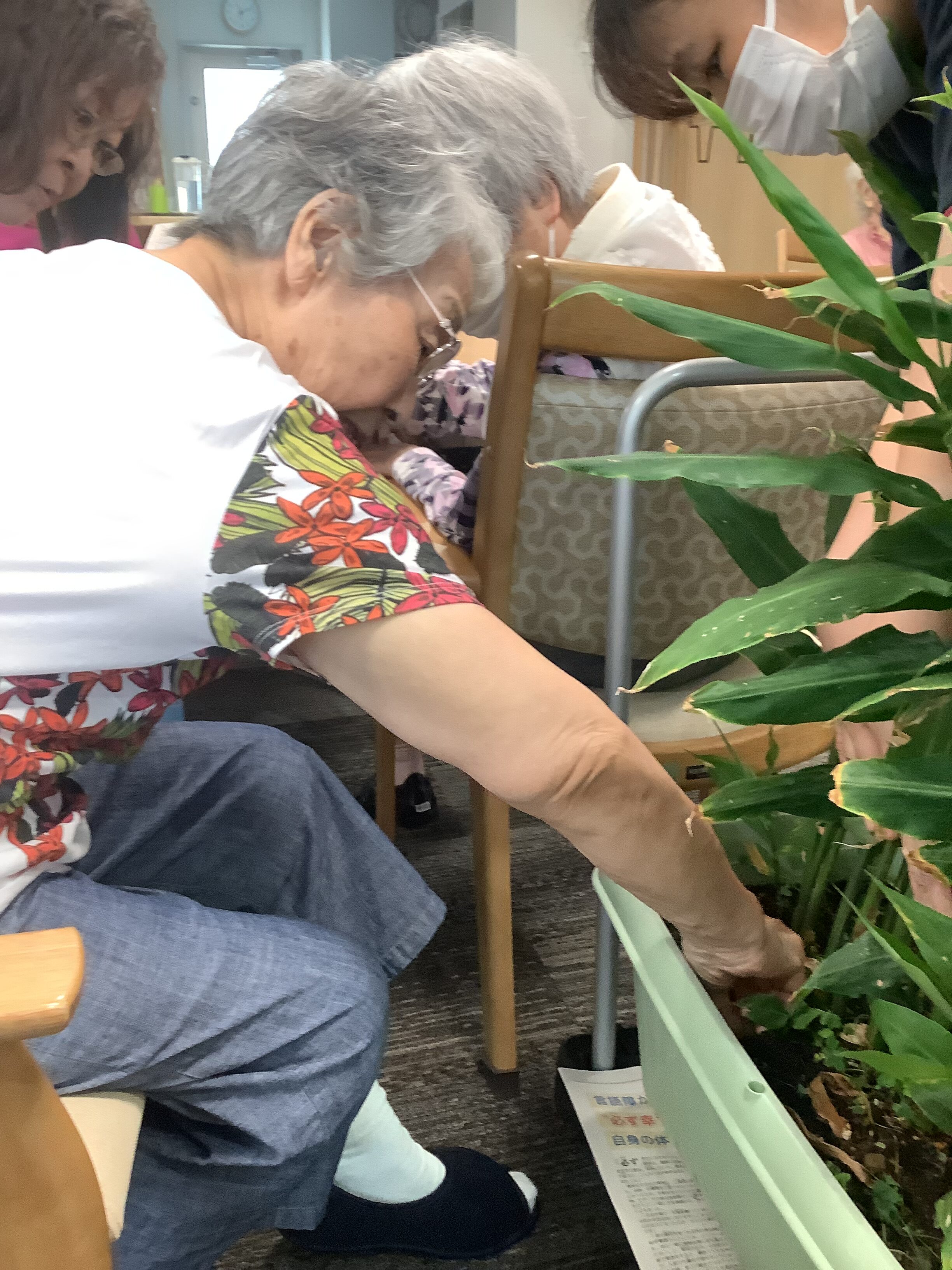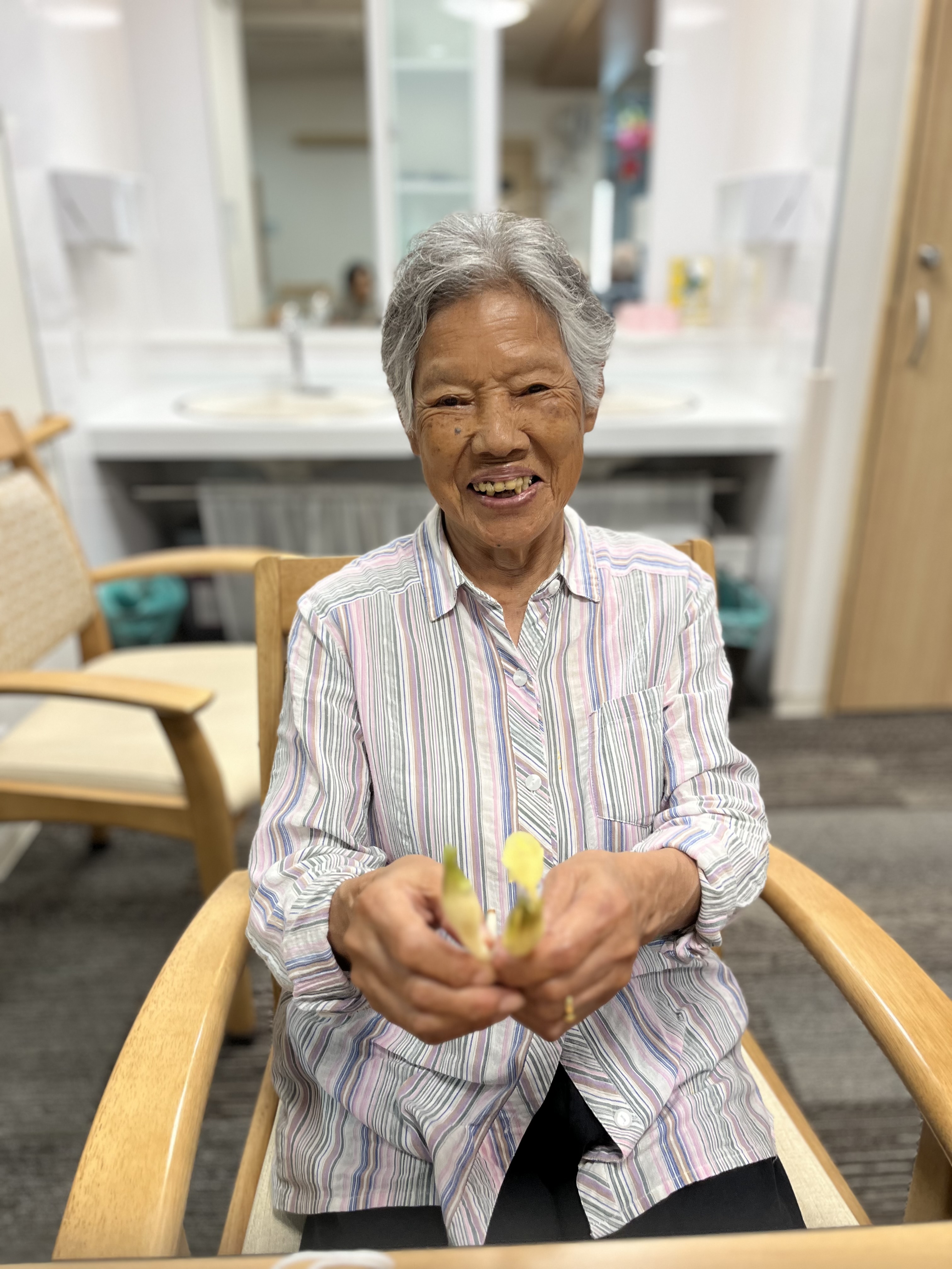 施設で育てているみょうががニョキニョキと出て来ました。ご利用者に収穫していただきました。昼食にみそ汁にしていただきました。みょうがの香りがして美味しかったです。