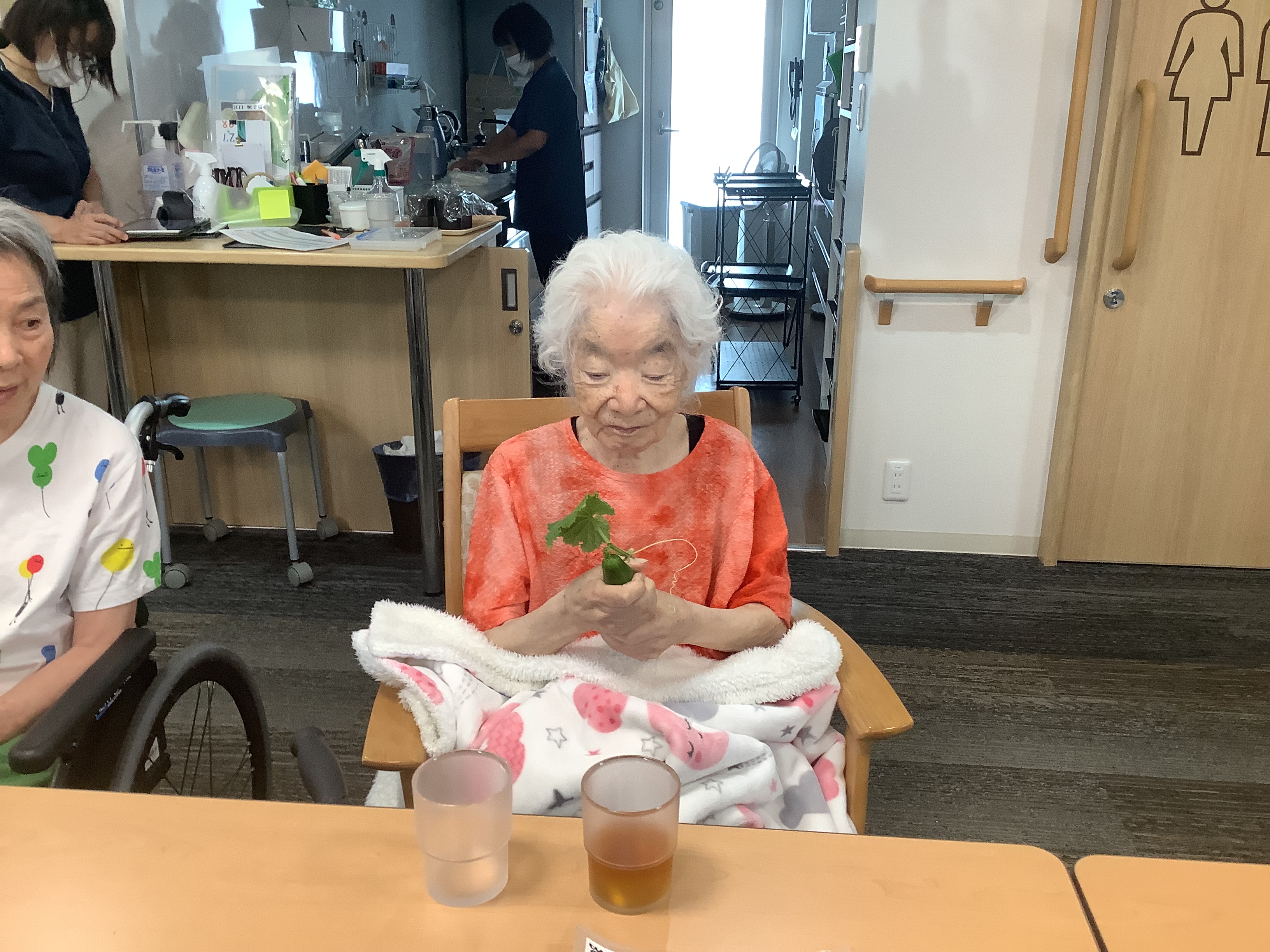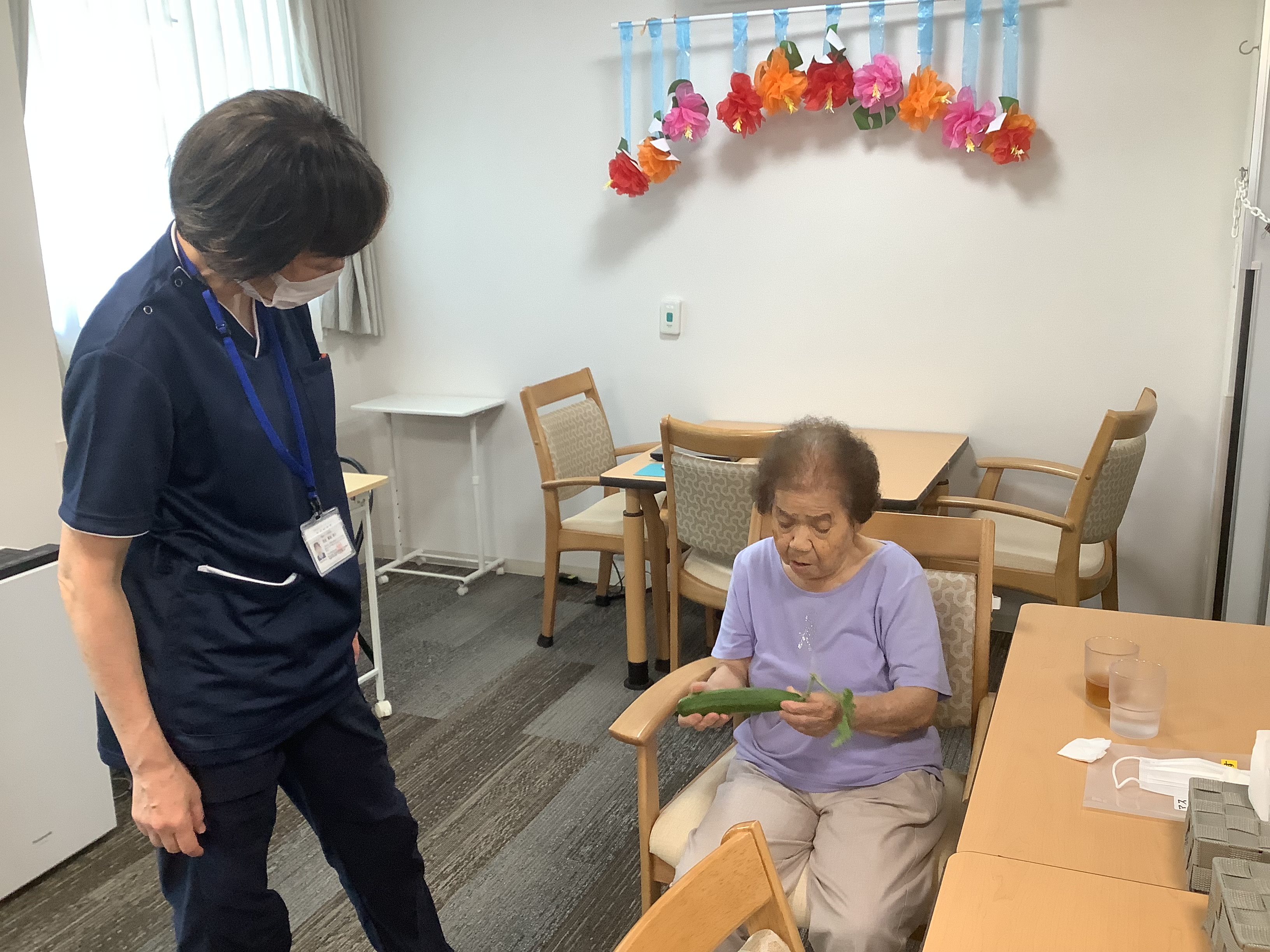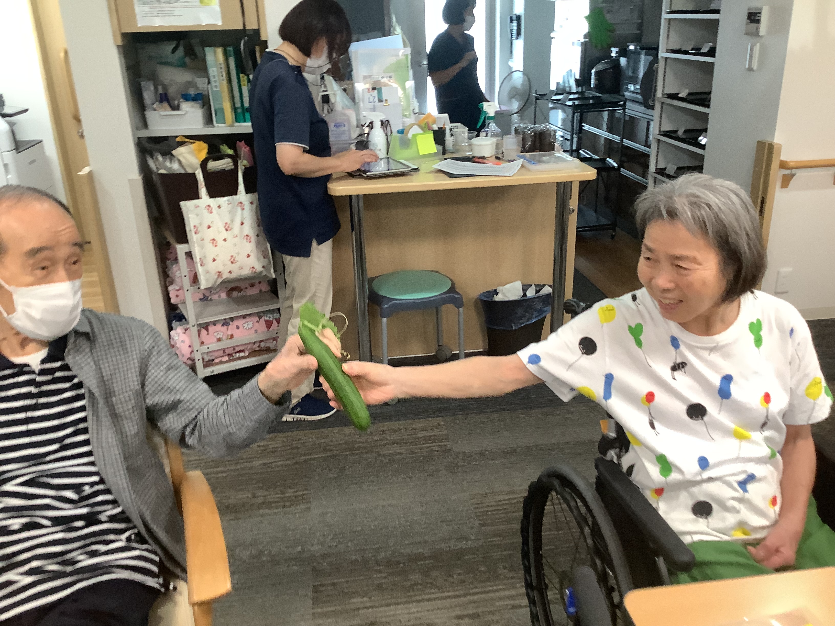 施設で育てたキュウリの収穫です。今回はご利用者の皆様で塩漬けにしておやつの時間にいただきました。甘くて美味しかったです。