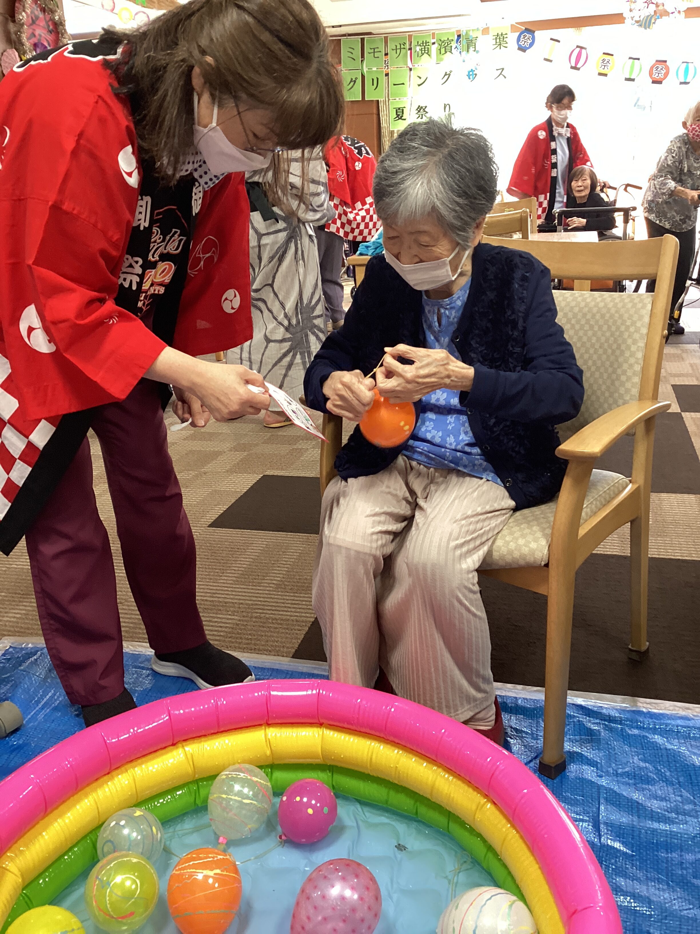 夏祭りは昼食を挟んで、午後の部を開催。 午後は縁日として、射的や魚釣り、ヨーヨー釣りなどを実施しました。 皆さま童心に帰ったかのように、楽しんでいました。 縁日を楽しんだあとはラムネで乾杯!楽しんだあとのラムネは美味しいですね♪