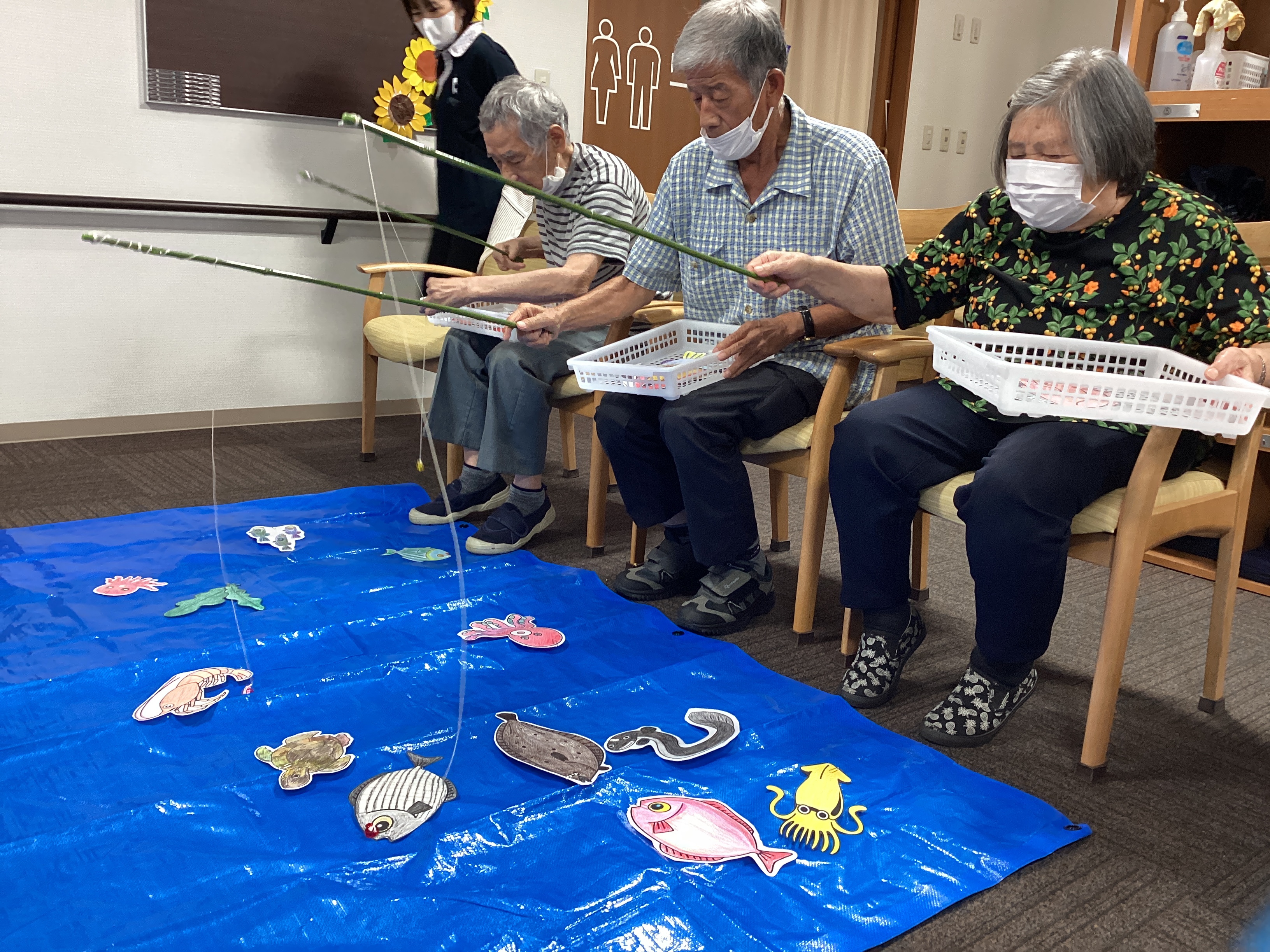 ミニゲームの時間に、皆さんと『魚釣りゲーム』を行いました(*^^*)ブルーシートの海に泳ぐ魚たちは、創作活動の時間に色を塗っていただきラミネートフィルムで加工したものです。チーム対抗戦です!さぁ勝利を手にするのはどのチームでしょうか⁈