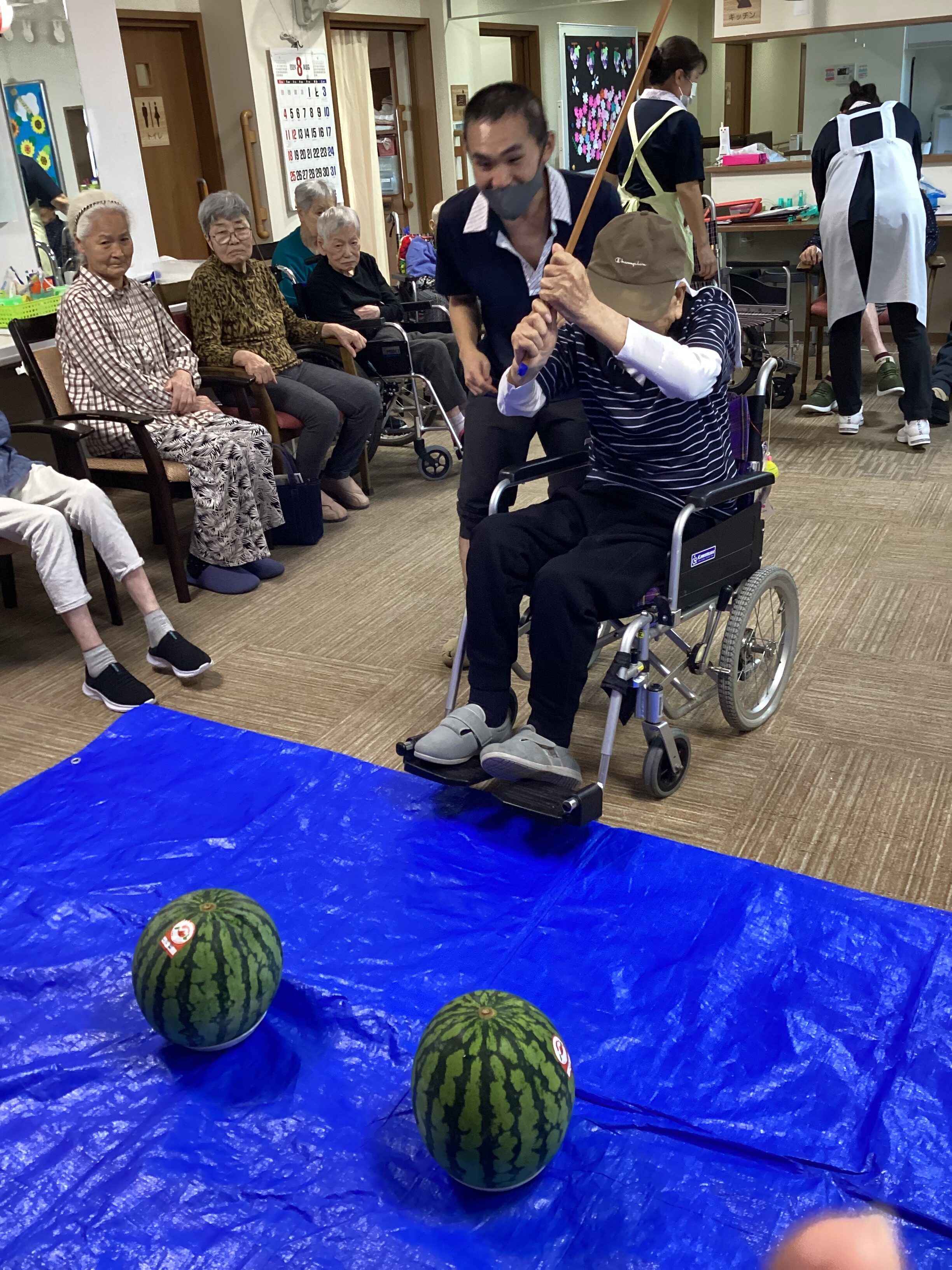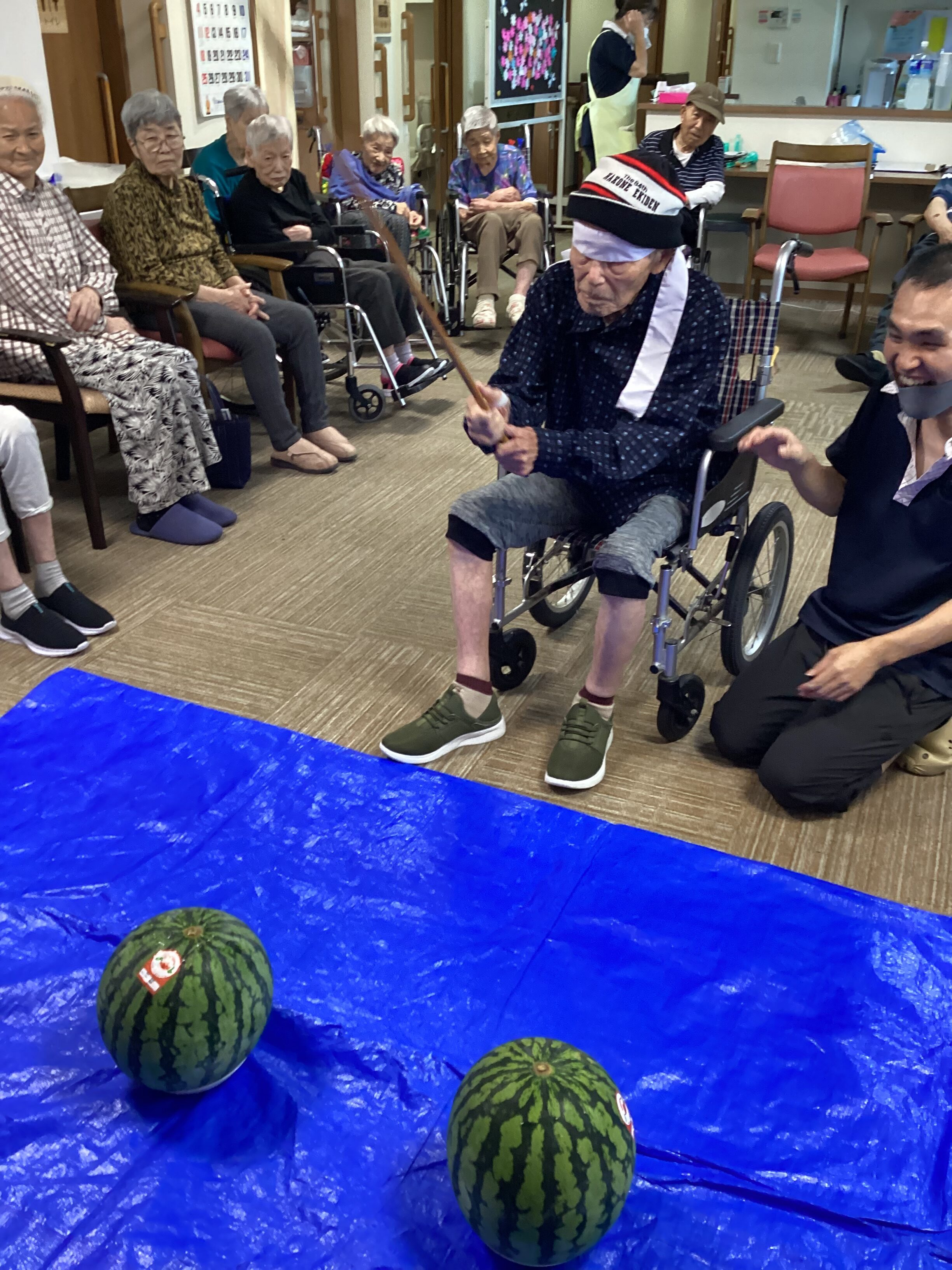 夏の風物詩!すいか割りを開催しました!皆様やる気満々でスイカを叩いてくださいました☻ が、なかなか割れず、、職員も一緒に挑戦しましたが、、割れず💦綺麗にカットして全員で美味しく頂きました! スイカをみんなで一緒に食べて、いい思い出になりました❤❤