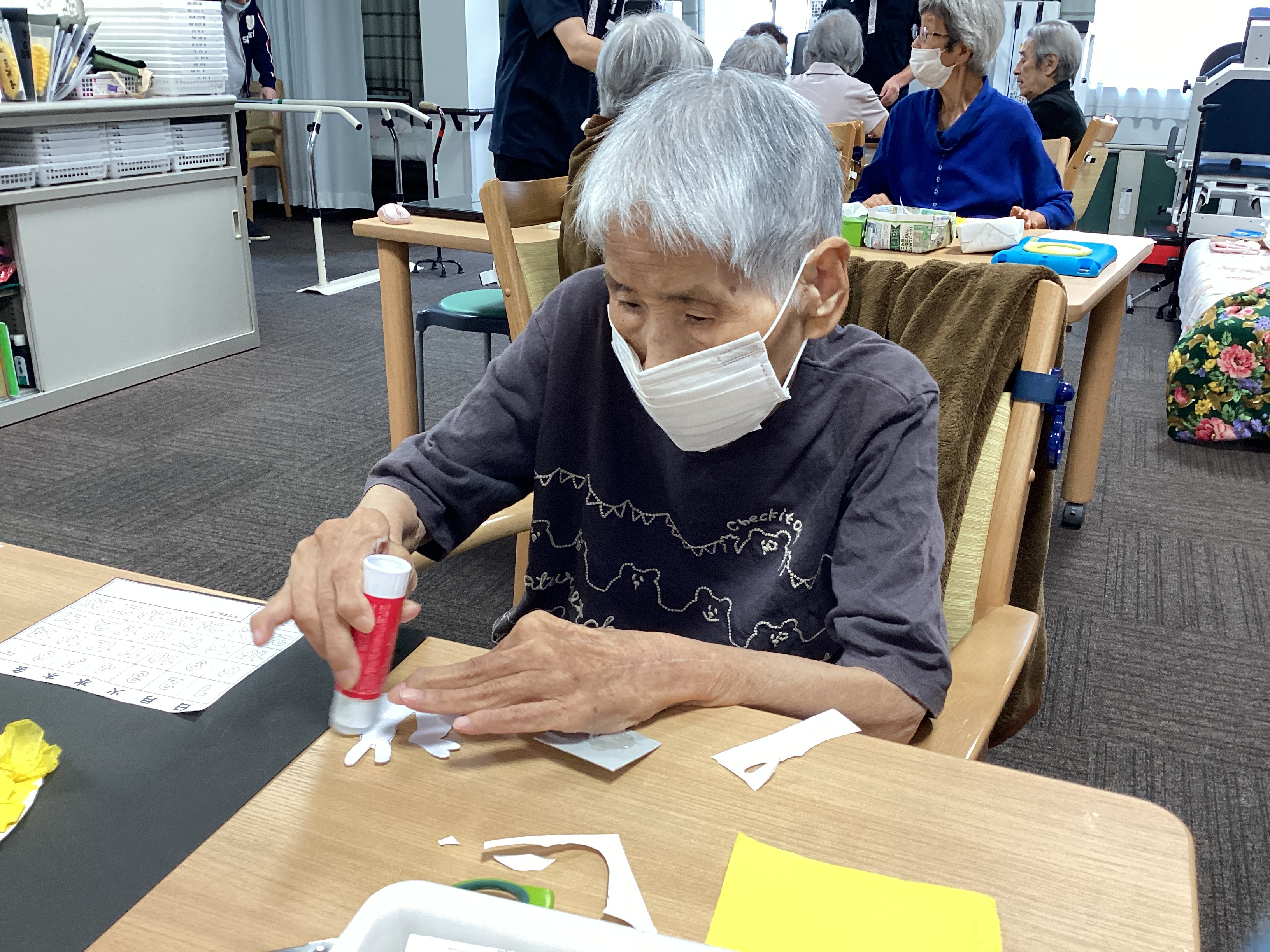 9月のカレンダーをみなさんで作りました☆十五夜をイメージしてお花紙をまるめて貼っていきます。時間をかけてゆっくりゆっくり丸めて丸めて・・・手指の機能訓練にもなる製作です。