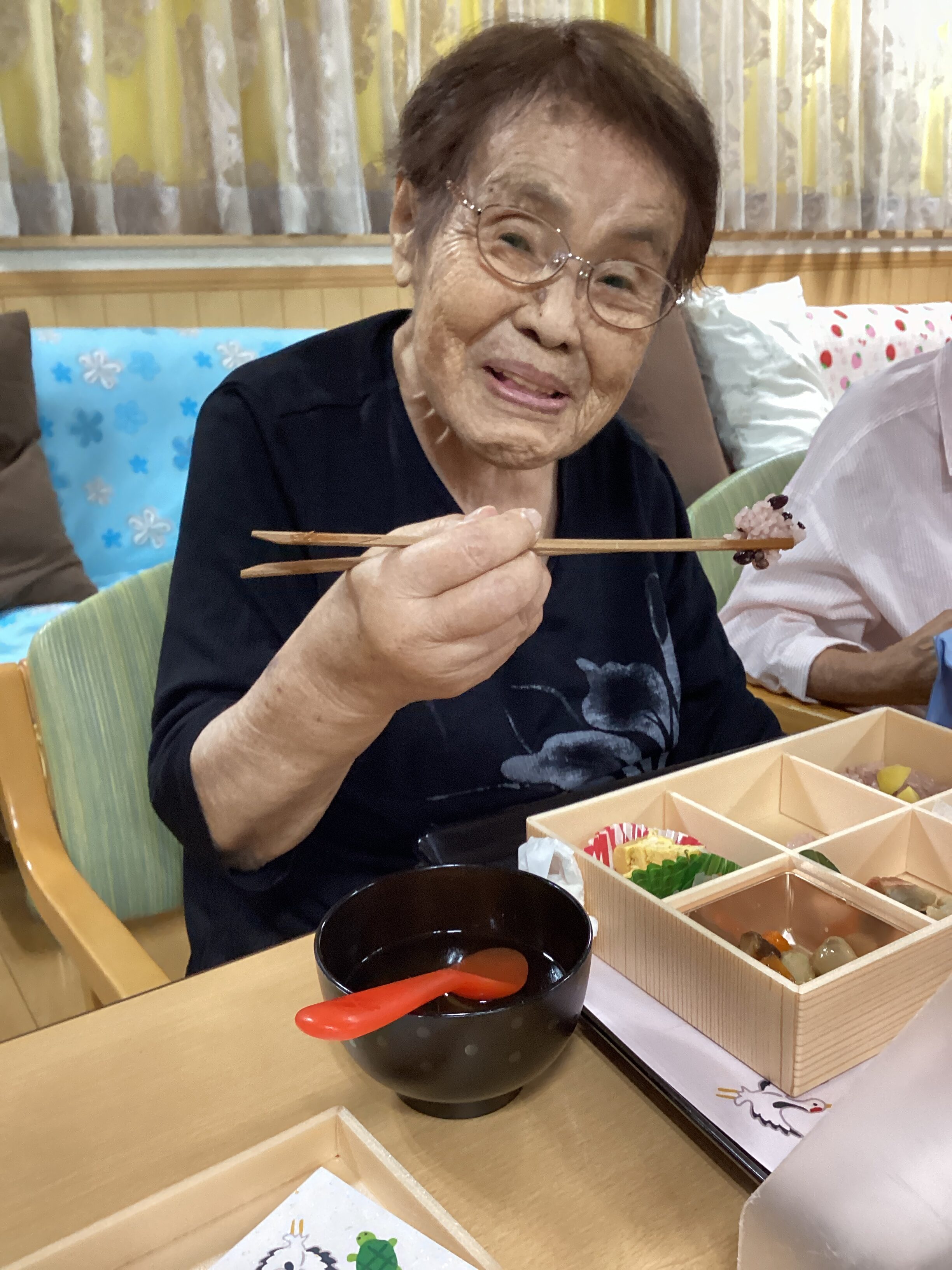 お昼はお祝い膳、おやつは手作り紅白まんじゅう☺