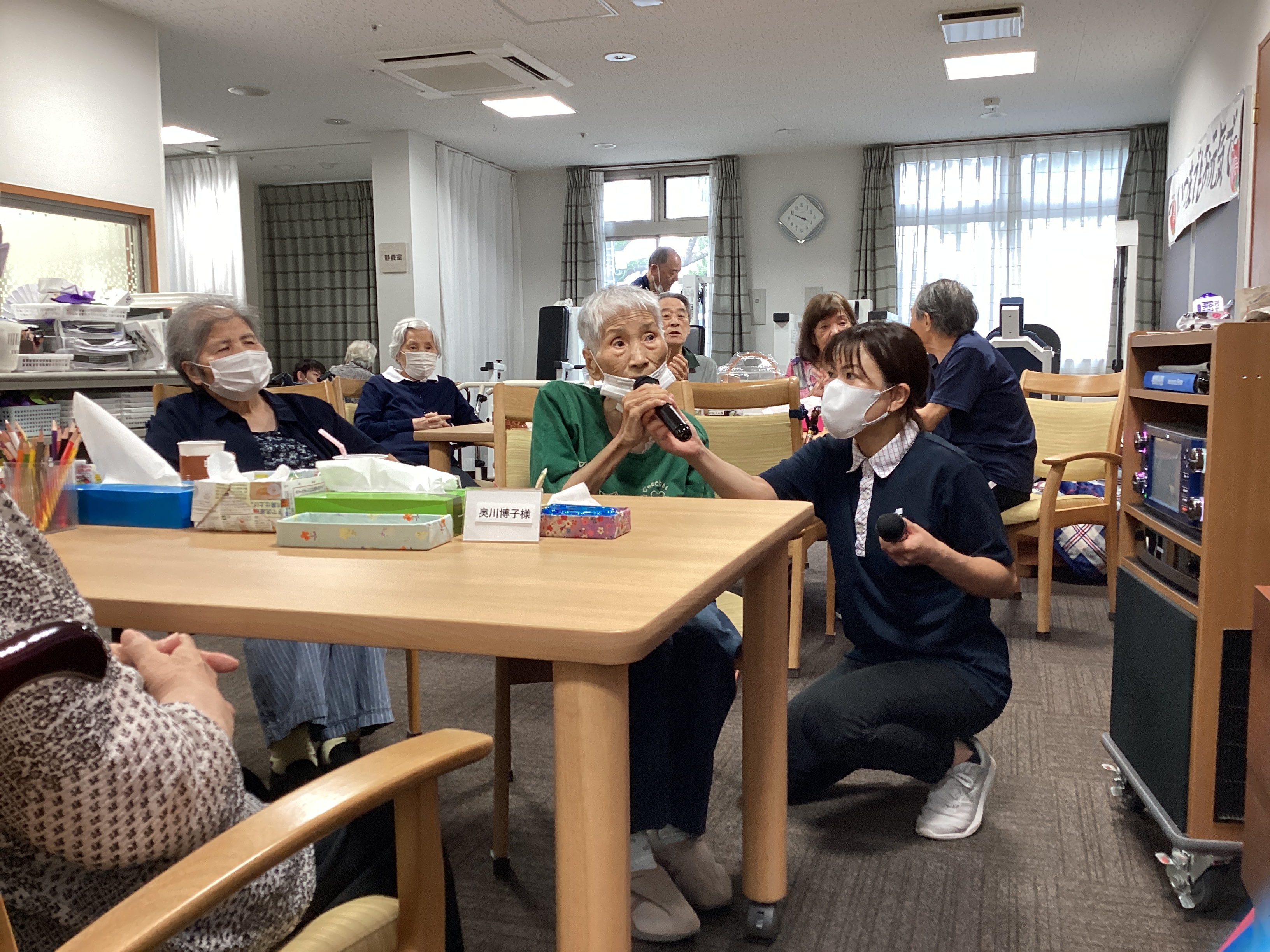 9月16日敬老の日。皆様がご健康で明るくお過ごしくださいますようにお祈りしながら日頃の感謝とともにお祝いをしました‼レクリエーションやカラオケを行い、笑顔満開の楽しいひと時でした☆皆様どうぞいつまでもお元気で・・・