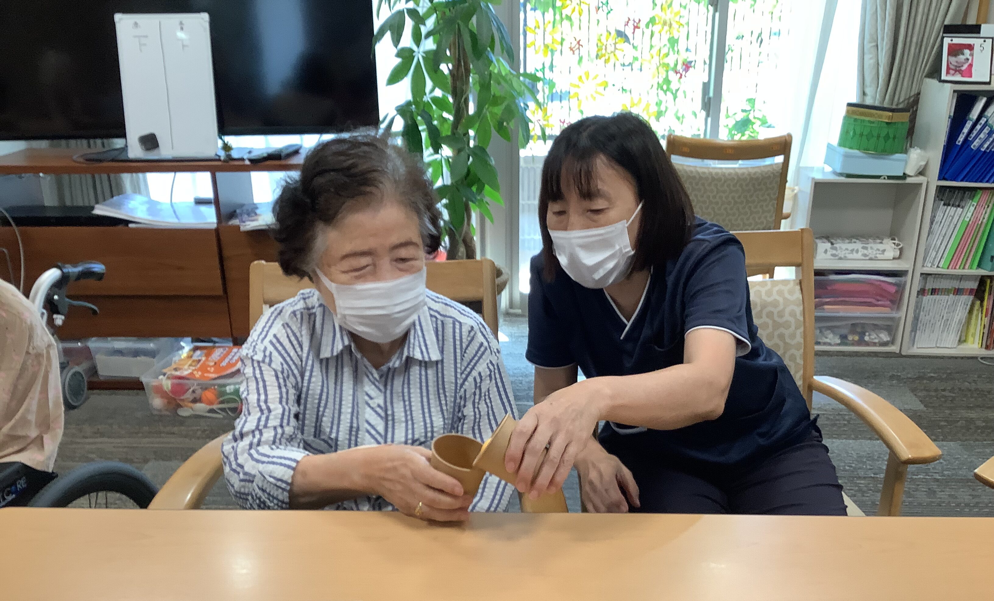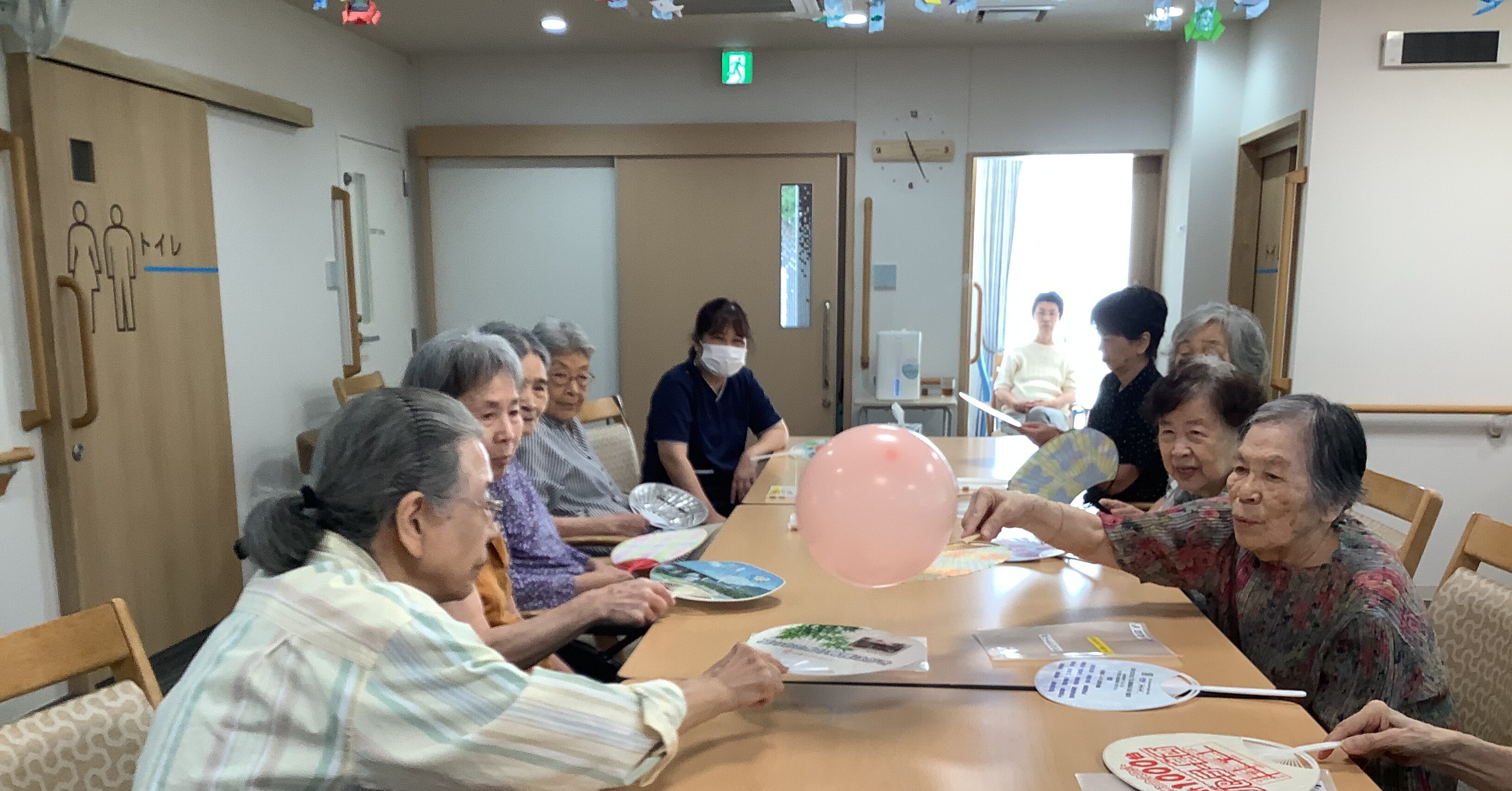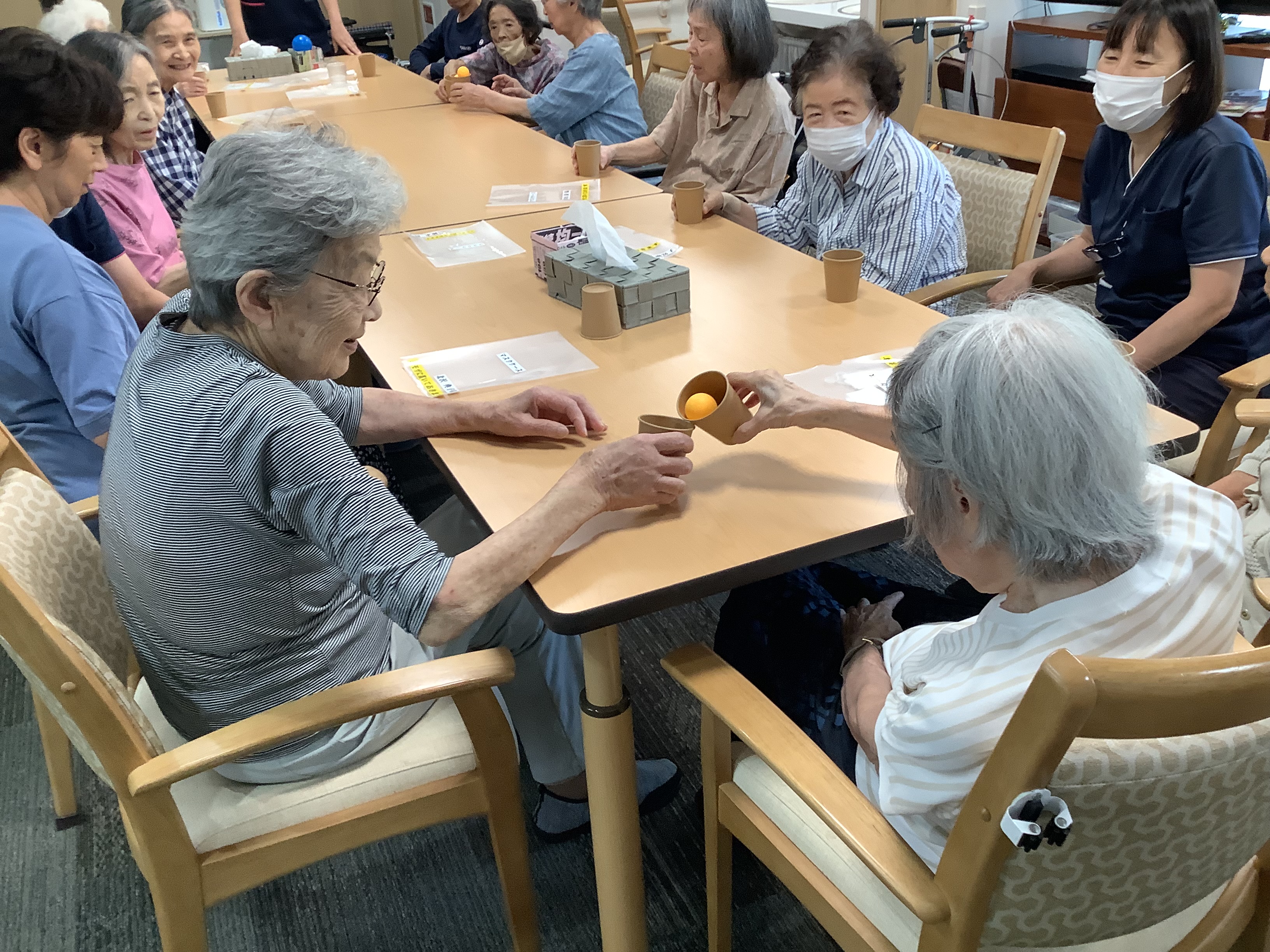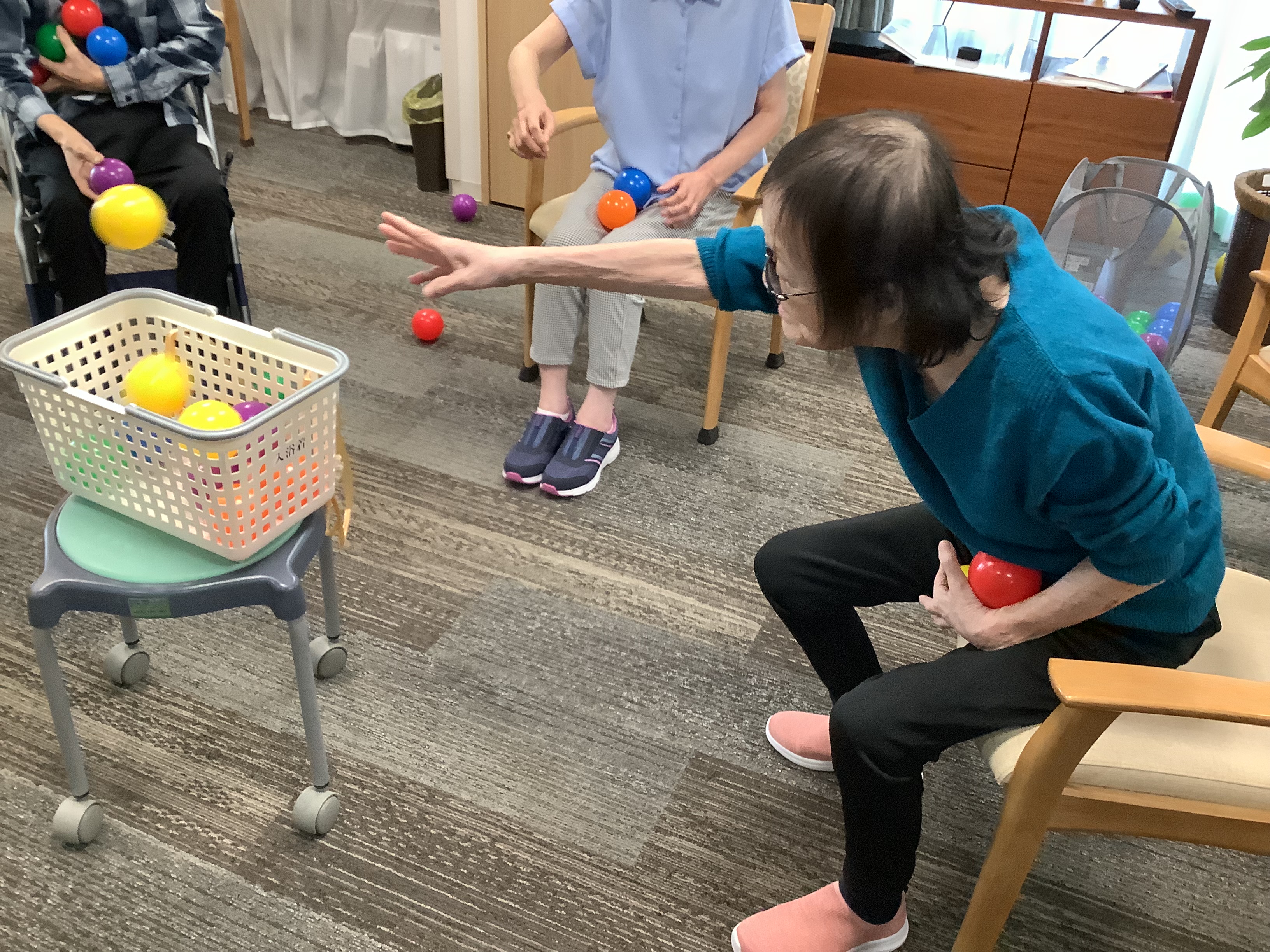 最近はボールや風船を使ったレクがブームとなっています。皆様でコップを使いボールを渡したり、風船バレーや玉入れなどで盛り上がっています。