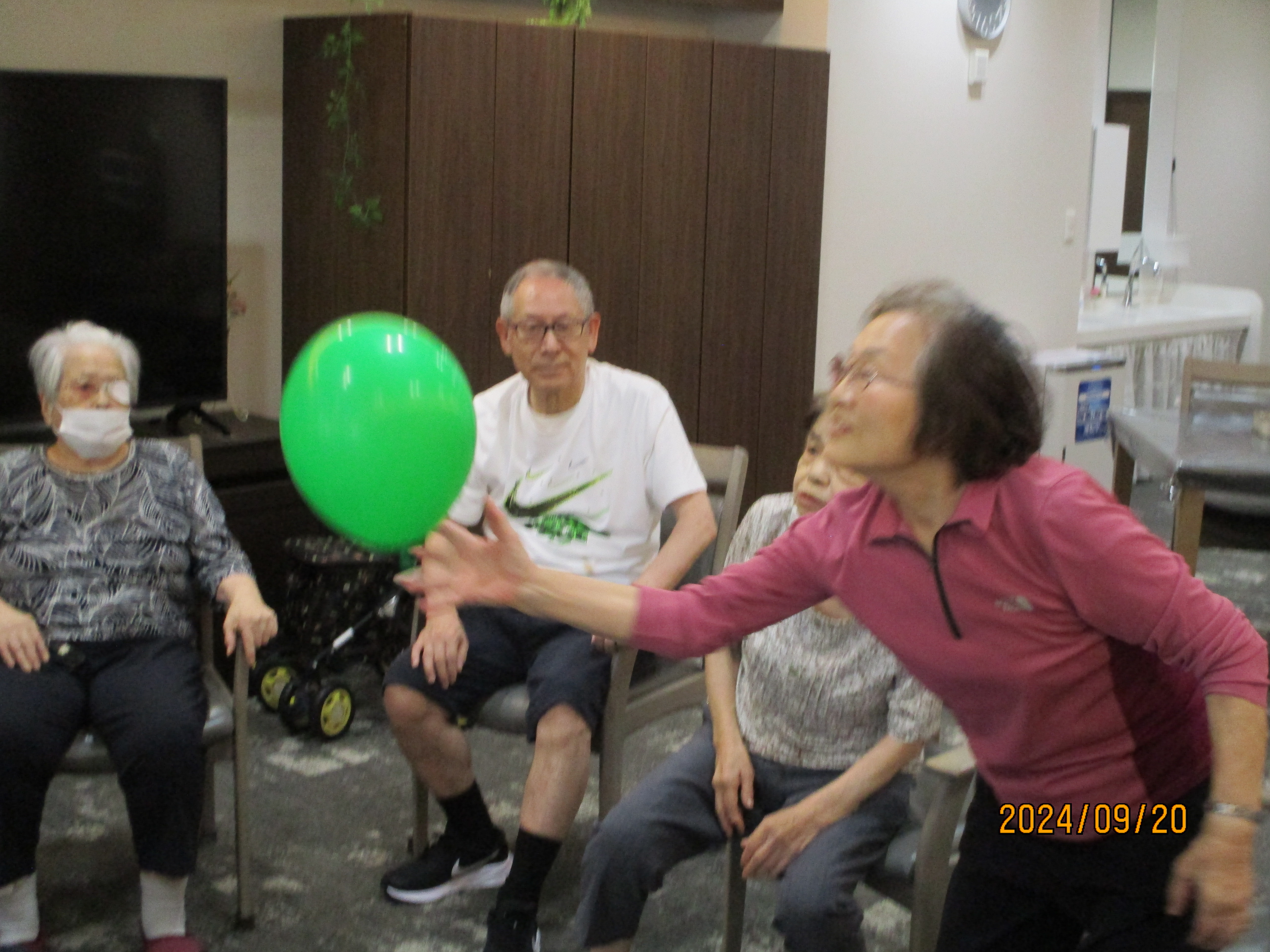 新しいご入居者も増えてにぎやかなレクリエーションとなりました。風船を一所懸命に追っています。皐月苑は身体を使うレクリエーションも盛んに行われています。