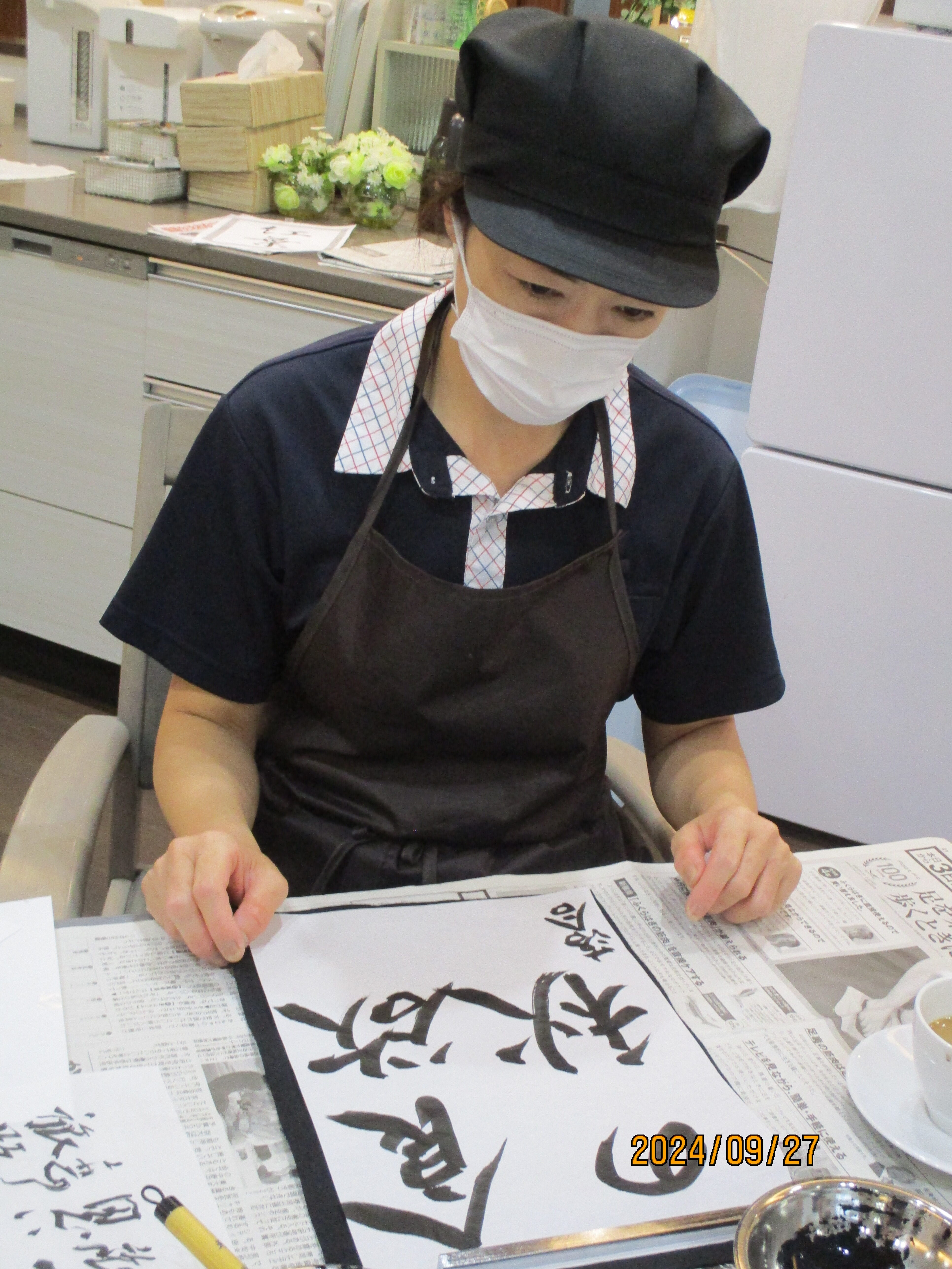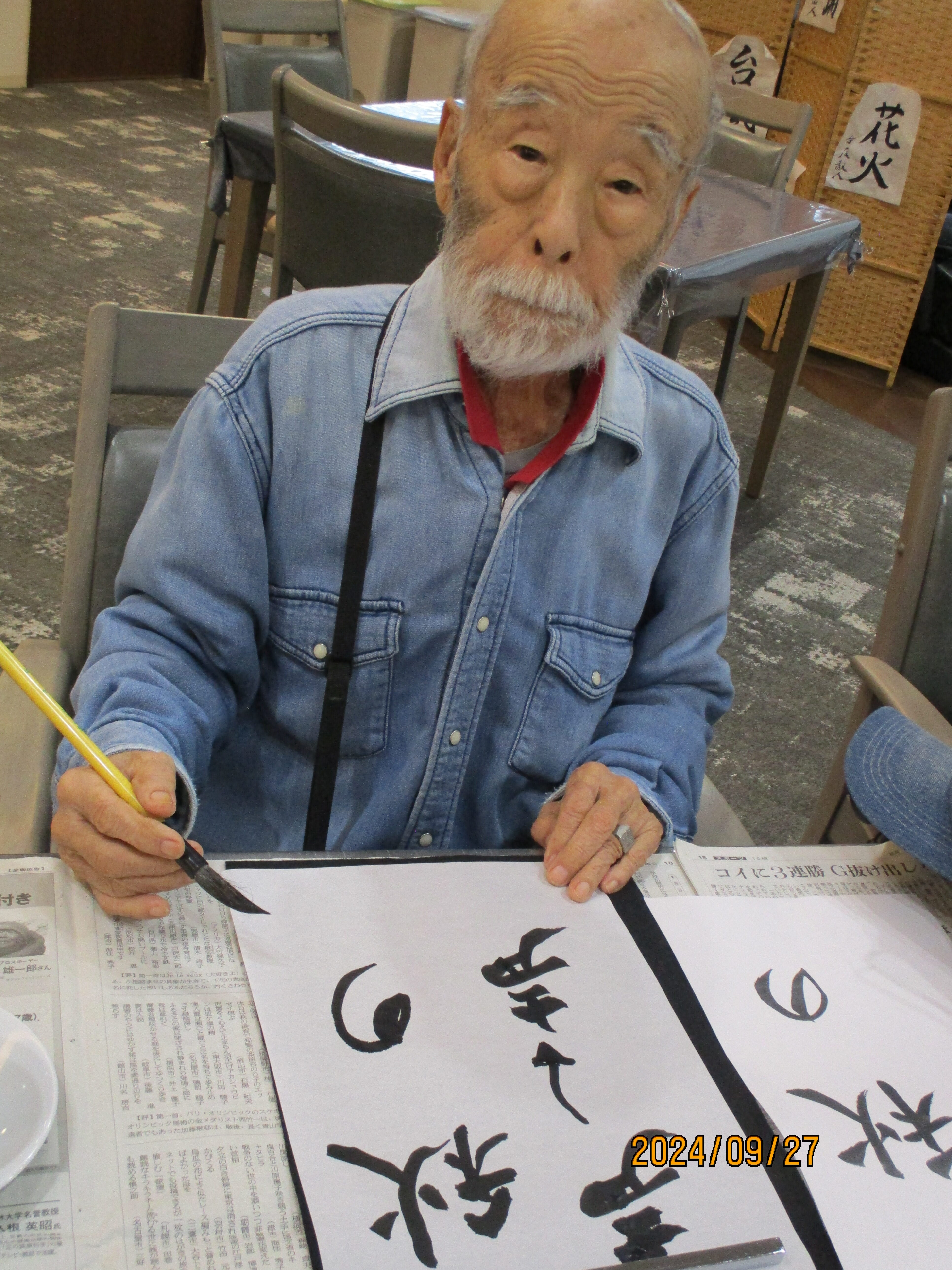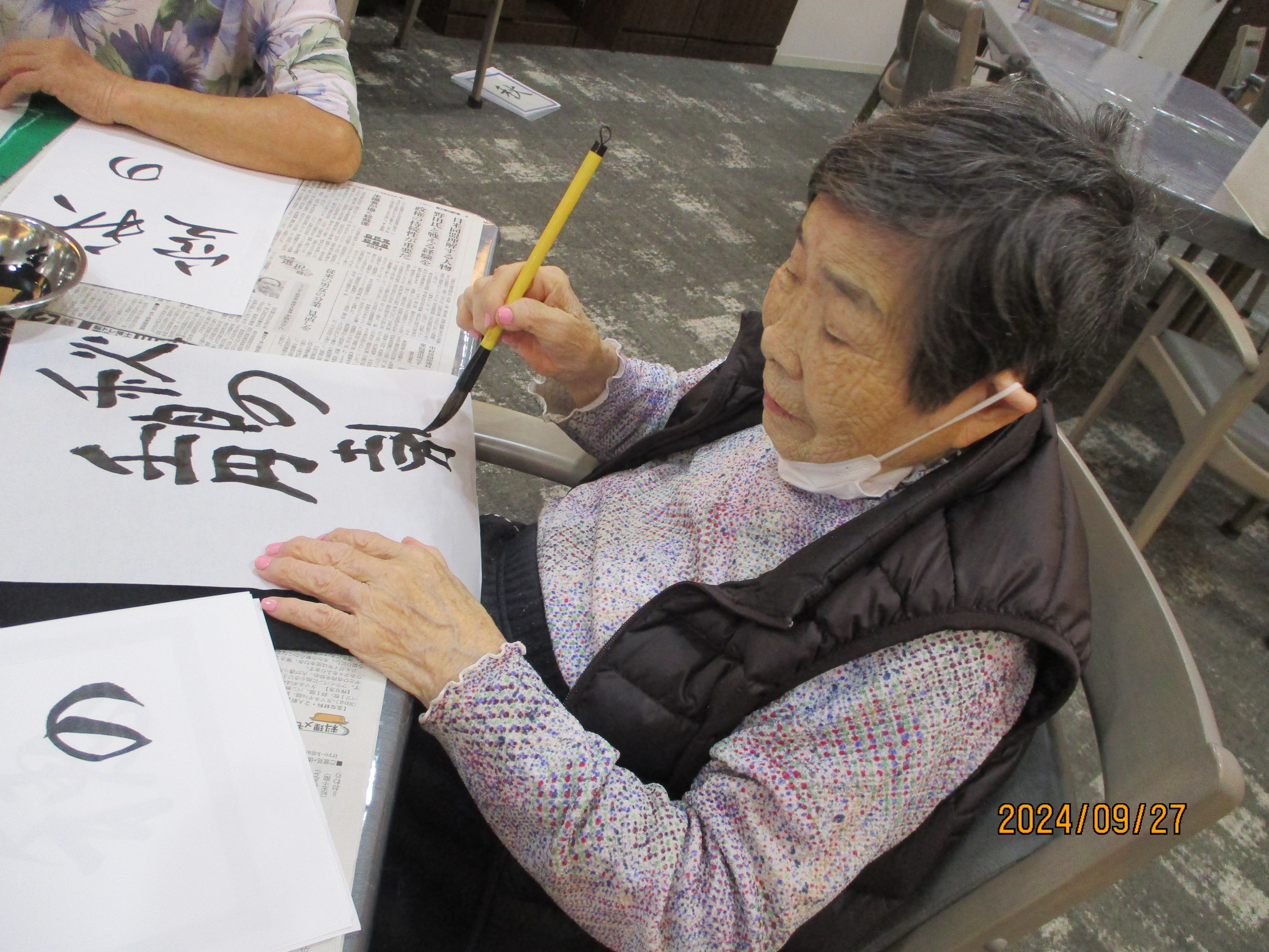 新しいご入居者も書道に参加して楽しまれています。秋にちなんだ言葉を、書道で思い思い個性豊かに書き留めました。