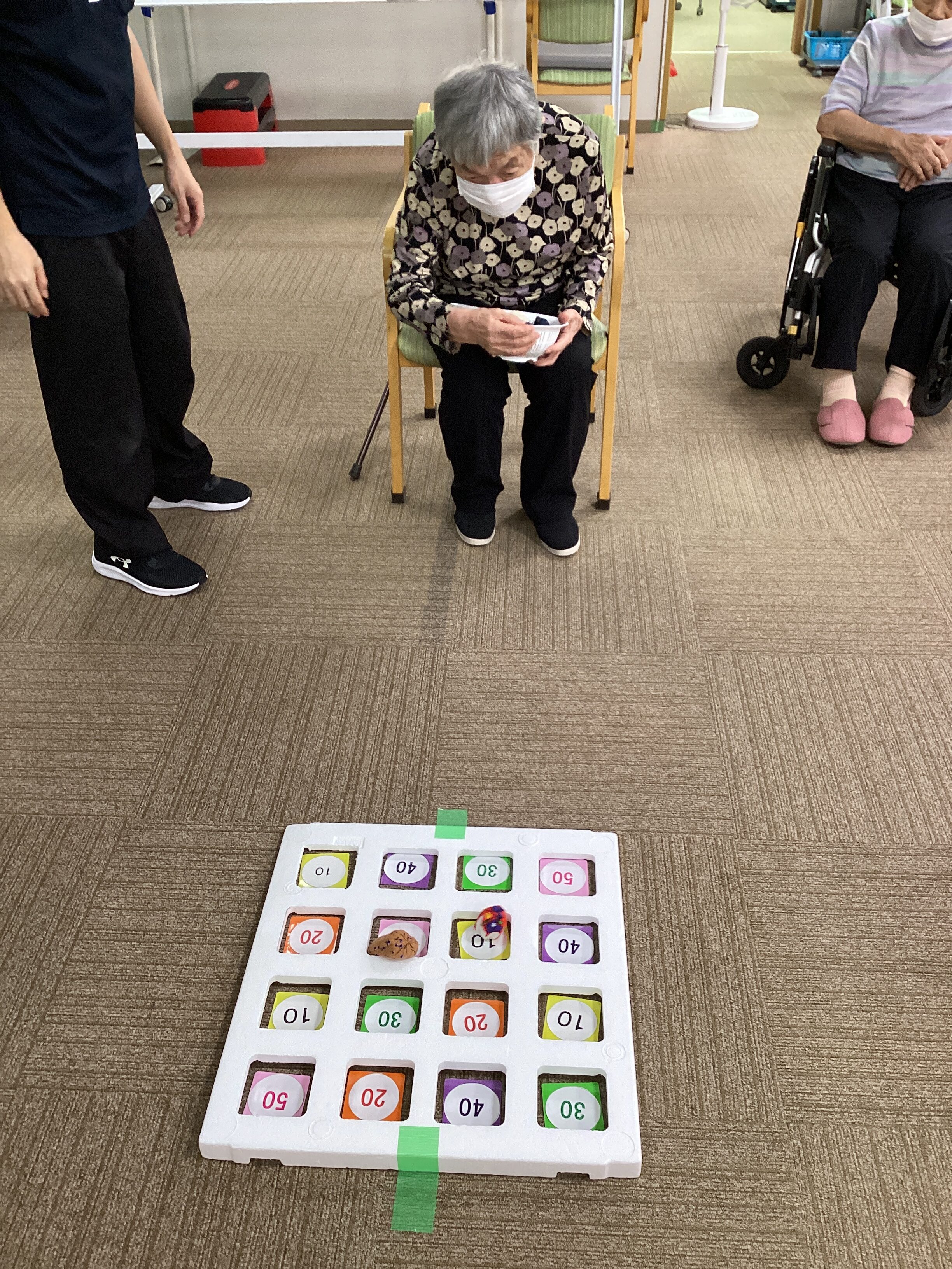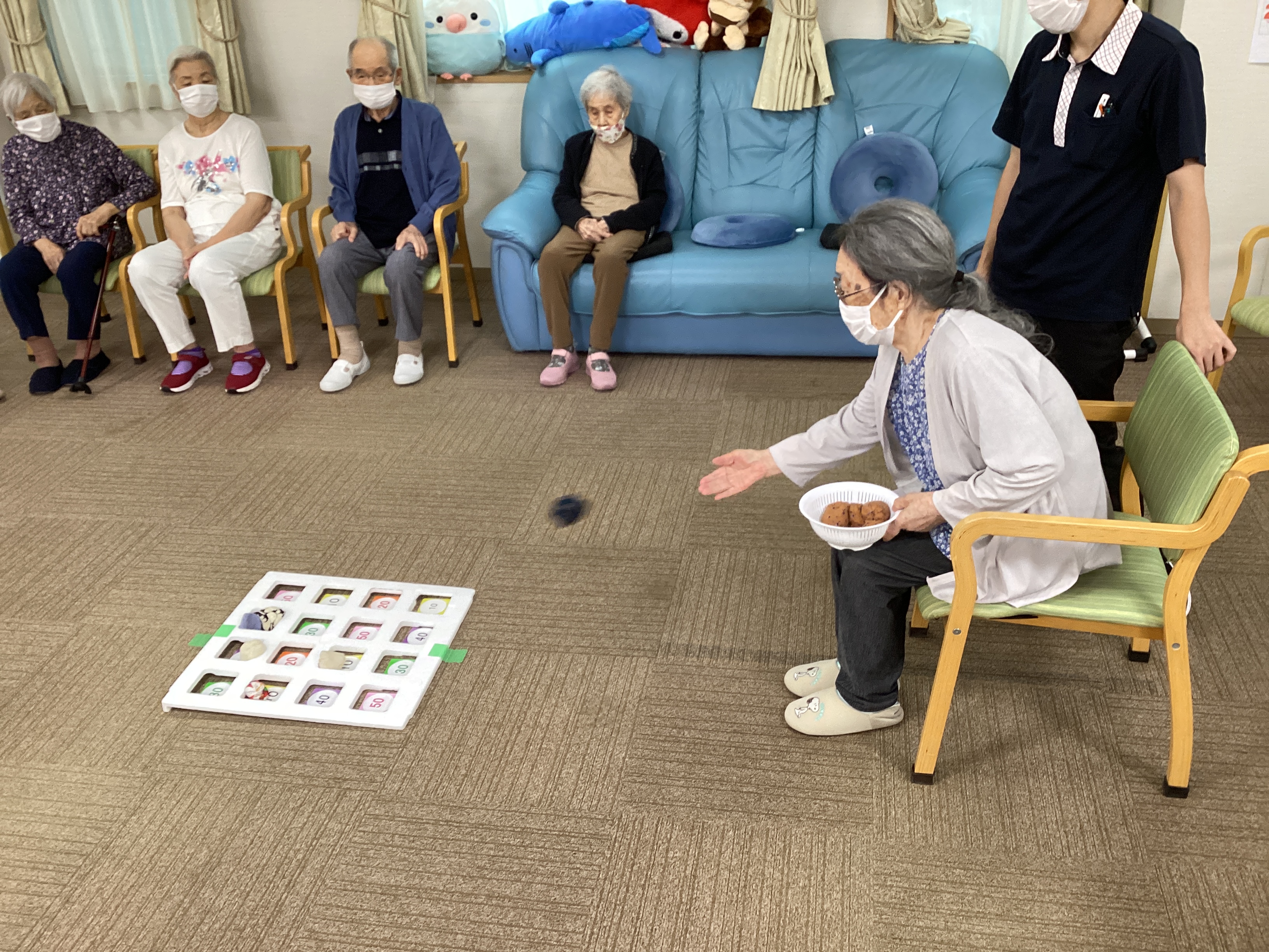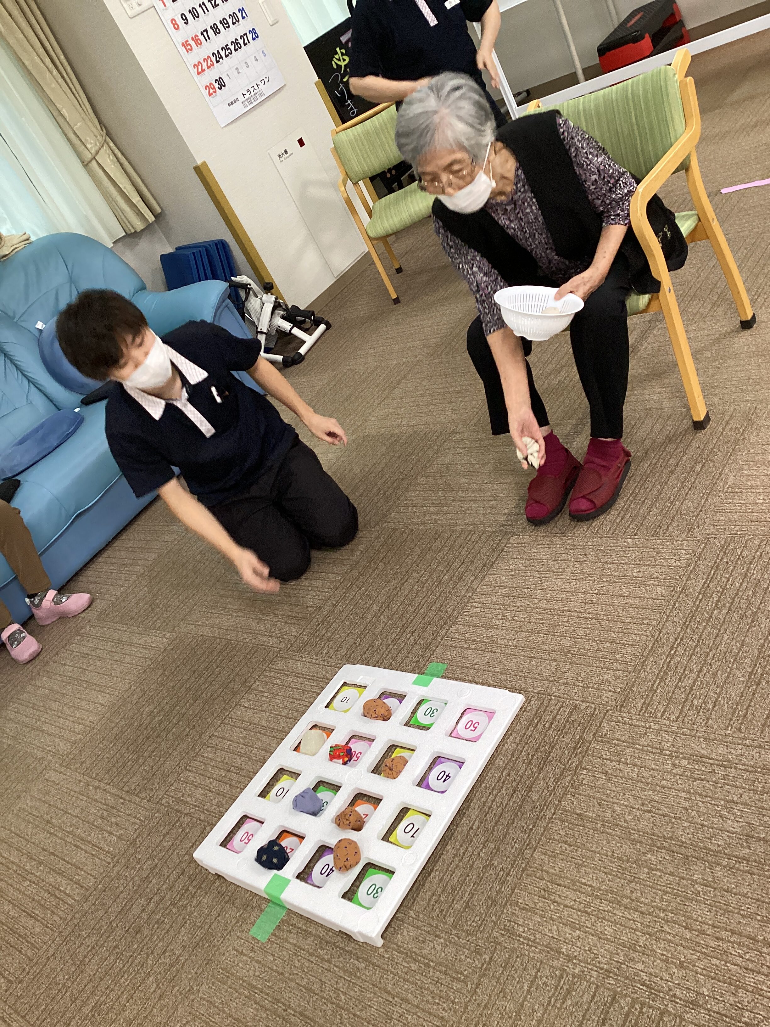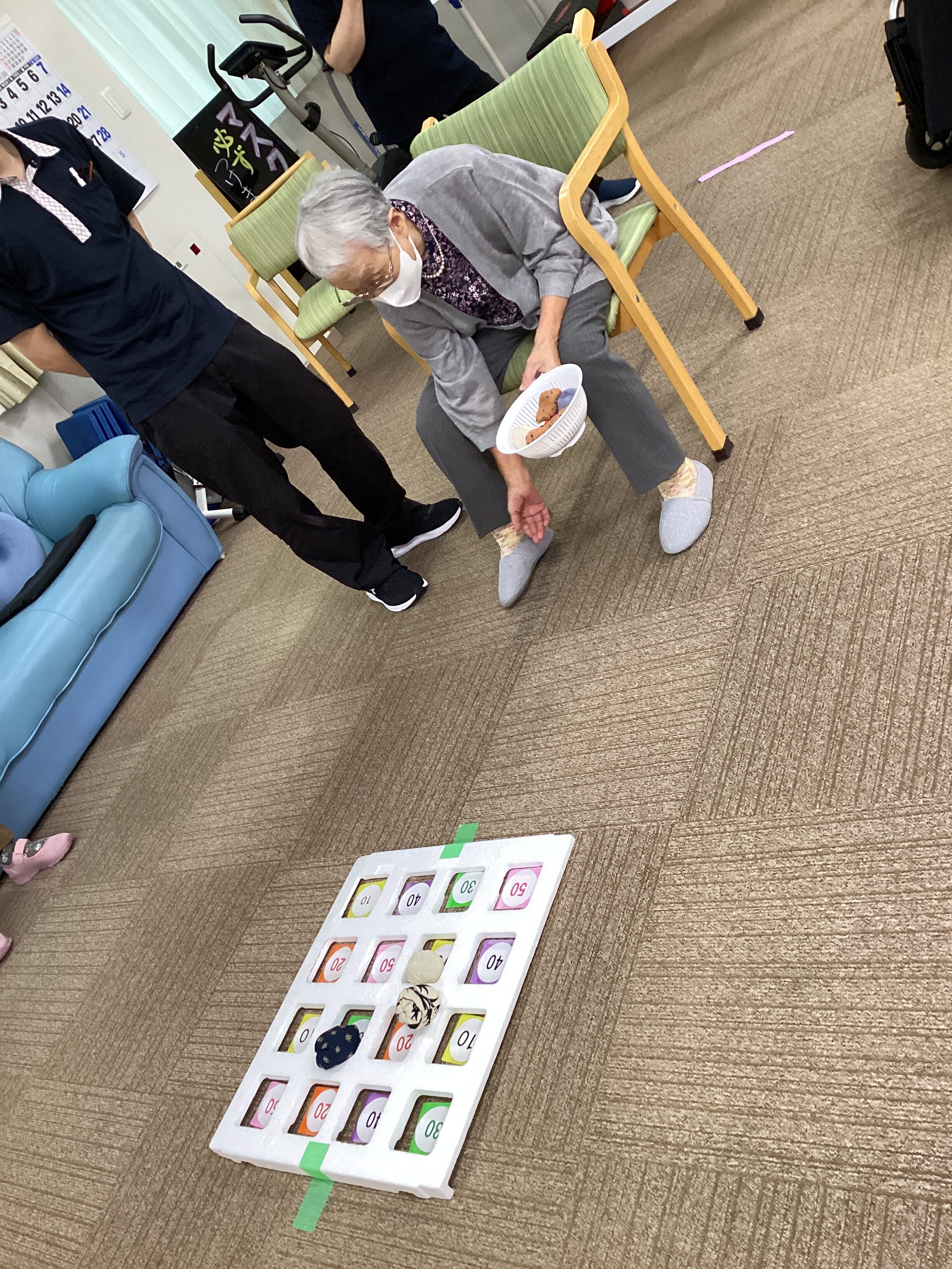 ある日のレクリエーション、お手玉を投げてビンゴを狙います。なかなか的に入らず意外と難しいようです。bingoが出たら皆様で拍手👏