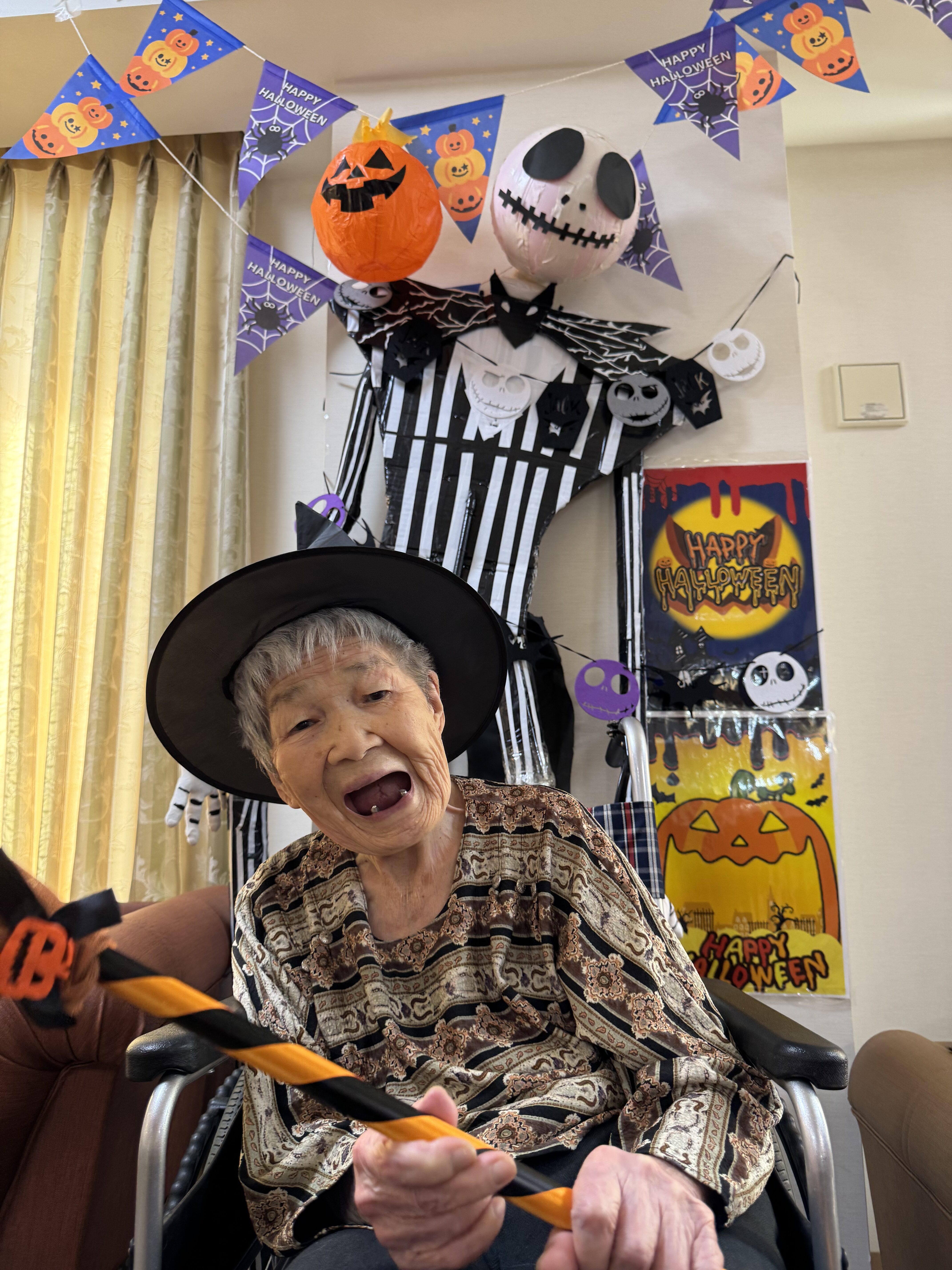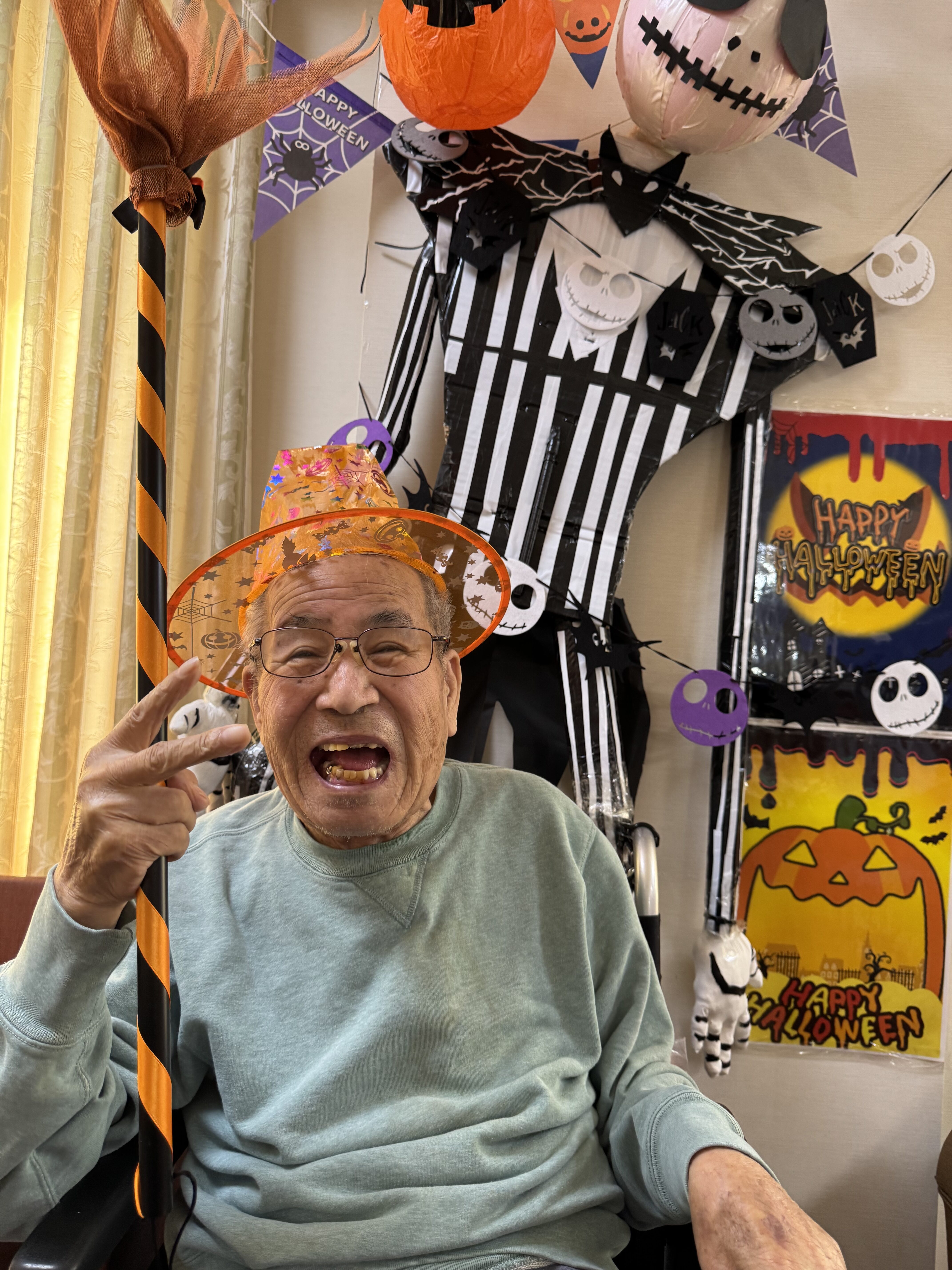 Halloweenの記念撮影の様子です! 背景を飾るハロウィンの有名キャラクター、実は職員の手作りです( ・´ー・`)(すごいでしょ❤) ご利用者様の背景を鮮明に彩っております☻ もちろんこの日はお菓子も食べましたよ!!