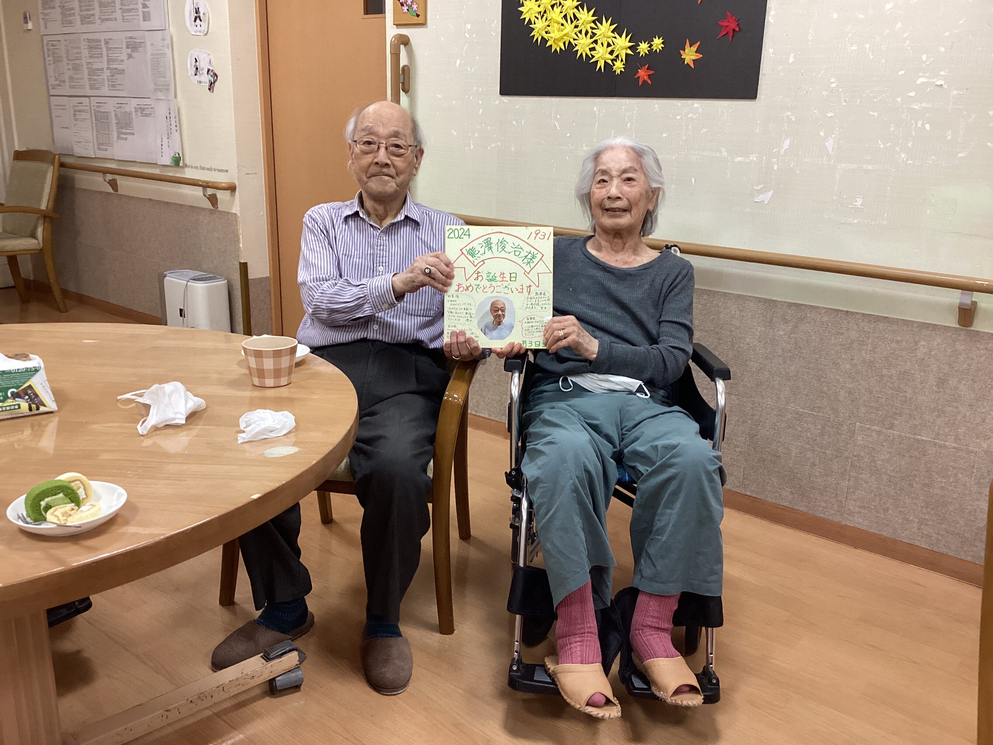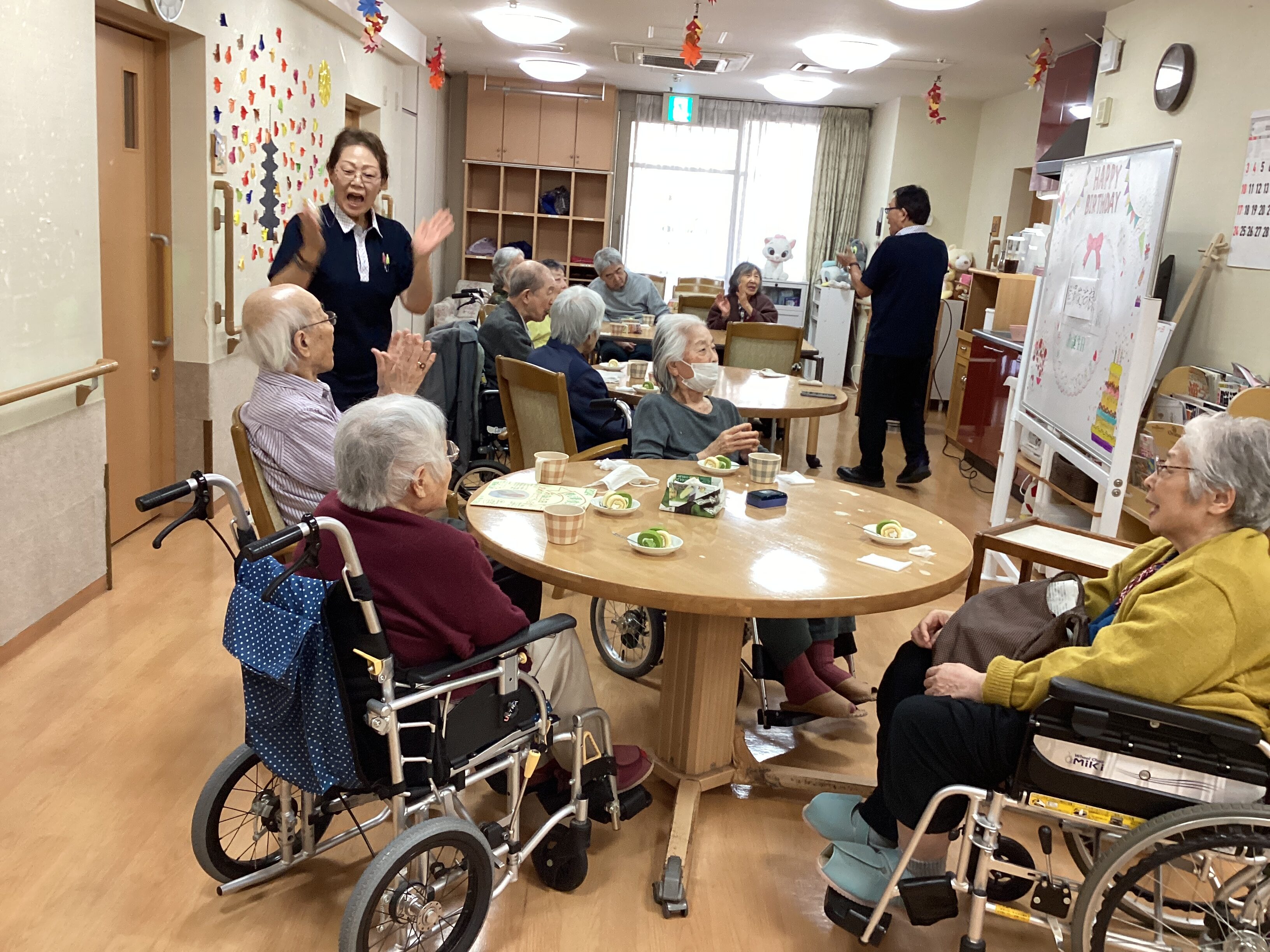 今日はご利用者のお誕生日を祝い、誕生日会を行いました。昔懐かしい歌を笑顔満開で披露して下さいました。 また傍らには奥様が一緒に祝って下さりとっても甘いひと時でした。