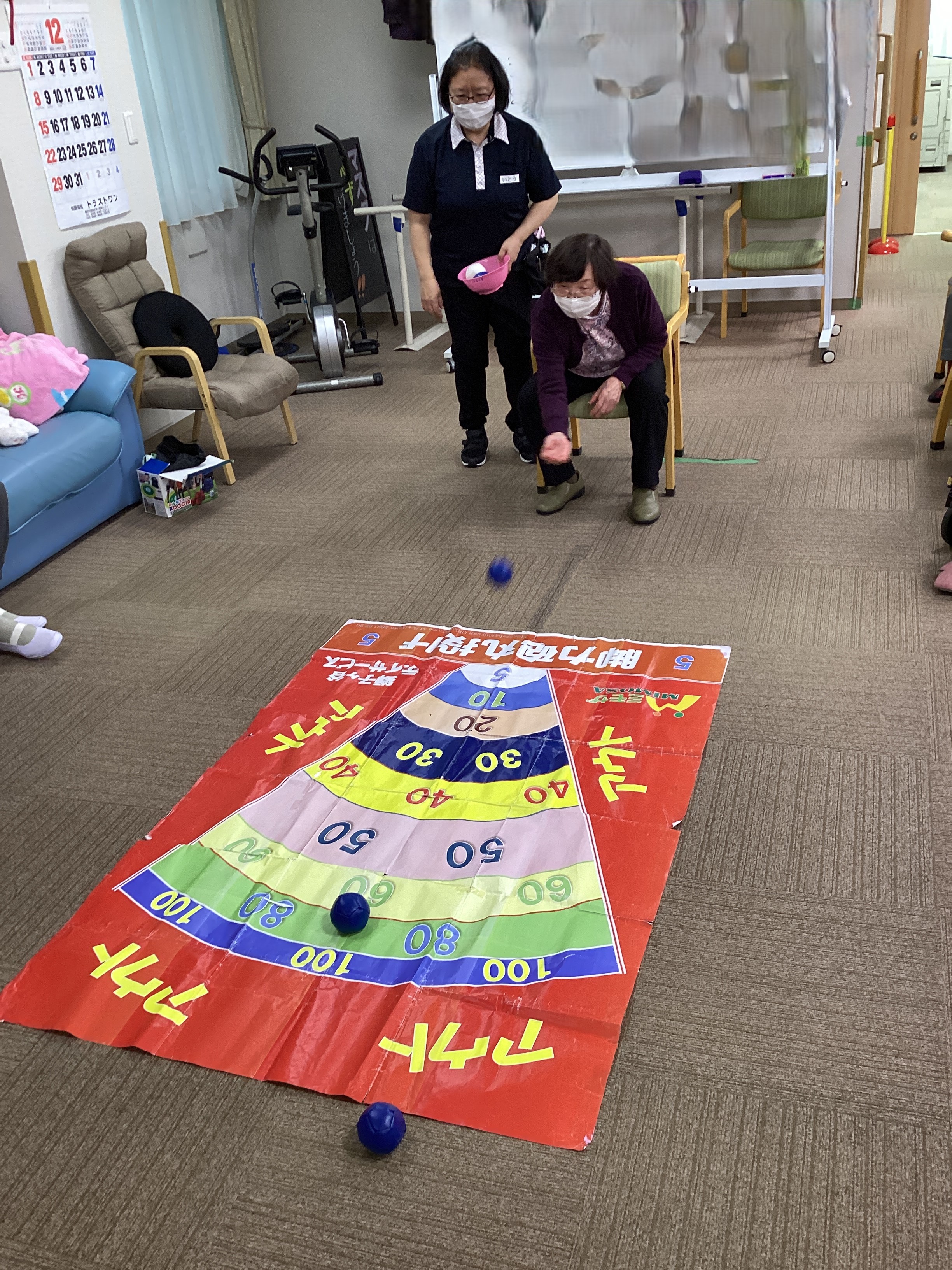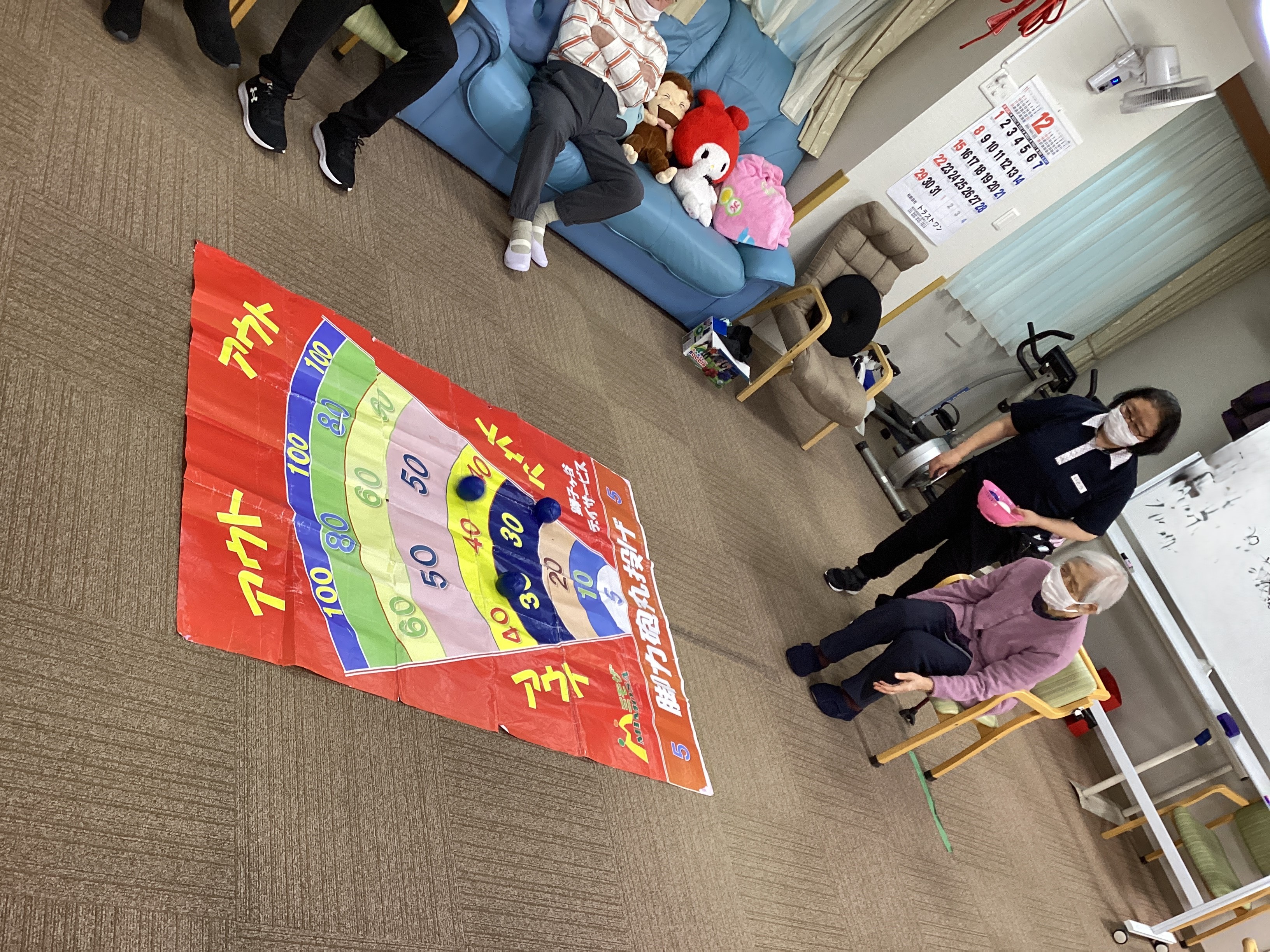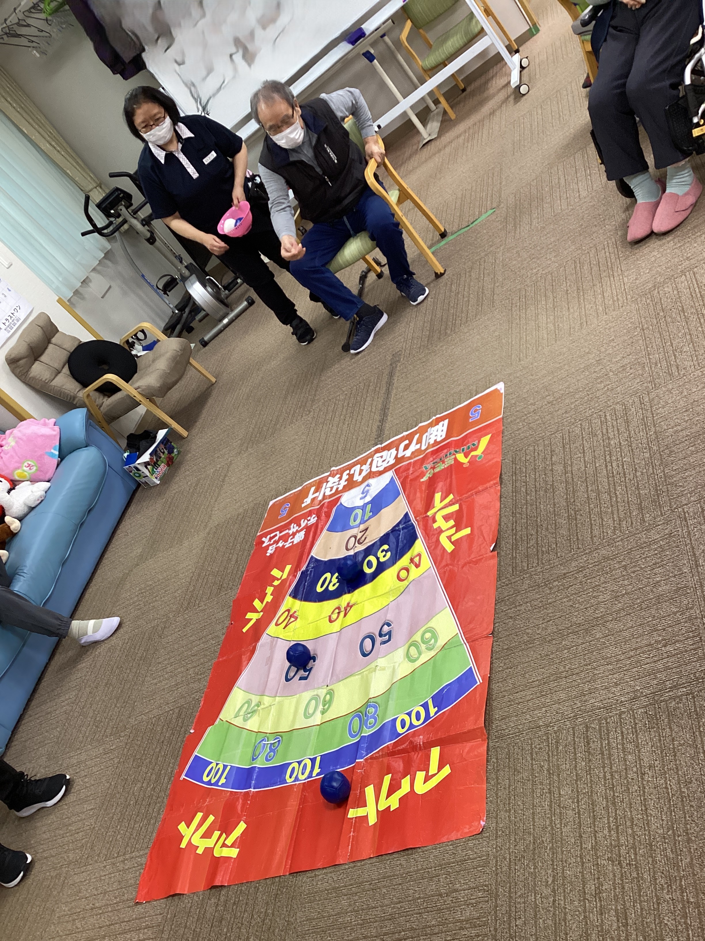 この日のレクリエーションはボッチャの球を転がして何点獲得出来るかをやりました。的の中に転がすのは意外と難しいよう。。。それでも高得点が続出でした❣