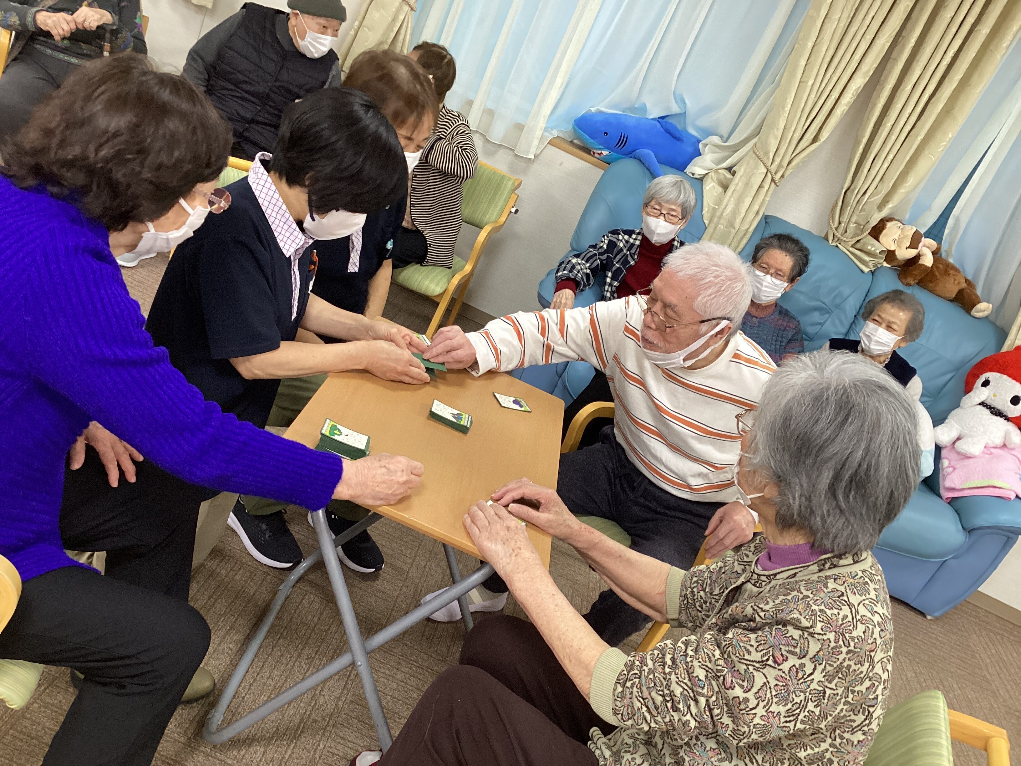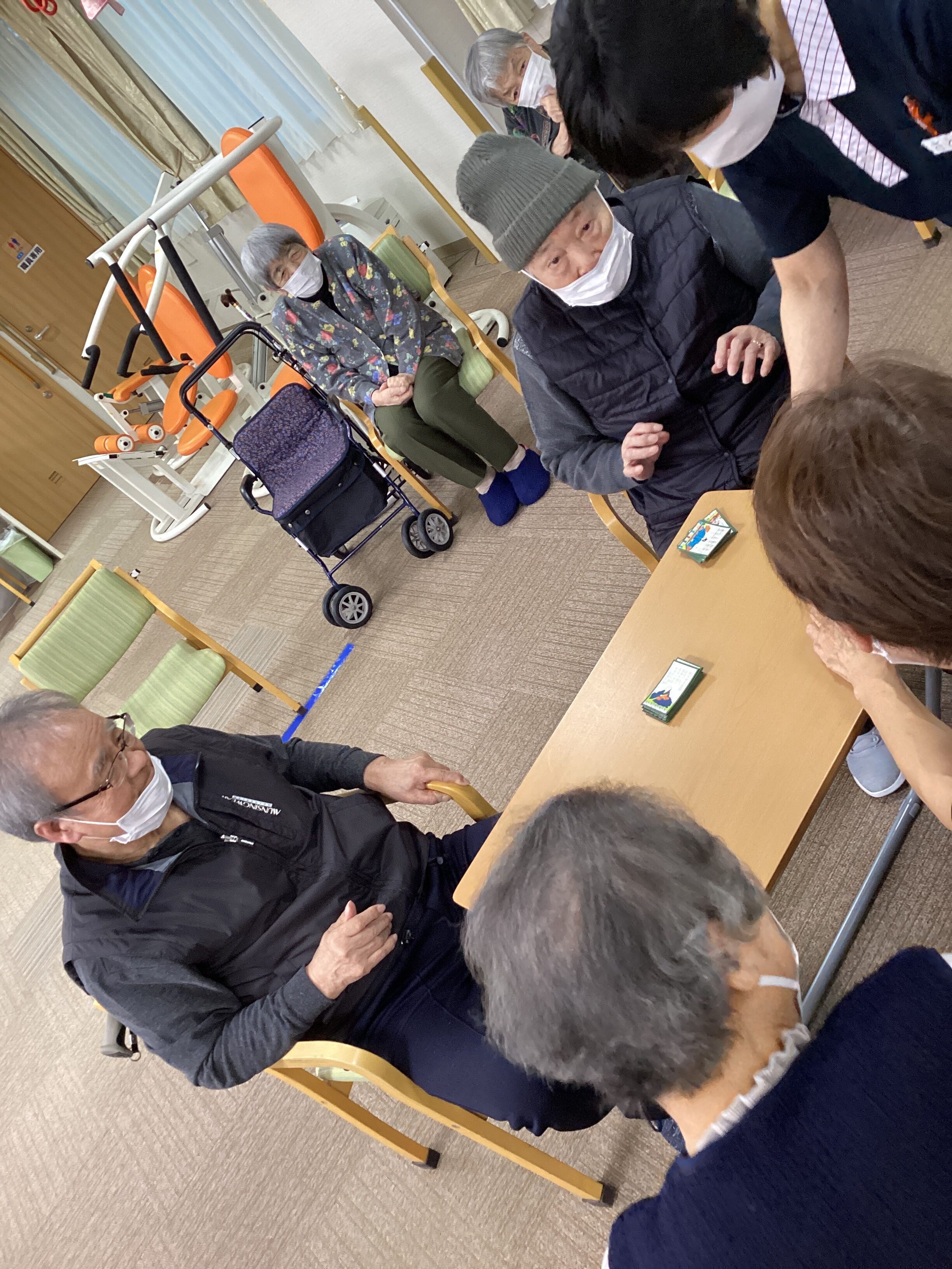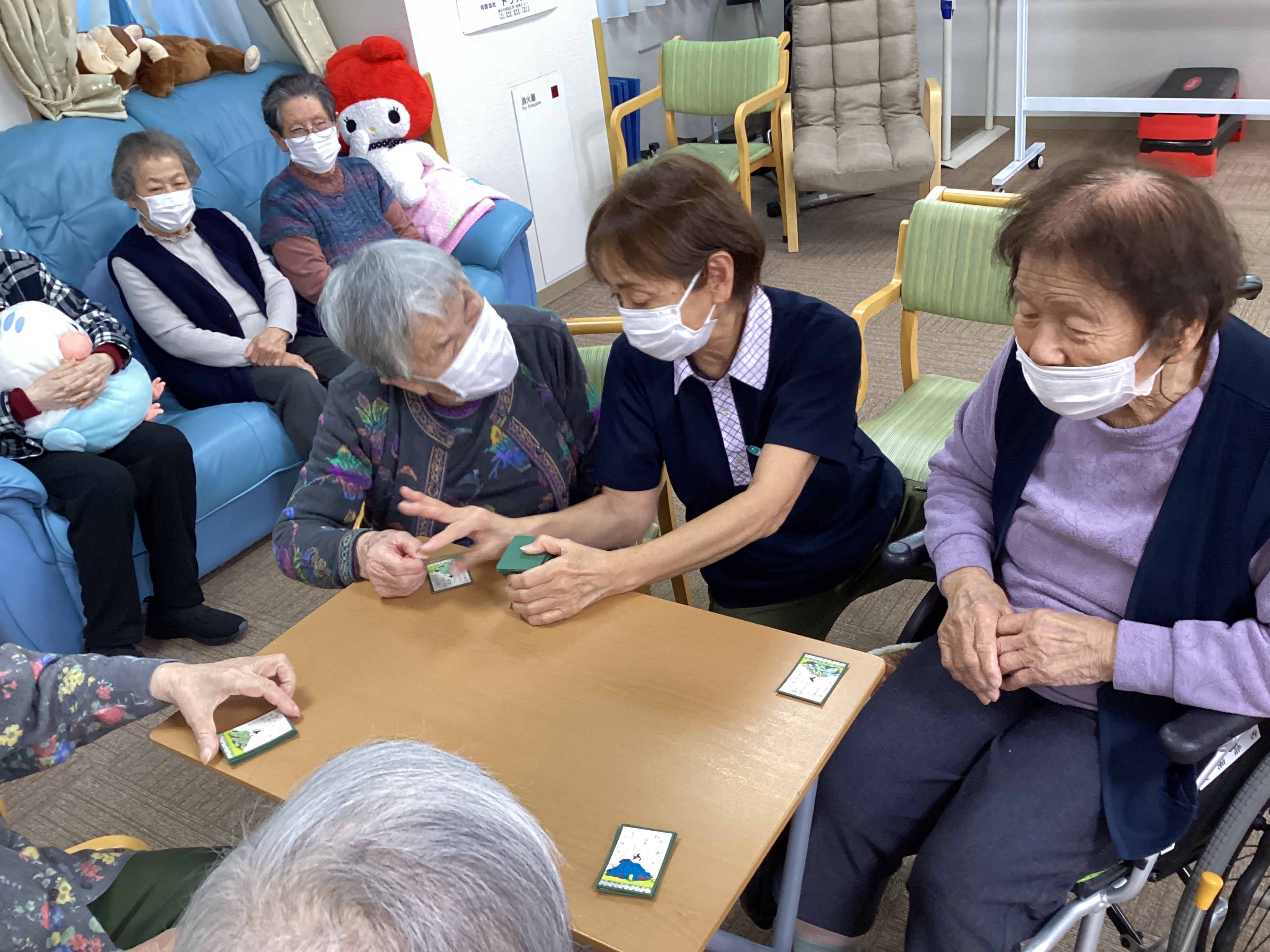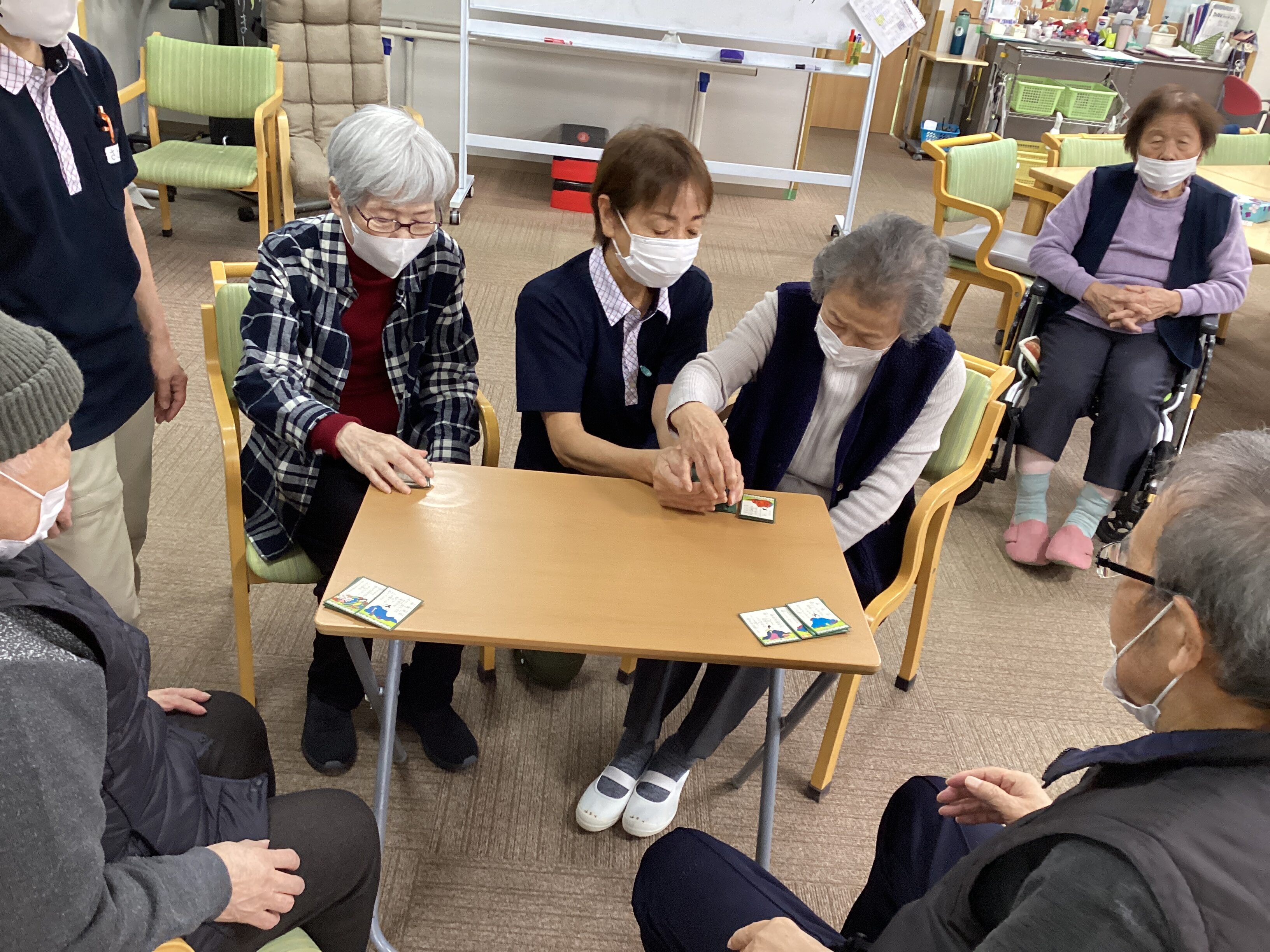 この日のレクリエーションは百人一首で「坊主めくり」でした。手元に沢山の札があったのに坊主が出て全て無くなってしまう(´;ω;`)札が増えたり減ったりで大盛り上がりでした😊
