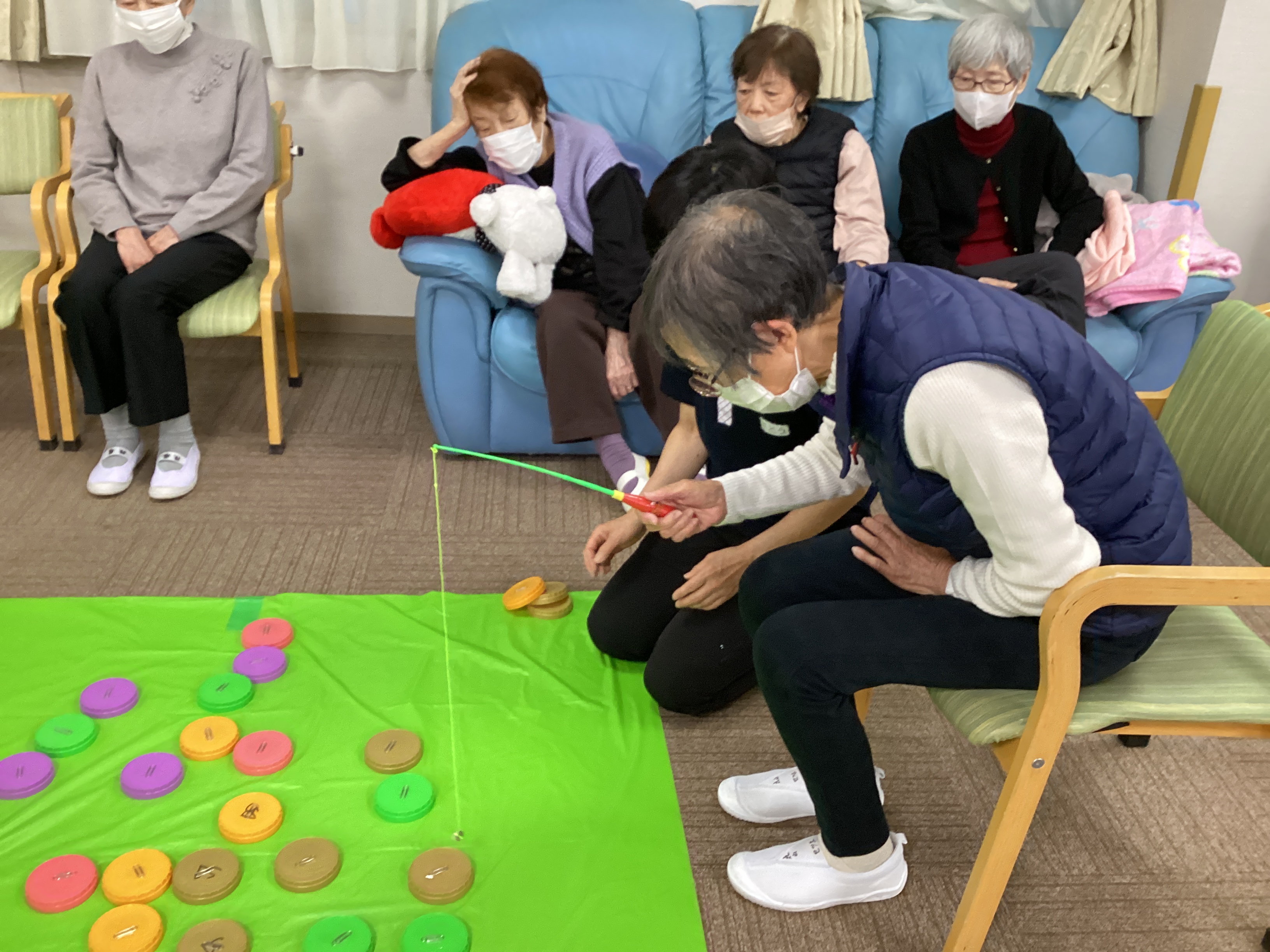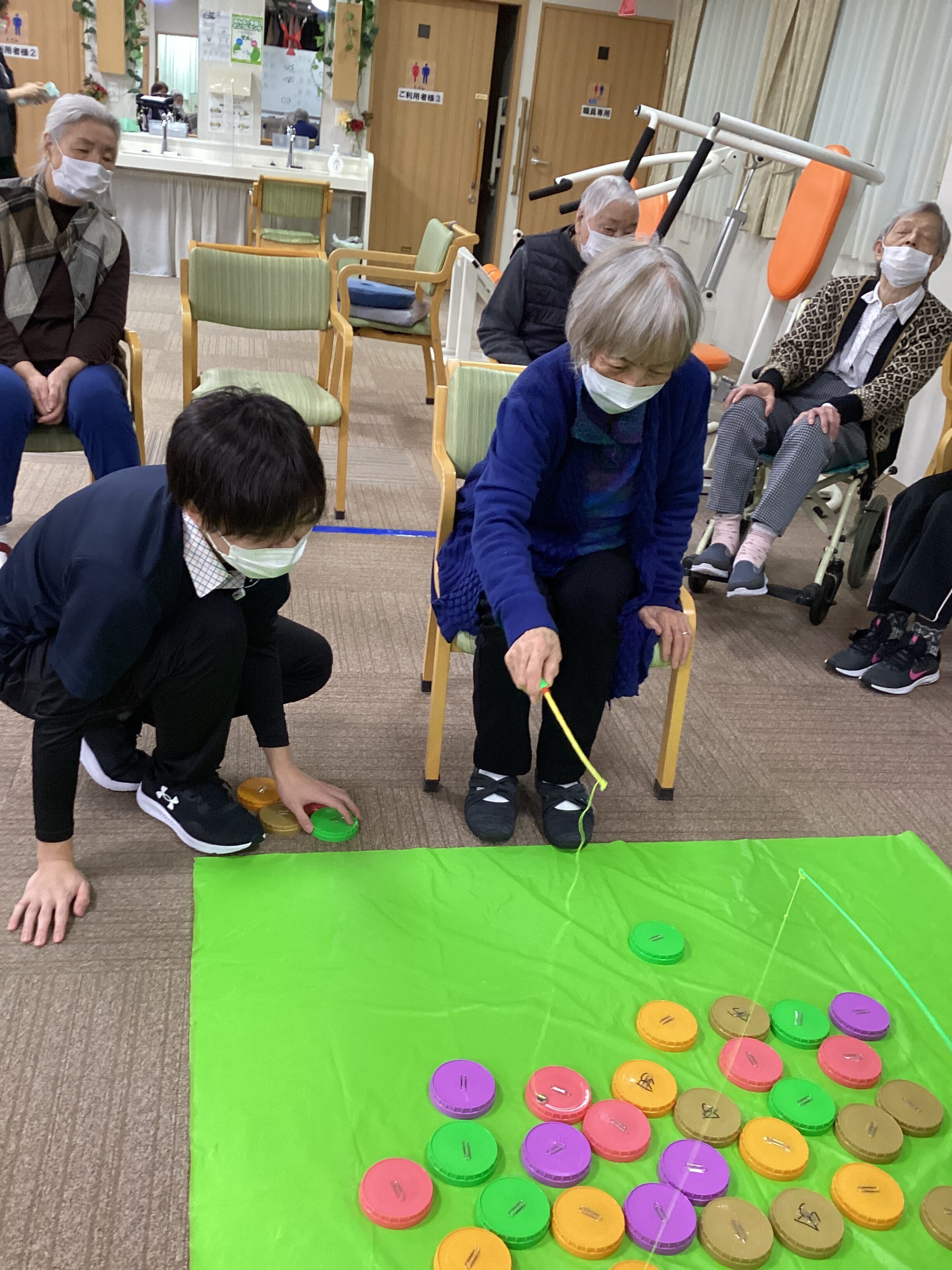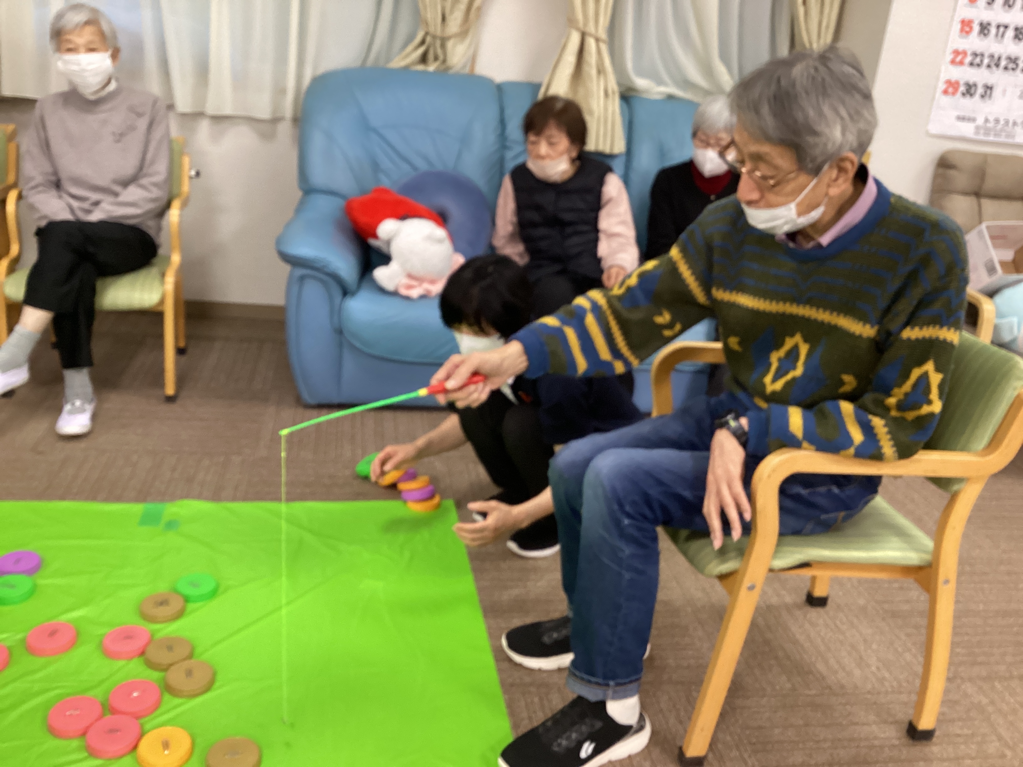 この日のレクリエーションは釣り。釣りと言っても蓋釣りです。蓋に付けたクリップを磁石でつけて釣り上げます。蓋の裏には点数が書いてあり釣ってみないと何点か分からない。腕だけでなく運がついてれば高得点✨