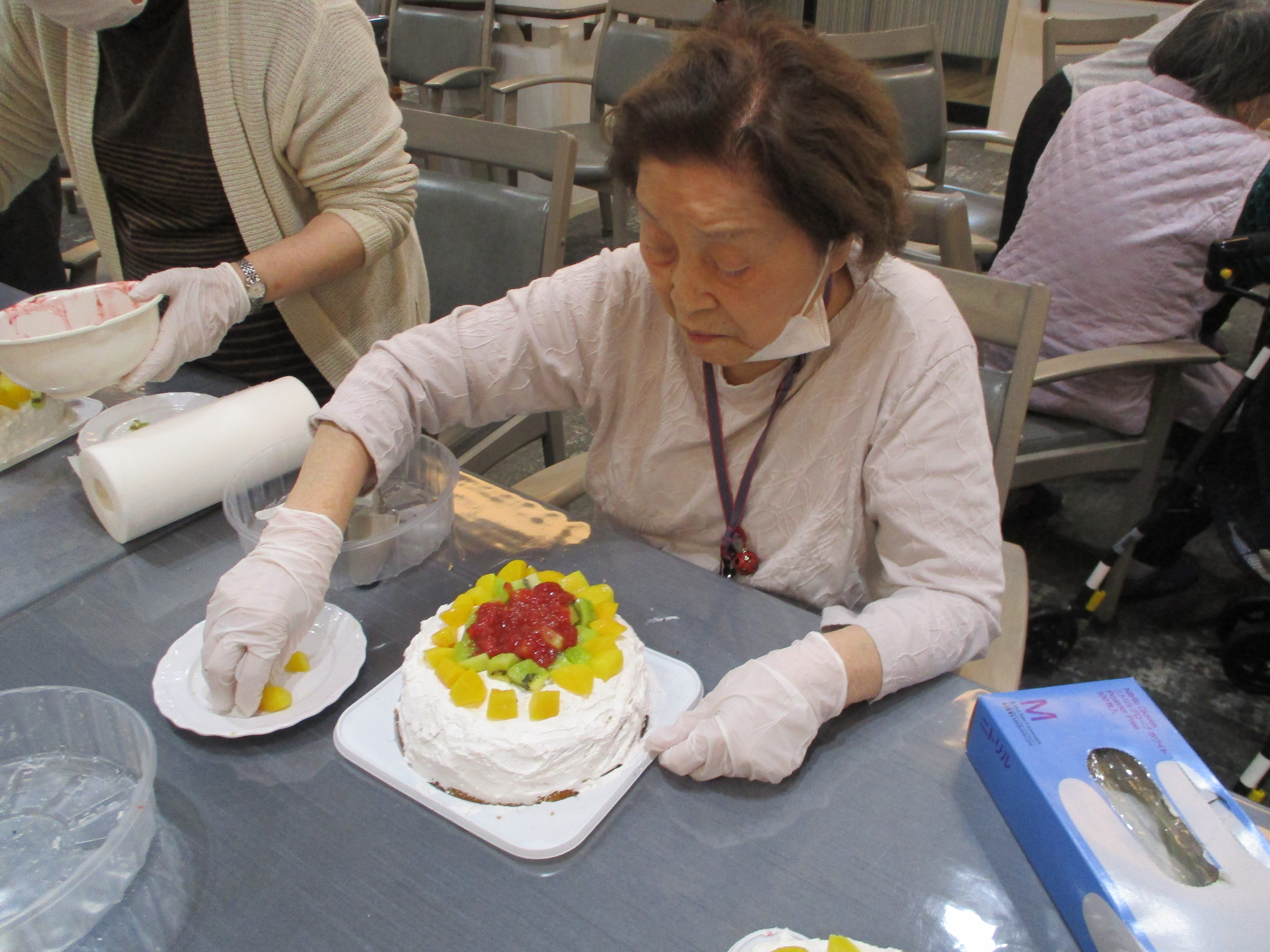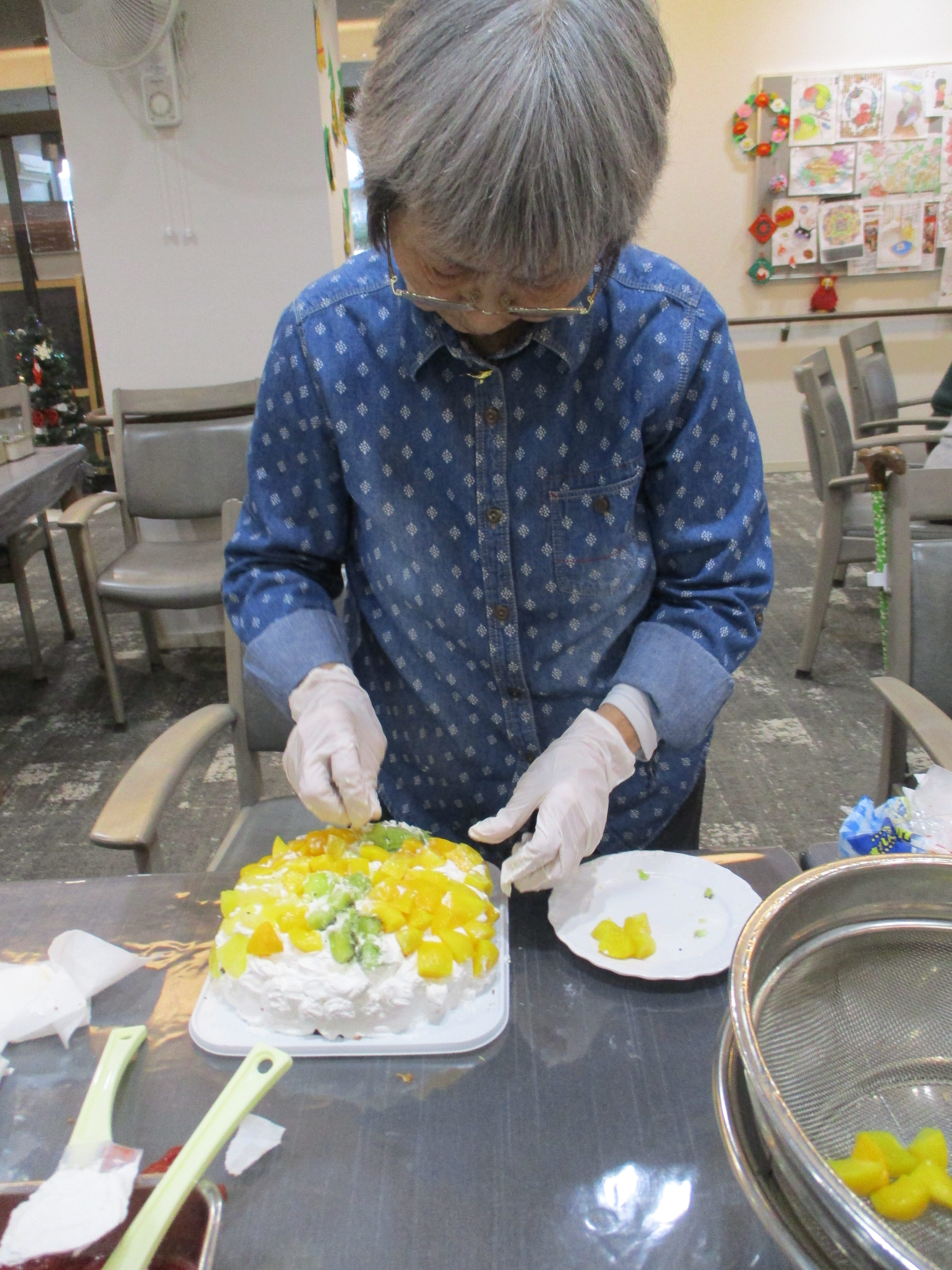 明日のクリスマス会の準備でケーキを作りました!フルーツ盛りだくさん!食べるのが楽しみ!!