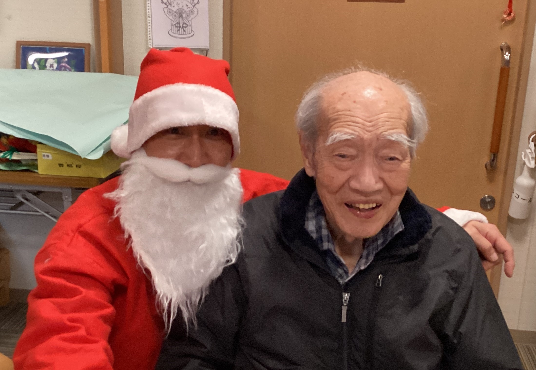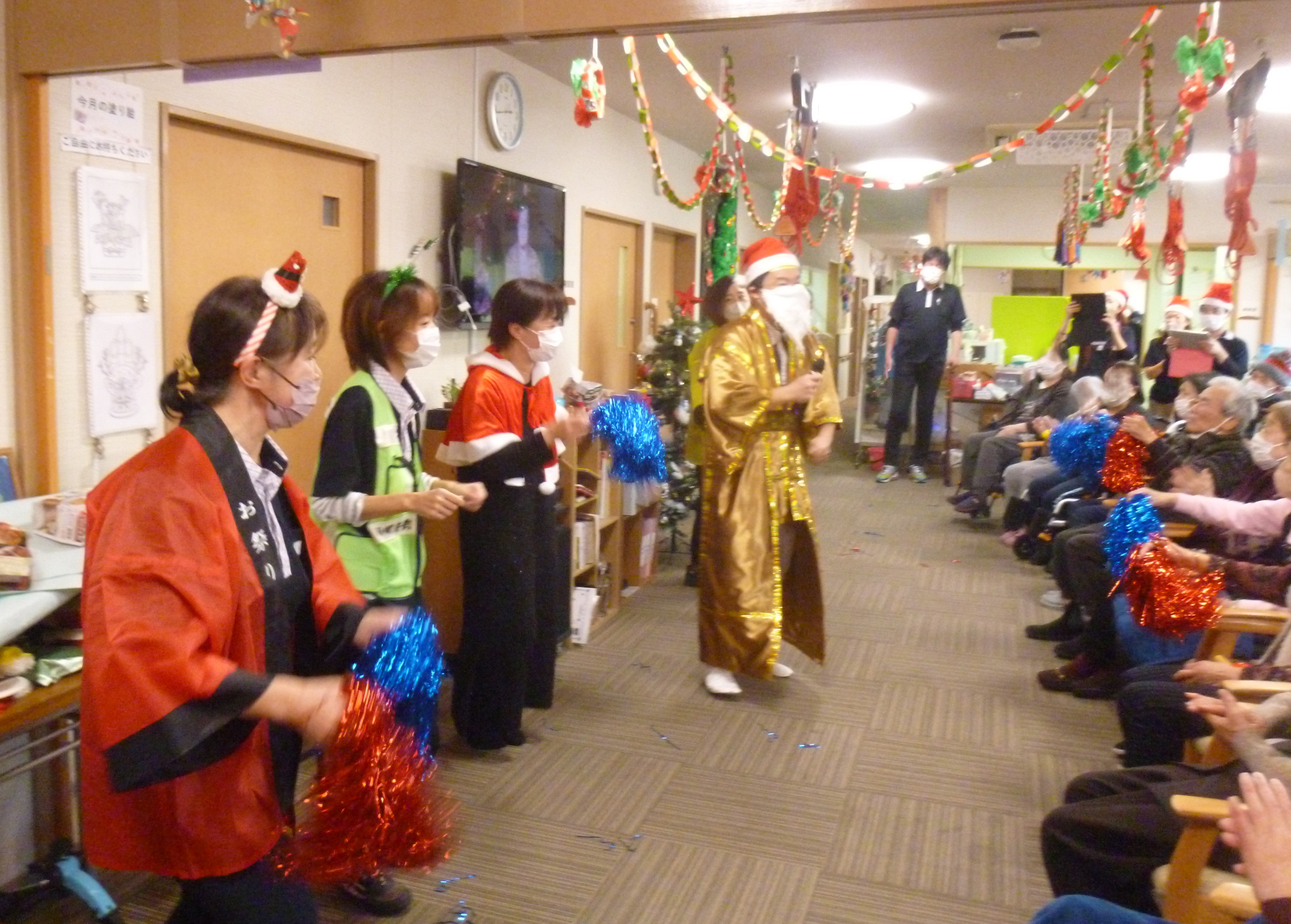 お隣の小規模多機能施設と合同でクリスマス会を行いました。 職員の出し物としてマツケンサンバを踊ったり、フルート演奏によるクリスマスソングを歌ったり、皆さん大盛り上がりでした。最後は、サンタの登場でクリスマスプレゼントを貰って喜んでいました。