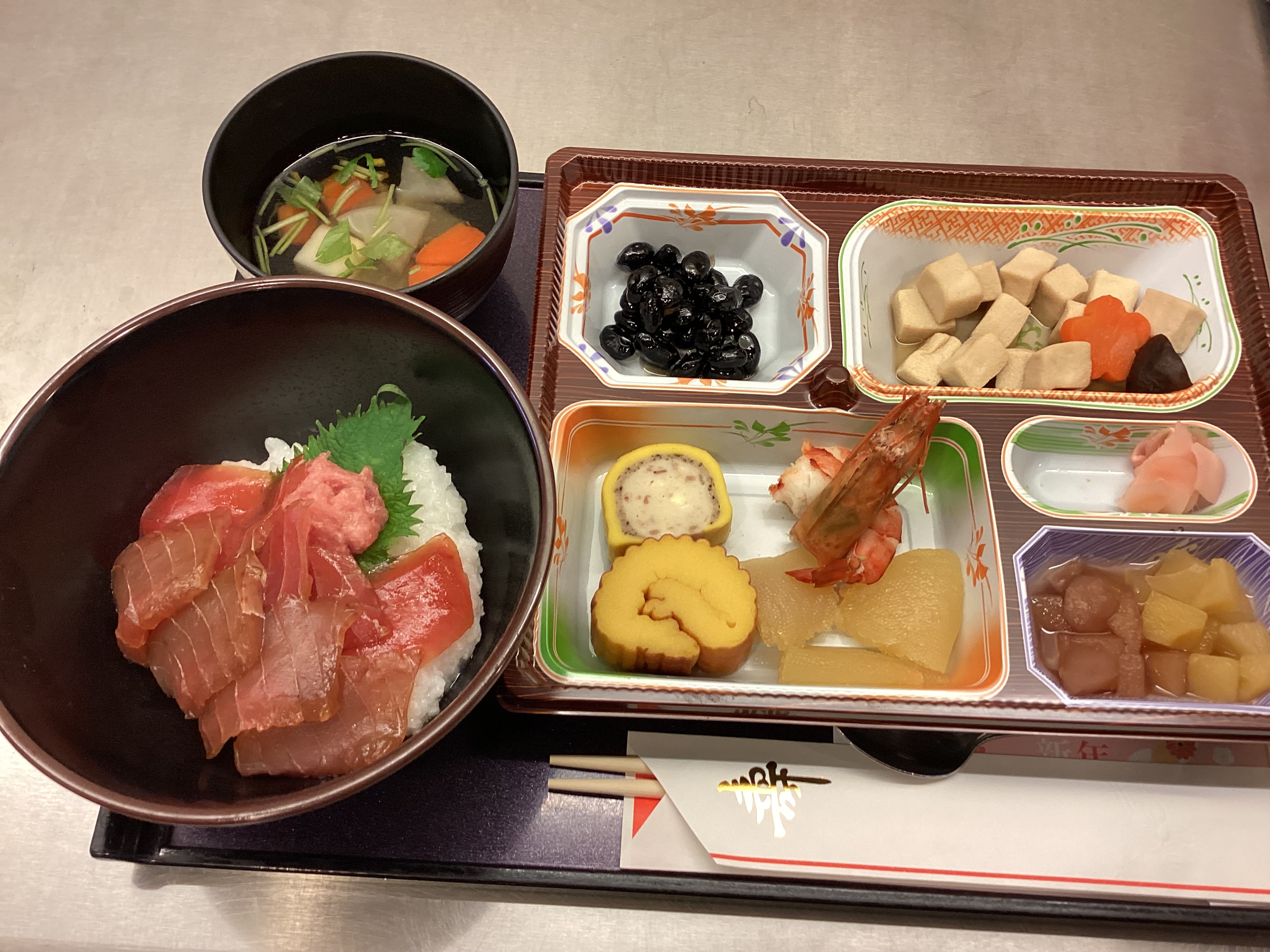 明けましておめでとうございます。本年もどうぞよろしくお願いいたします。今日のお昼は豪華におせちとマグロ丼でした。そして西六郷では絵馬に皆さんの願い事を書いて頂きました。お越しの際は是非見てみてください。