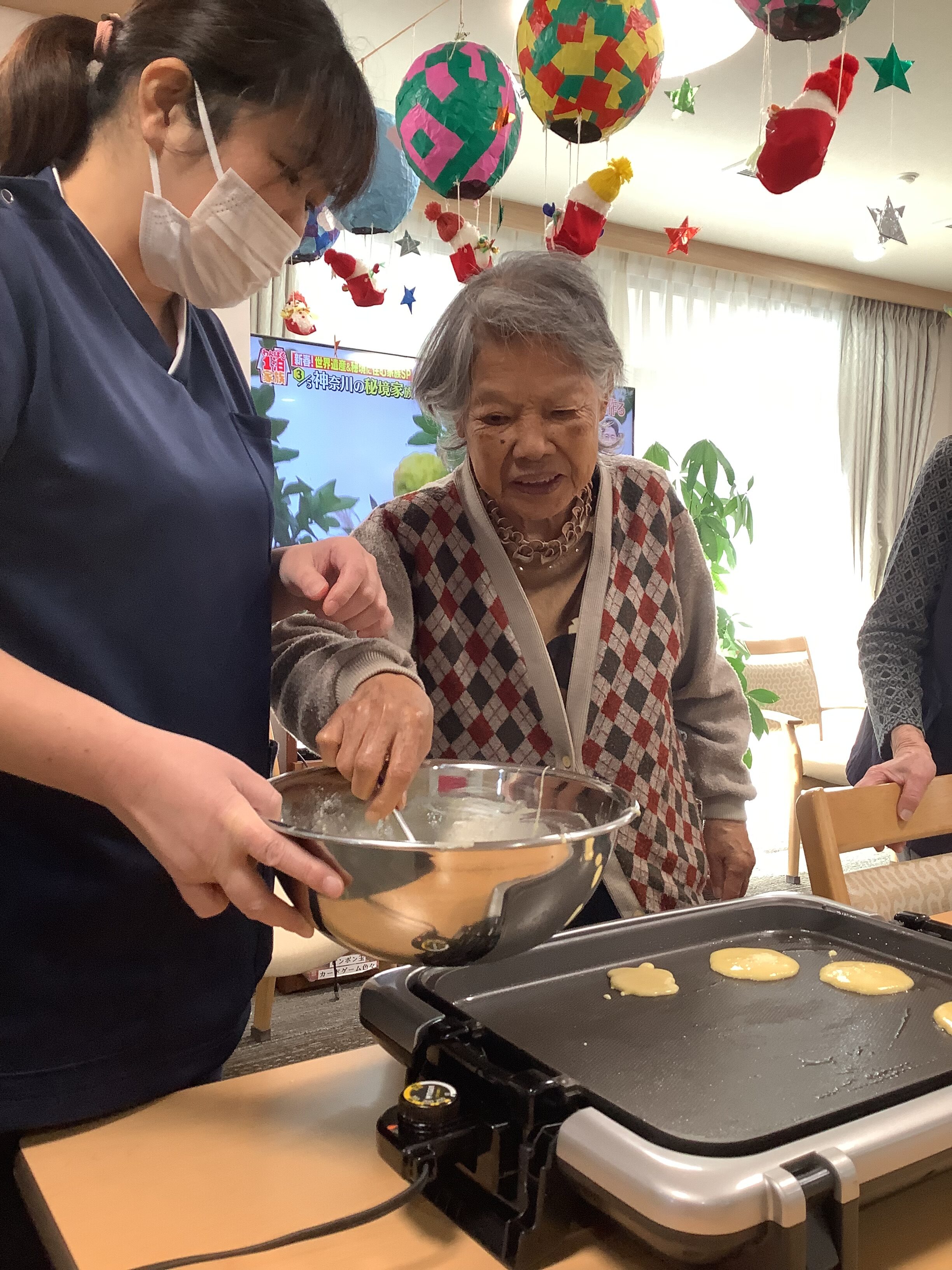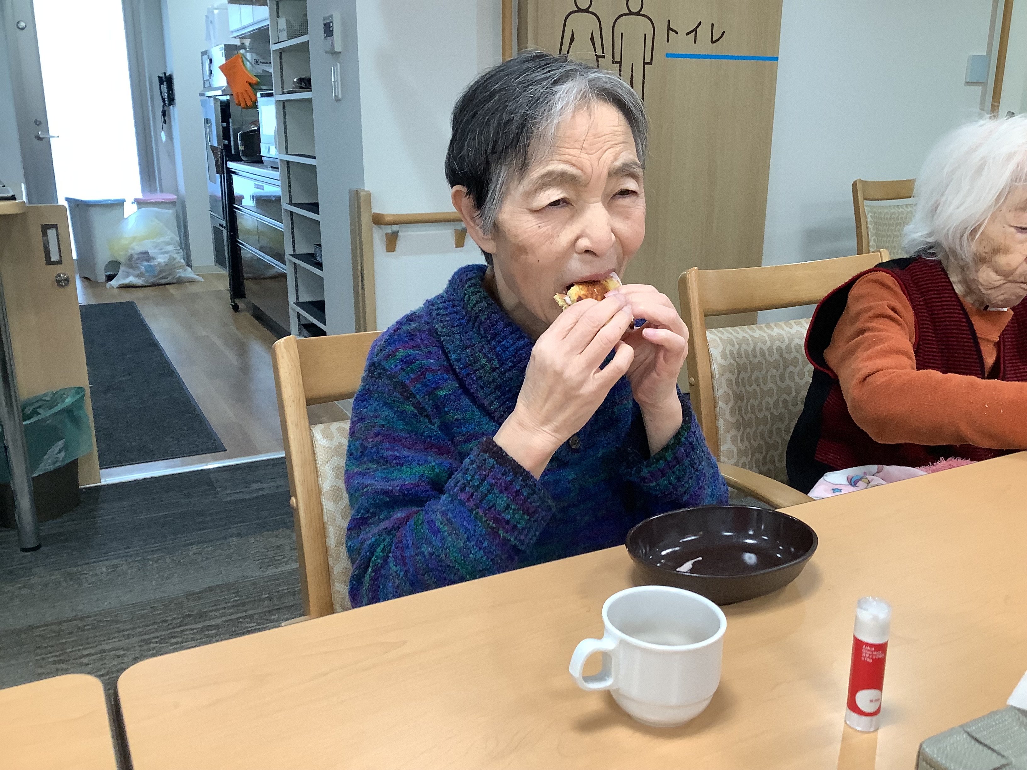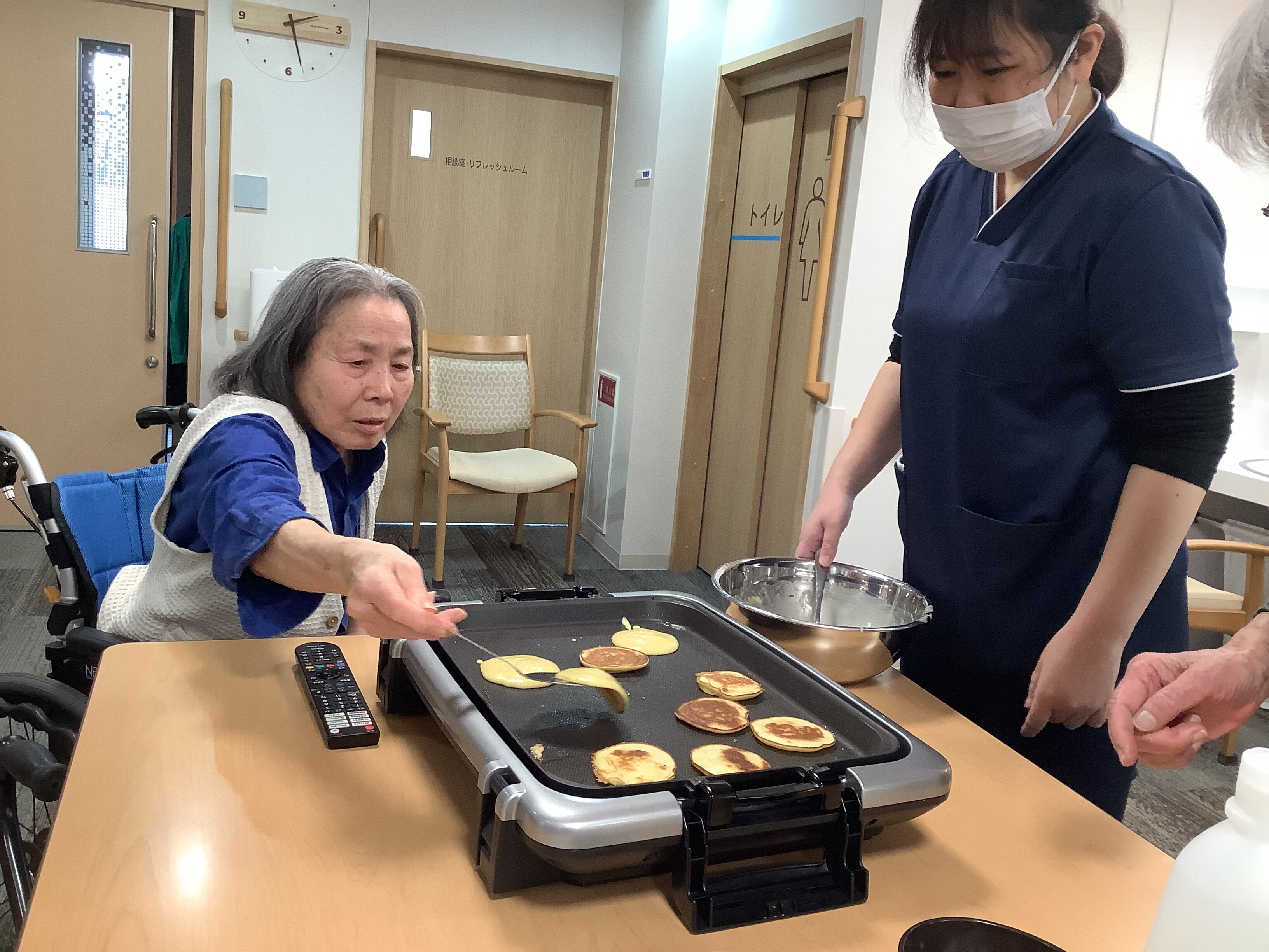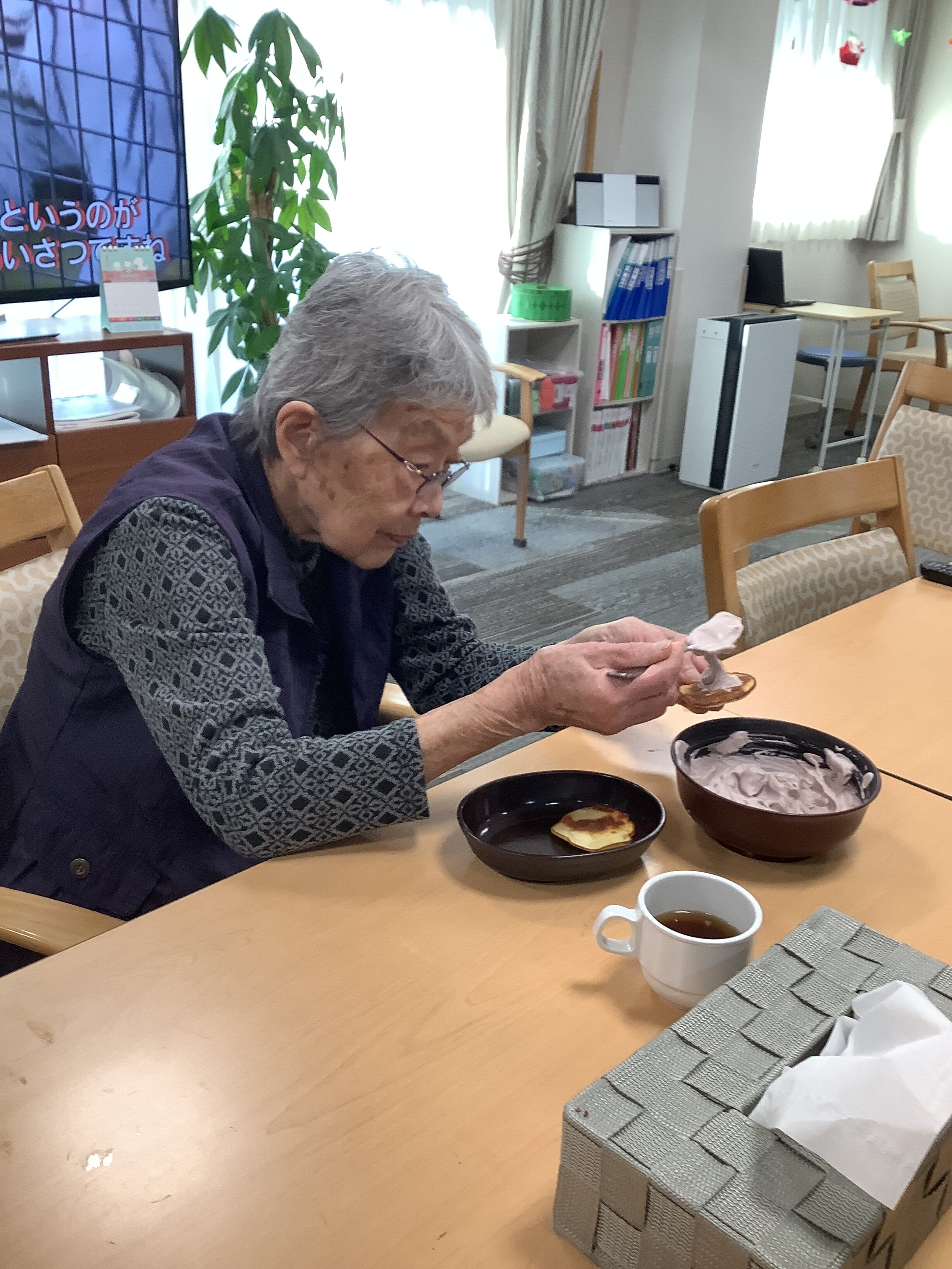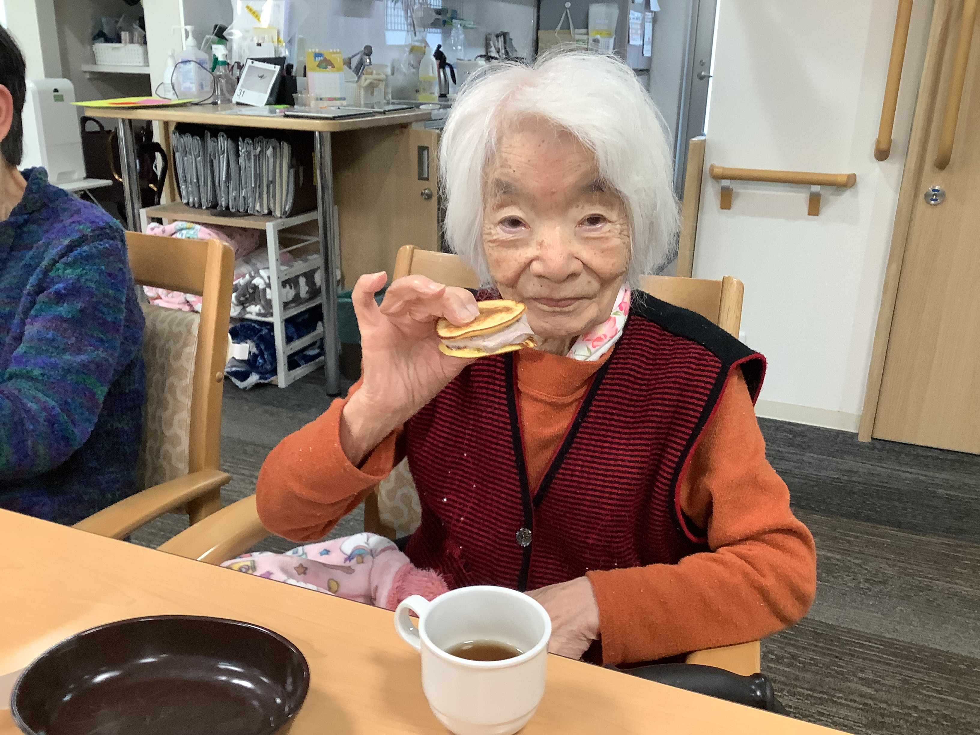 お正月はゆっくりおやつ作りをしました。ホットプレートでどら焼きを作っています。焼いたり挟んだり、楽しい時間を過ごしました。
