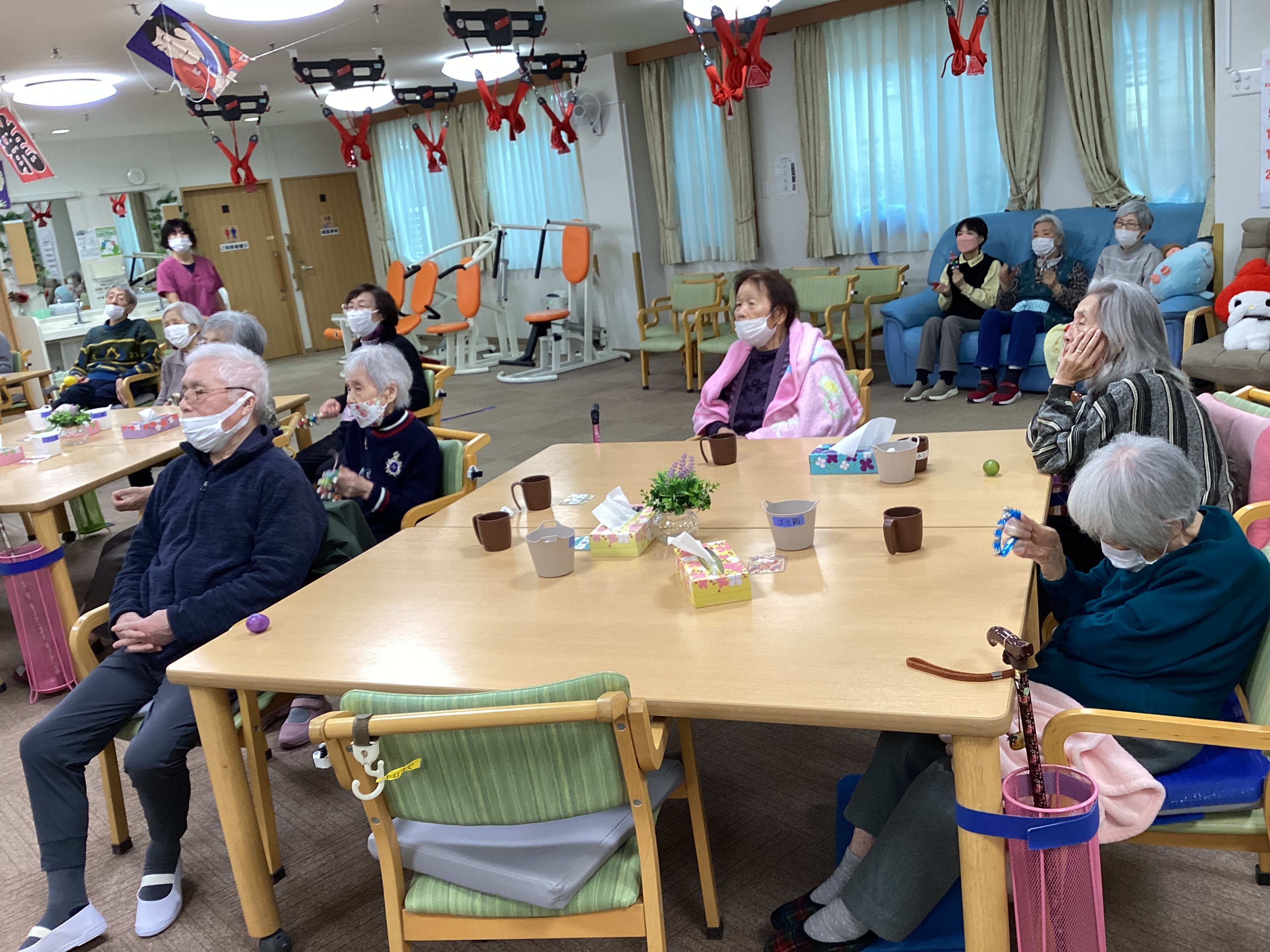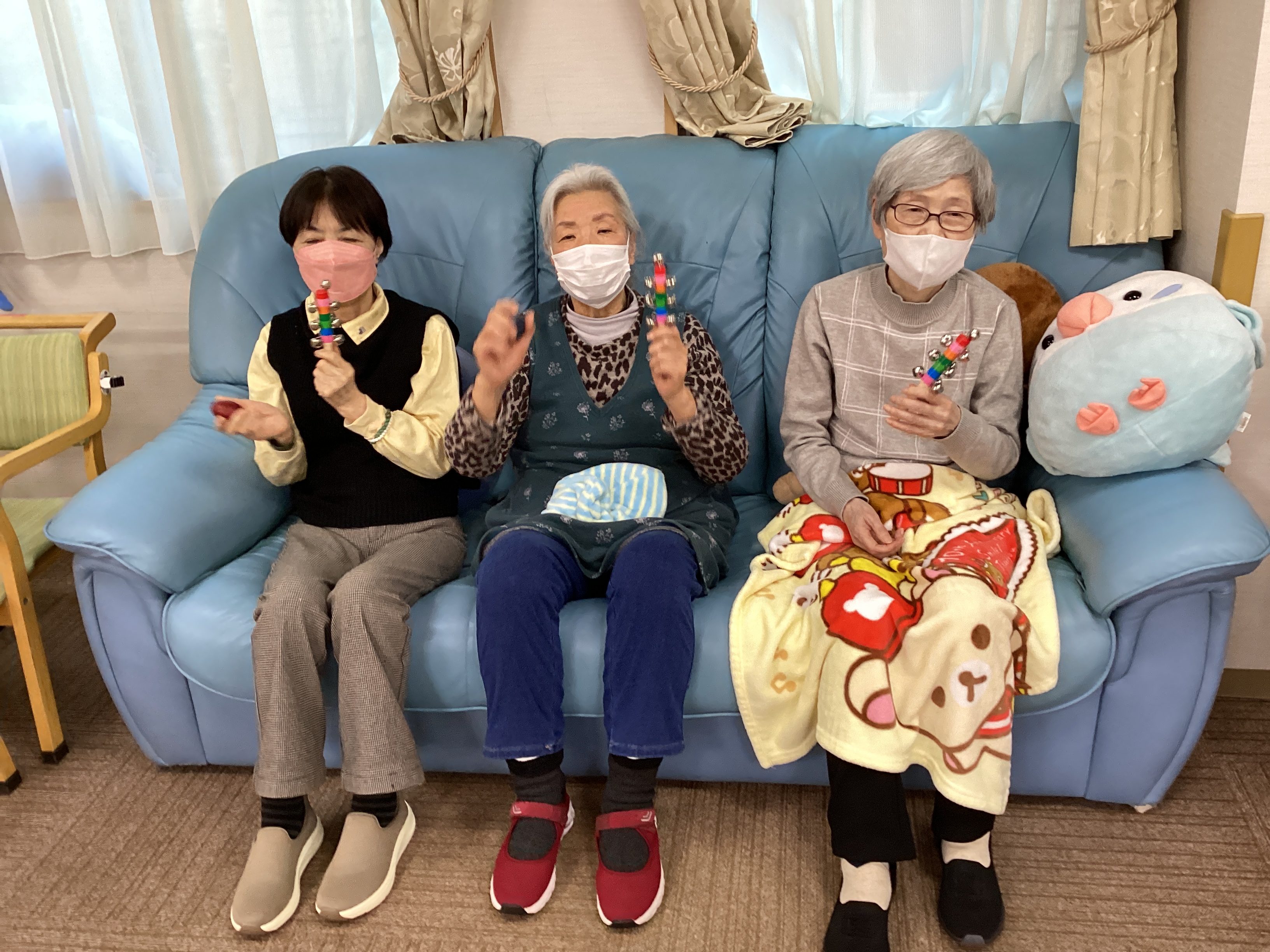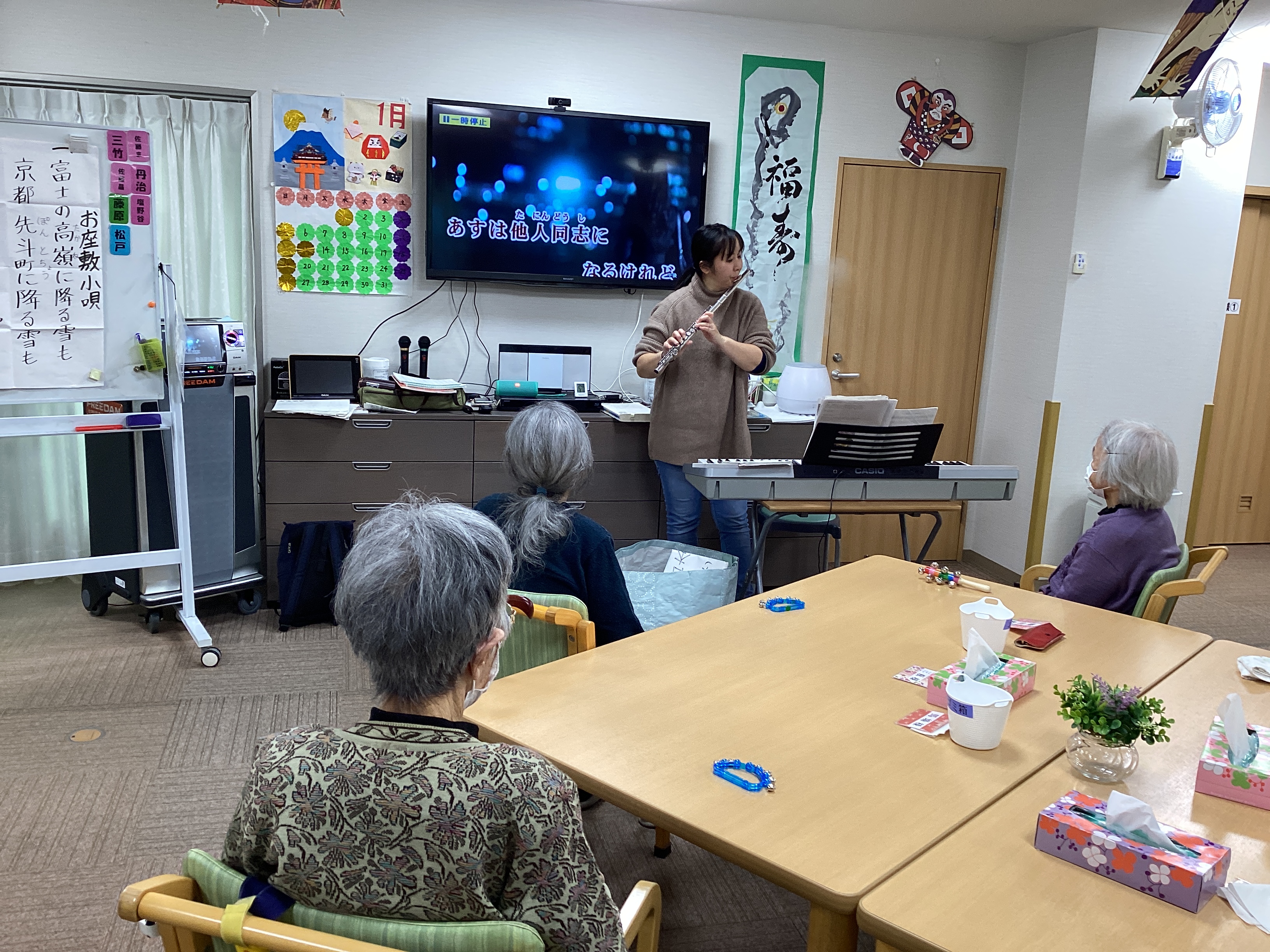 今年初めての音楽療法でした。まずは音楽に合わせて歌いながら体を動かして温めます。皆で津軽海峡冬景色を歌いながら楽器を鳴らしてリズムをとります。知ってる歌ばかりで楽しめましたね🎵最後は先生のフルートをでうっとりしました🎵