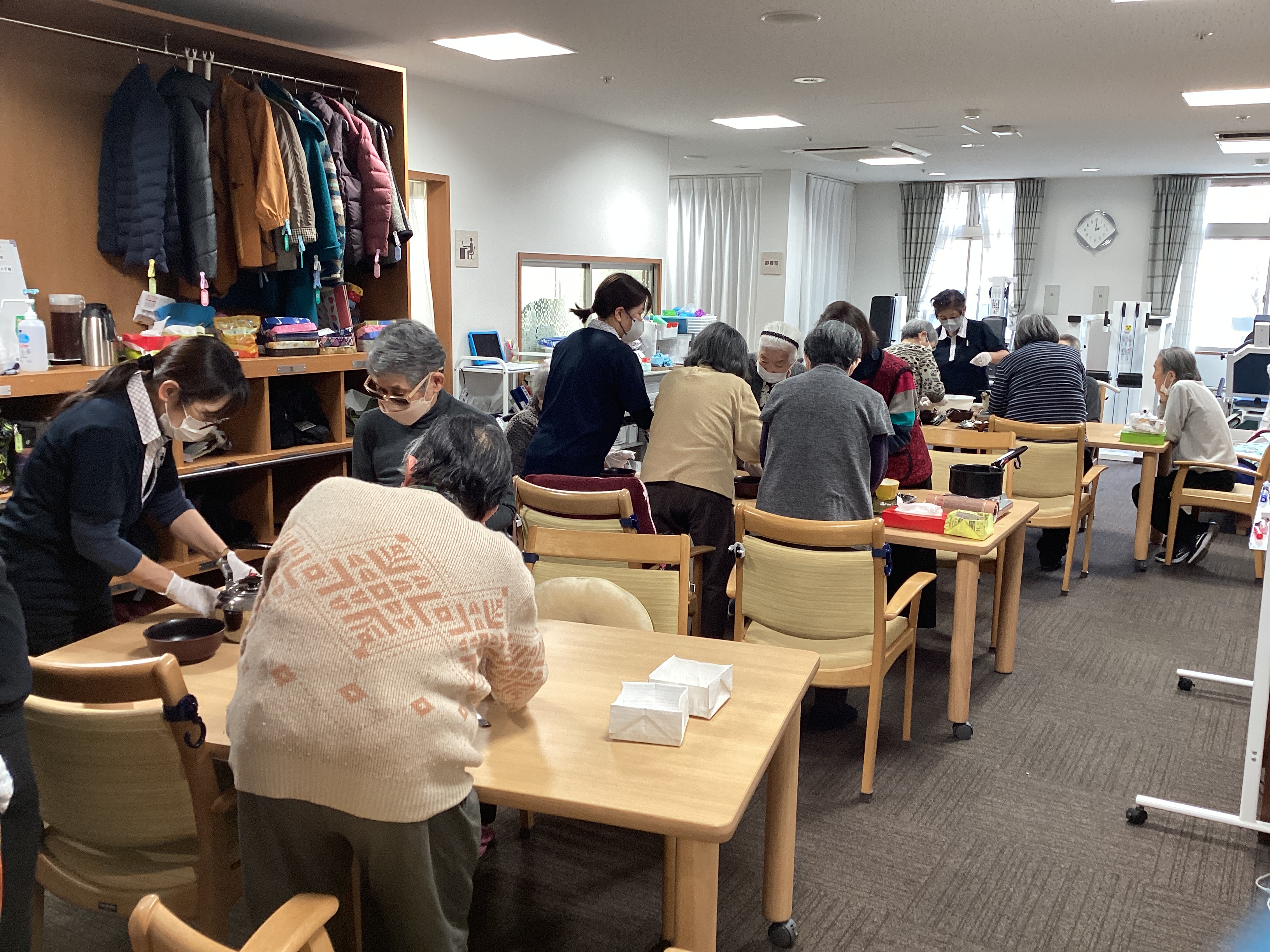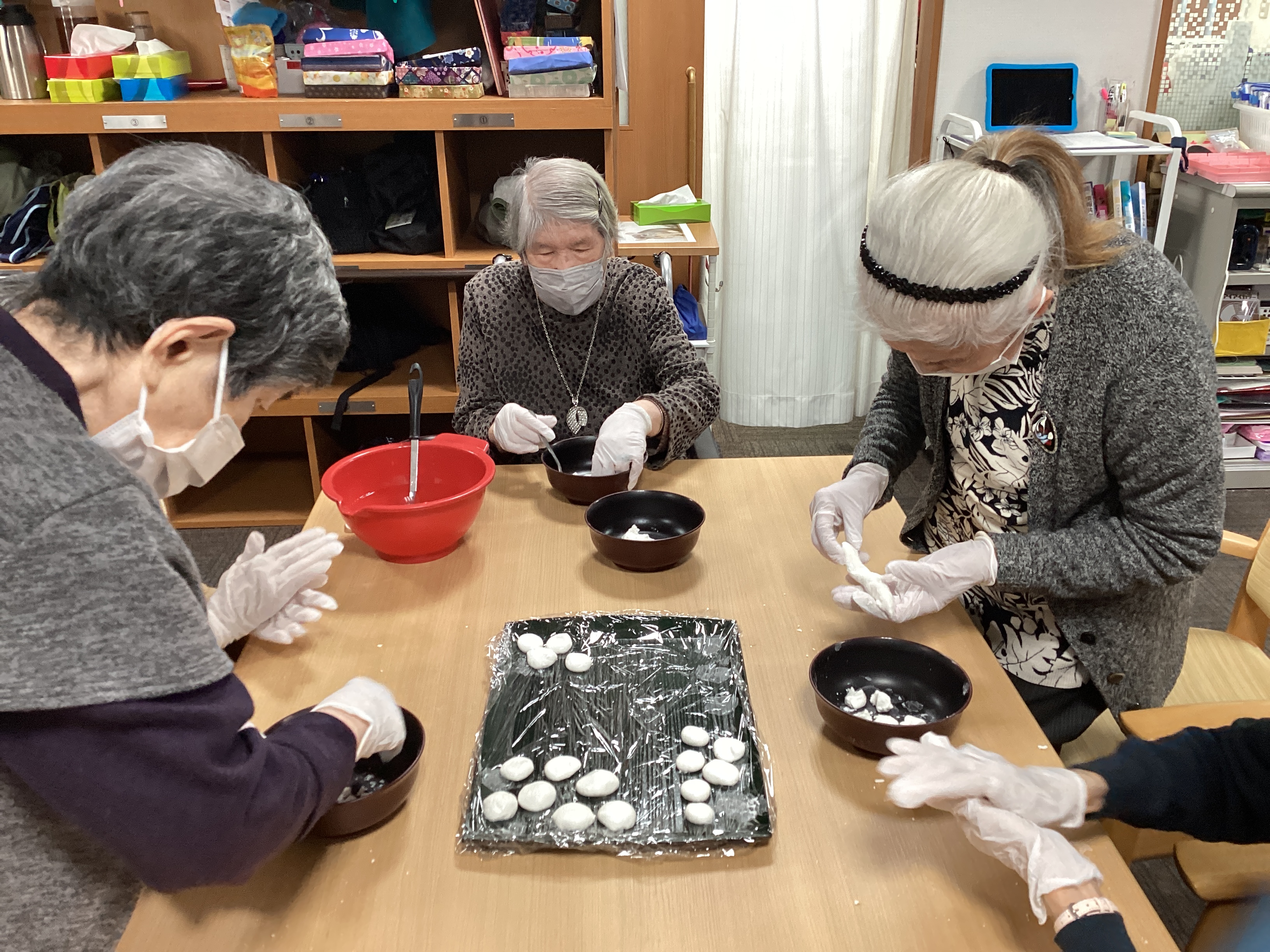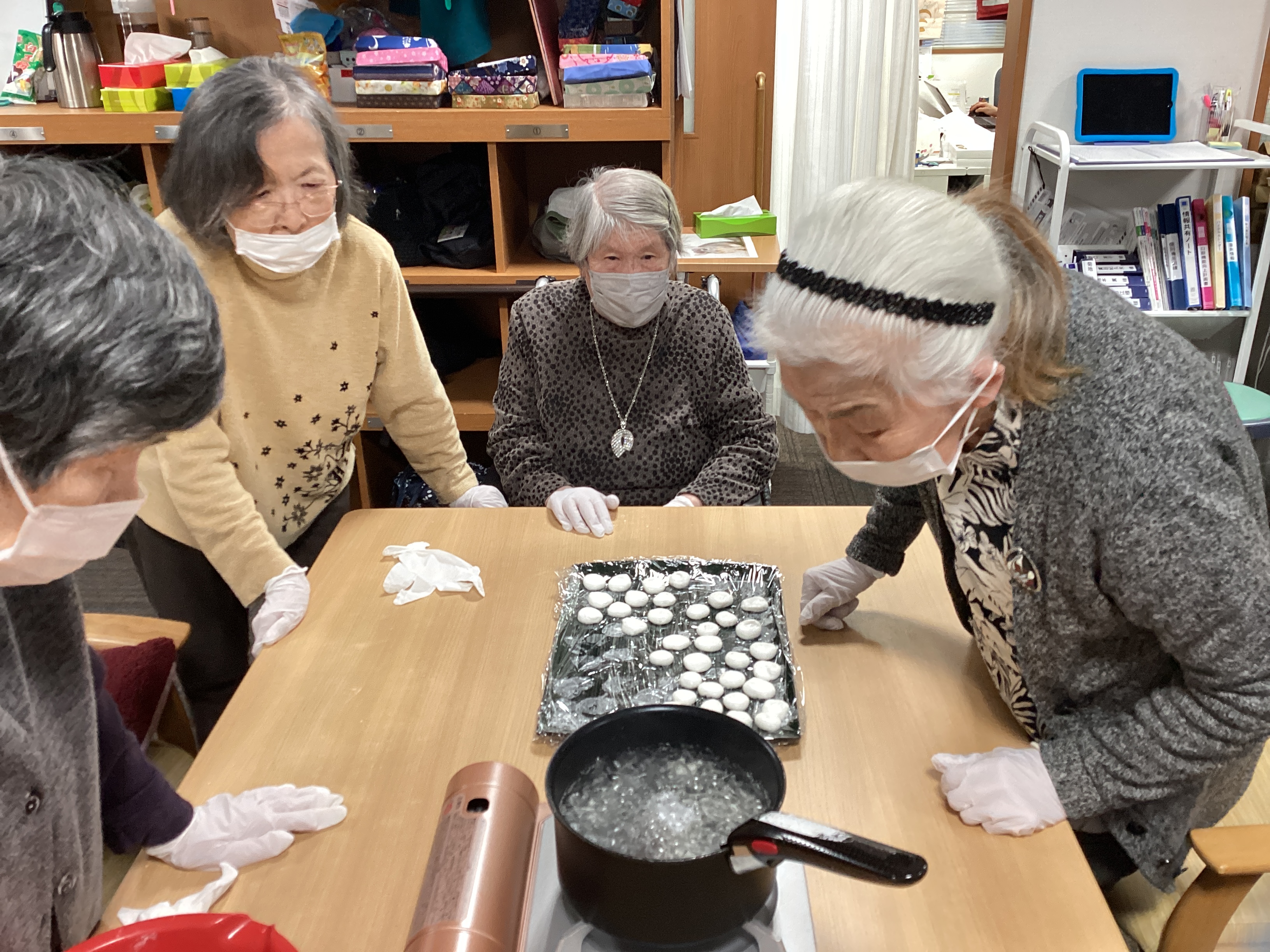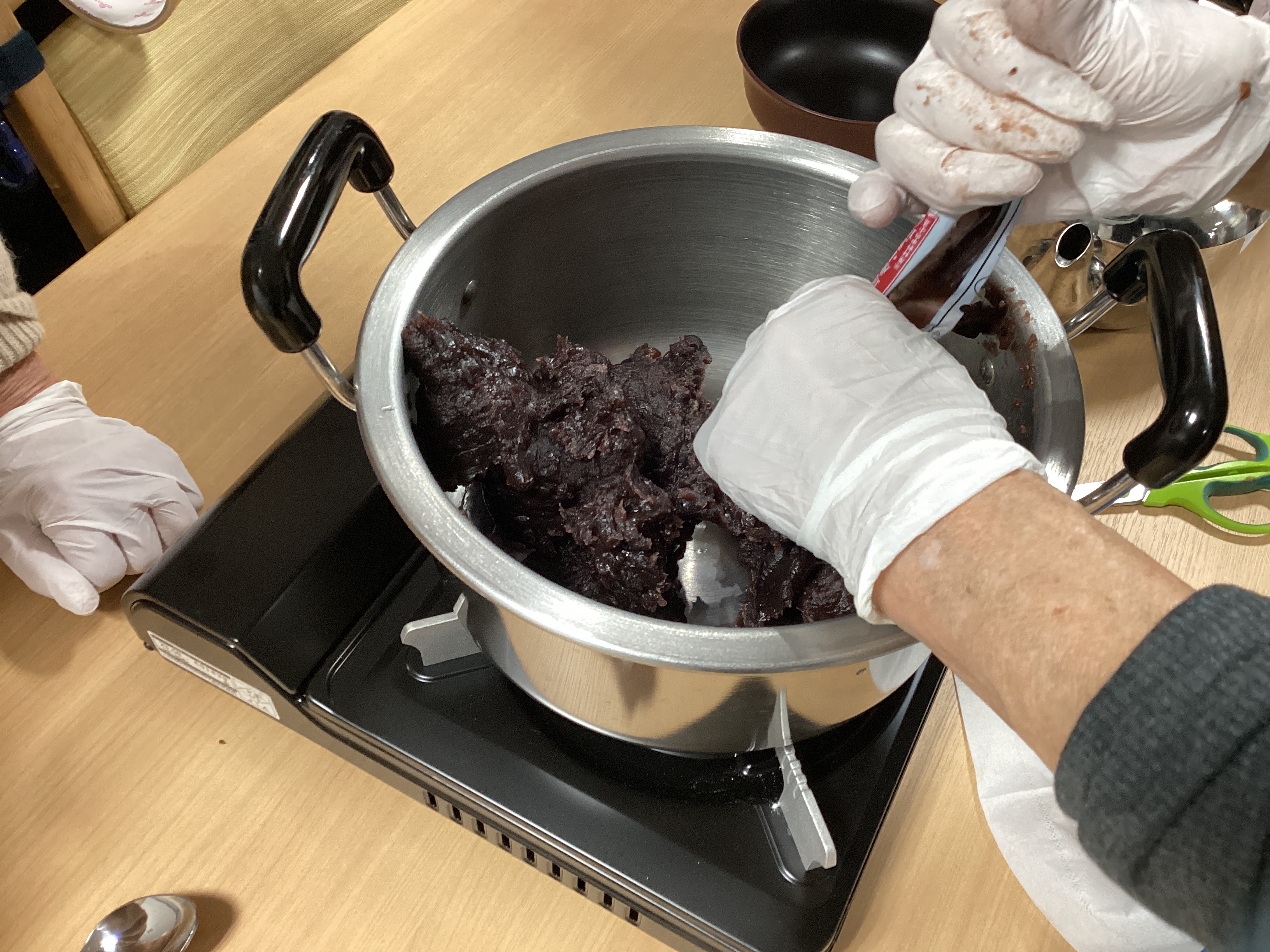 白玉ぜんざいを作りました☆  白玉を作るチーム、あんこを伸ばしてお汁を作るチーム、『味見の係です!』とおっしゃるチームwwに分かれておこないました!(^^)!  ほどよい大きさにそろえるのが難しく、協力しながらできました~☆とても美味しかったです‼