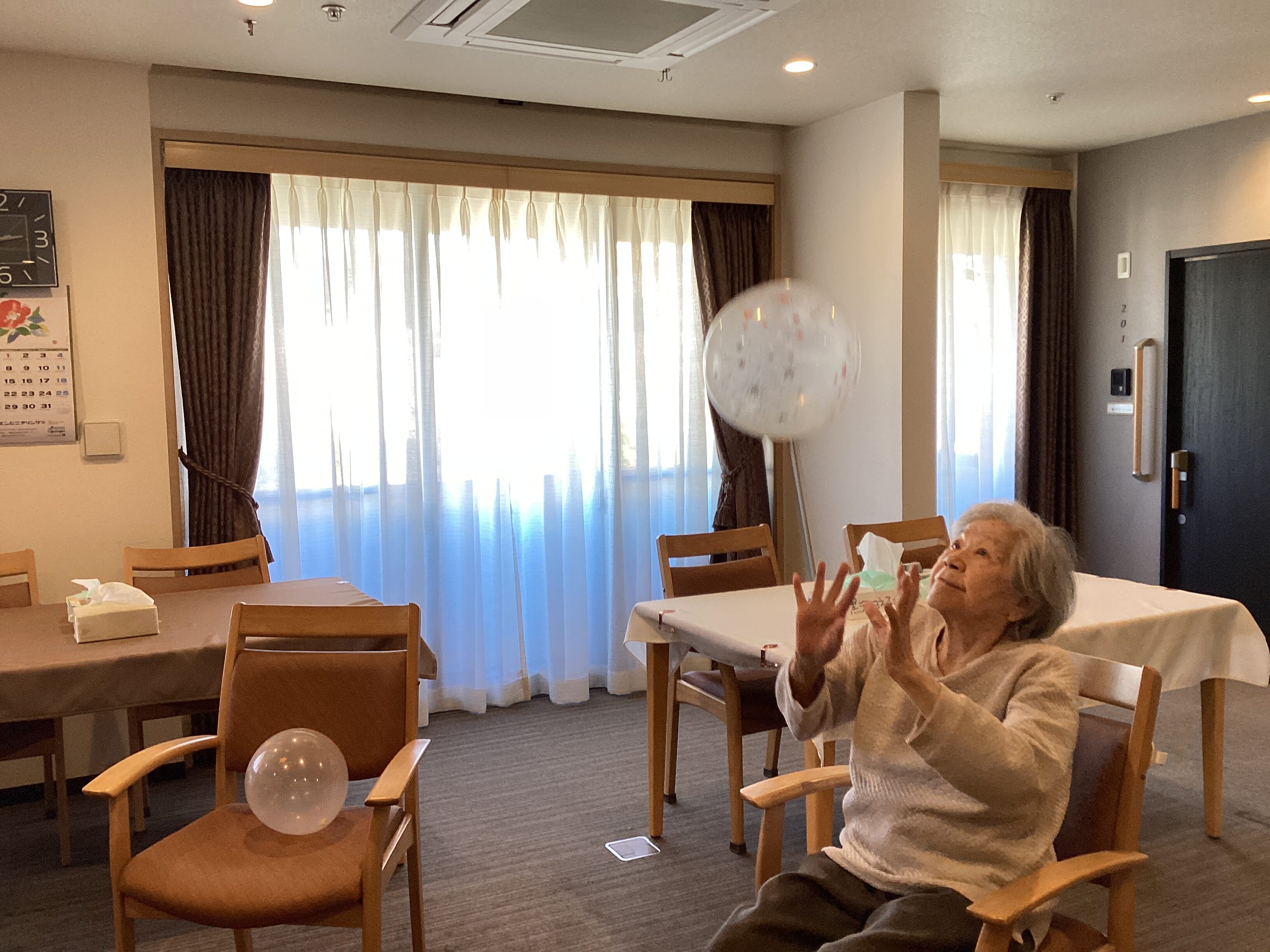 本日のレクは、座ったままで楽しめる風船バレー! 自然と笑い声が聞こえ、想像以上に楽しんでいただけました😊