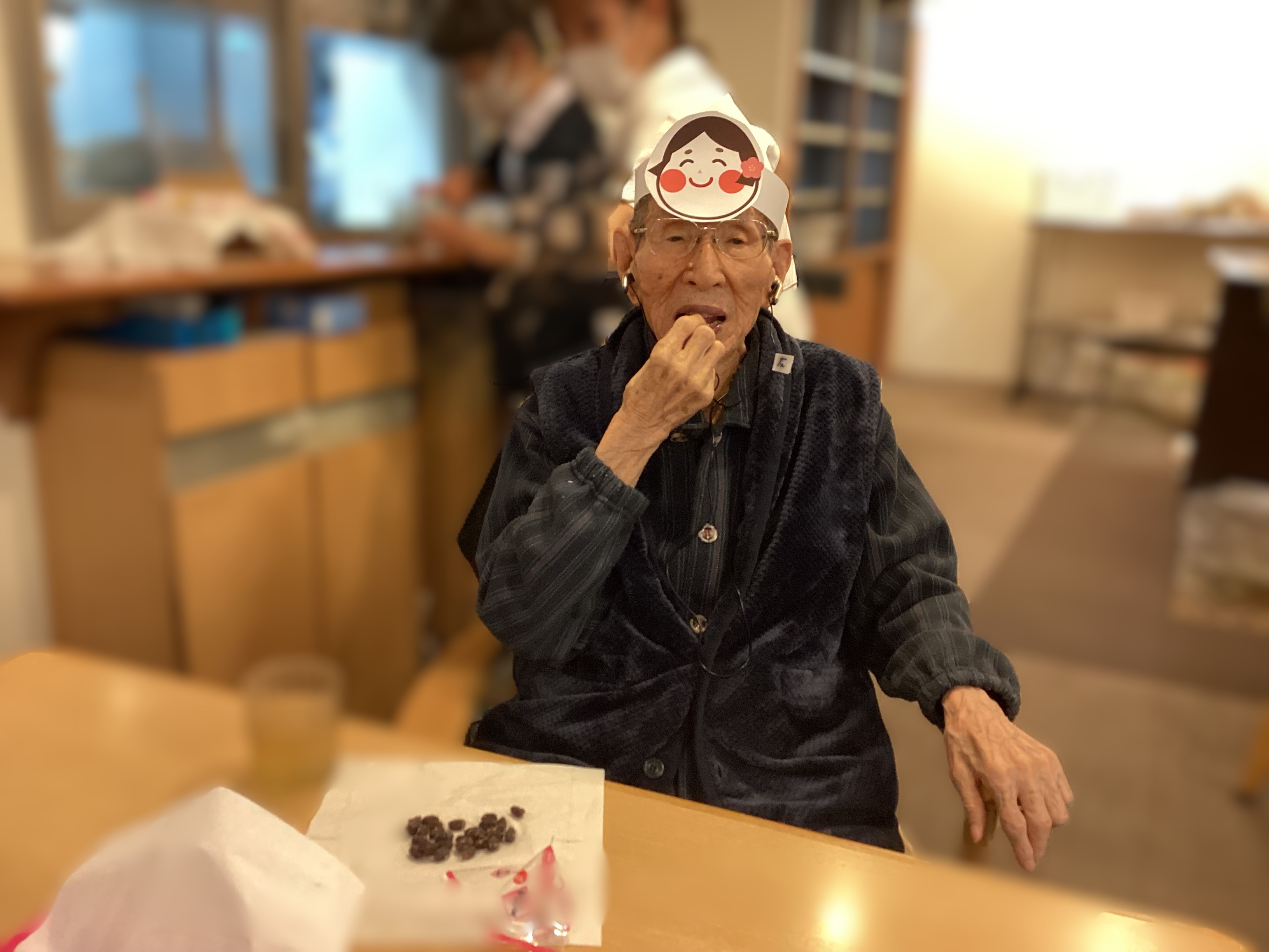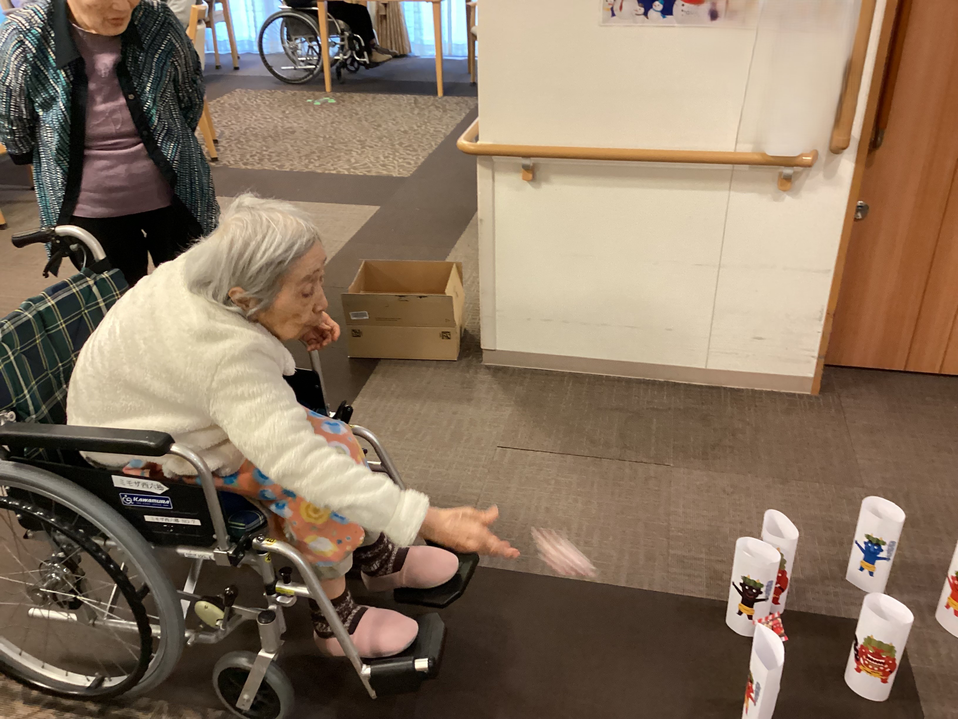 生憎の空模様で体が冷えますね。しかし今日は皆様で節分の豆まき!皆様それぞれの投げ方で鬼を倒していました!倒せた人も倒せなかった人もとても盛り上がりました!最後は皆様で甘納豆を食べて1年の健康を祈願しました。