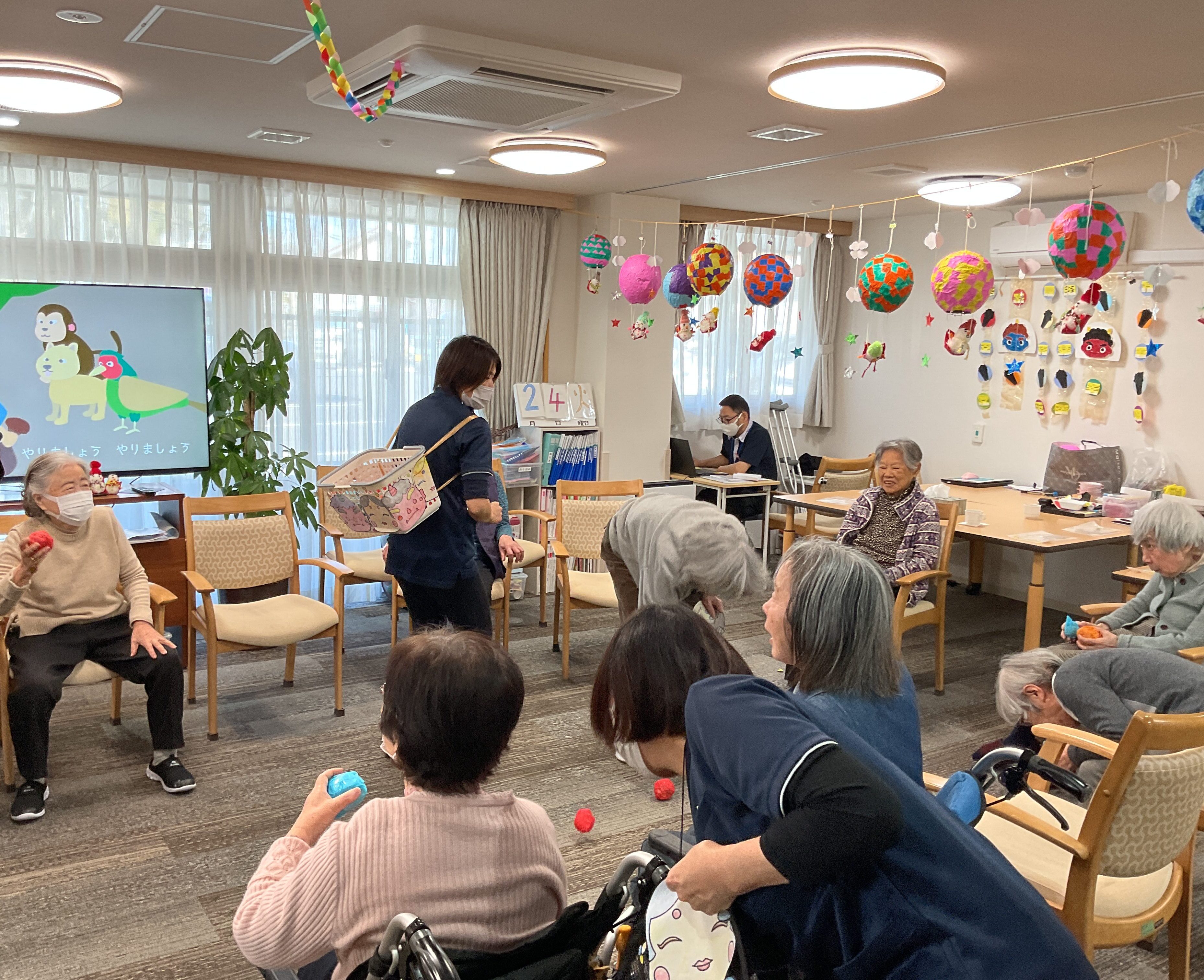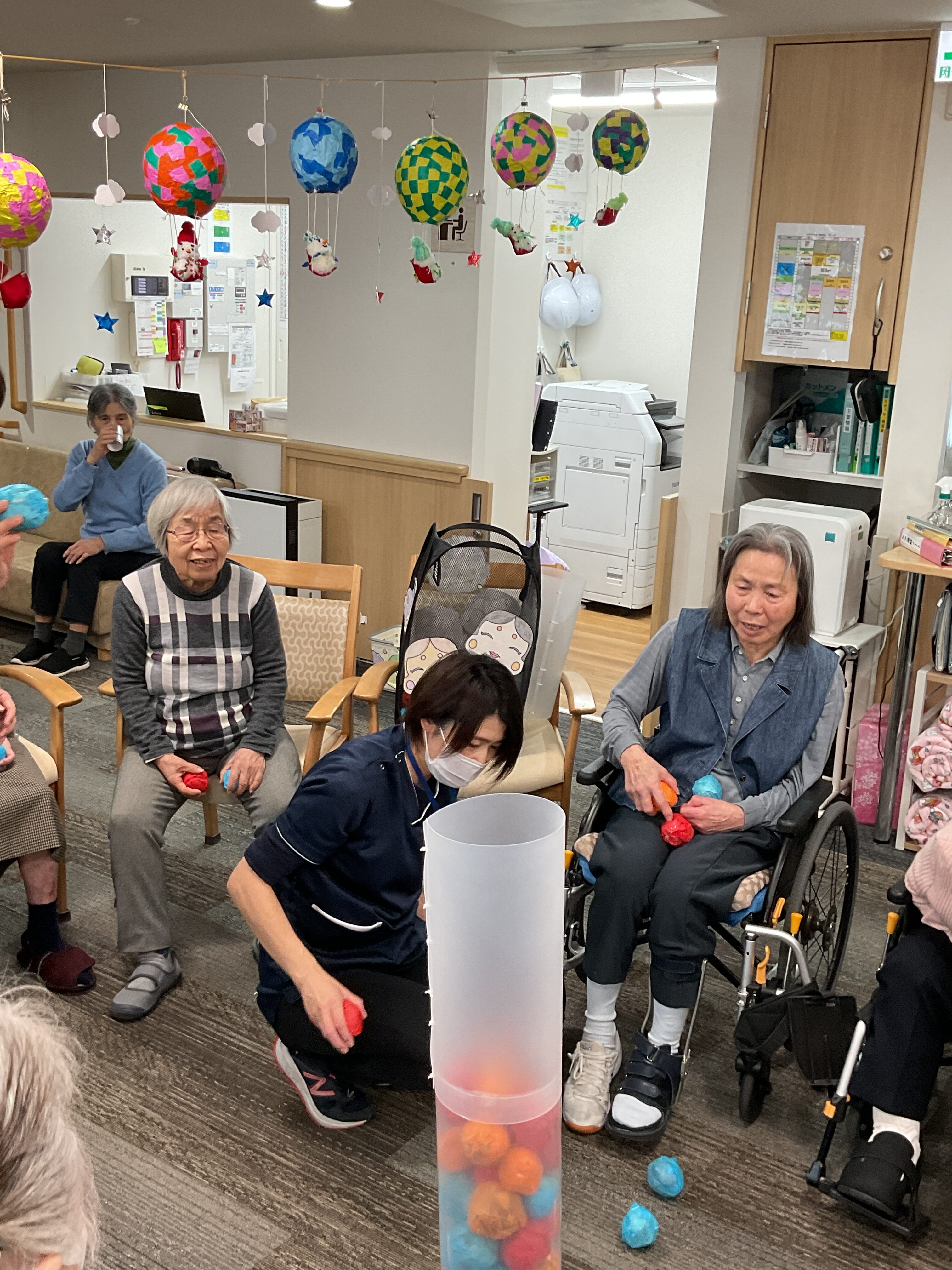今年の節分は2月2日でした。事前に準備をし、2月3日から節分週間で新聞紙を丸めて花紙で巻いた豆をスタッフが背負ったかごや筒に投げ入れたり盛り上がりました!