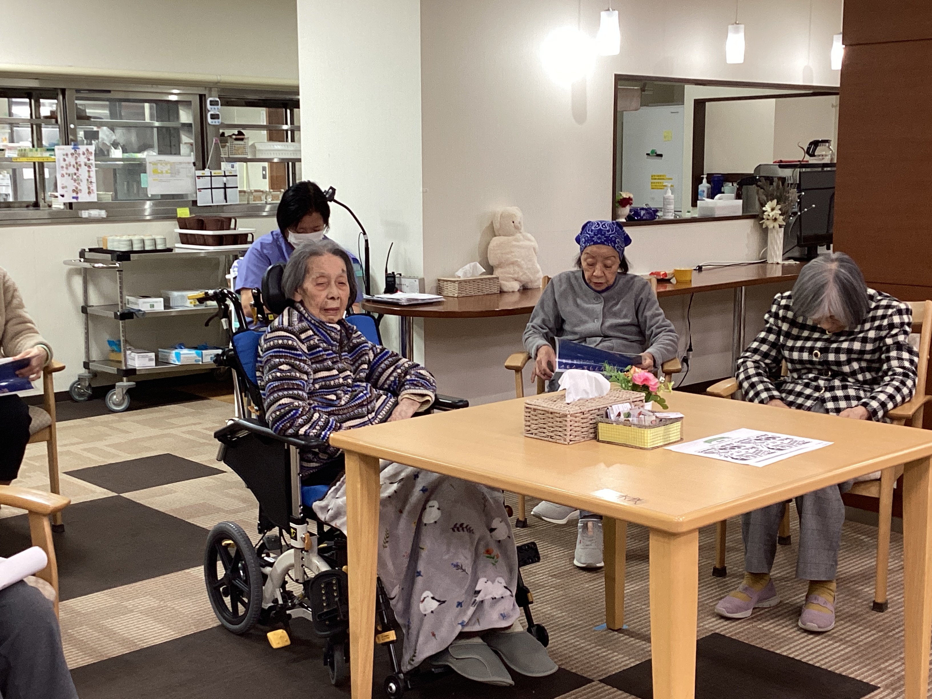 夕食前の時間です⏰本日は食堂にいらっしゃった皆様と輪を作り、一緒に懐かしい歌をうたって過ごしました♪「懐かしいね」「楽しいね」という声が聞かれ、楽しそうなご様子でした♪