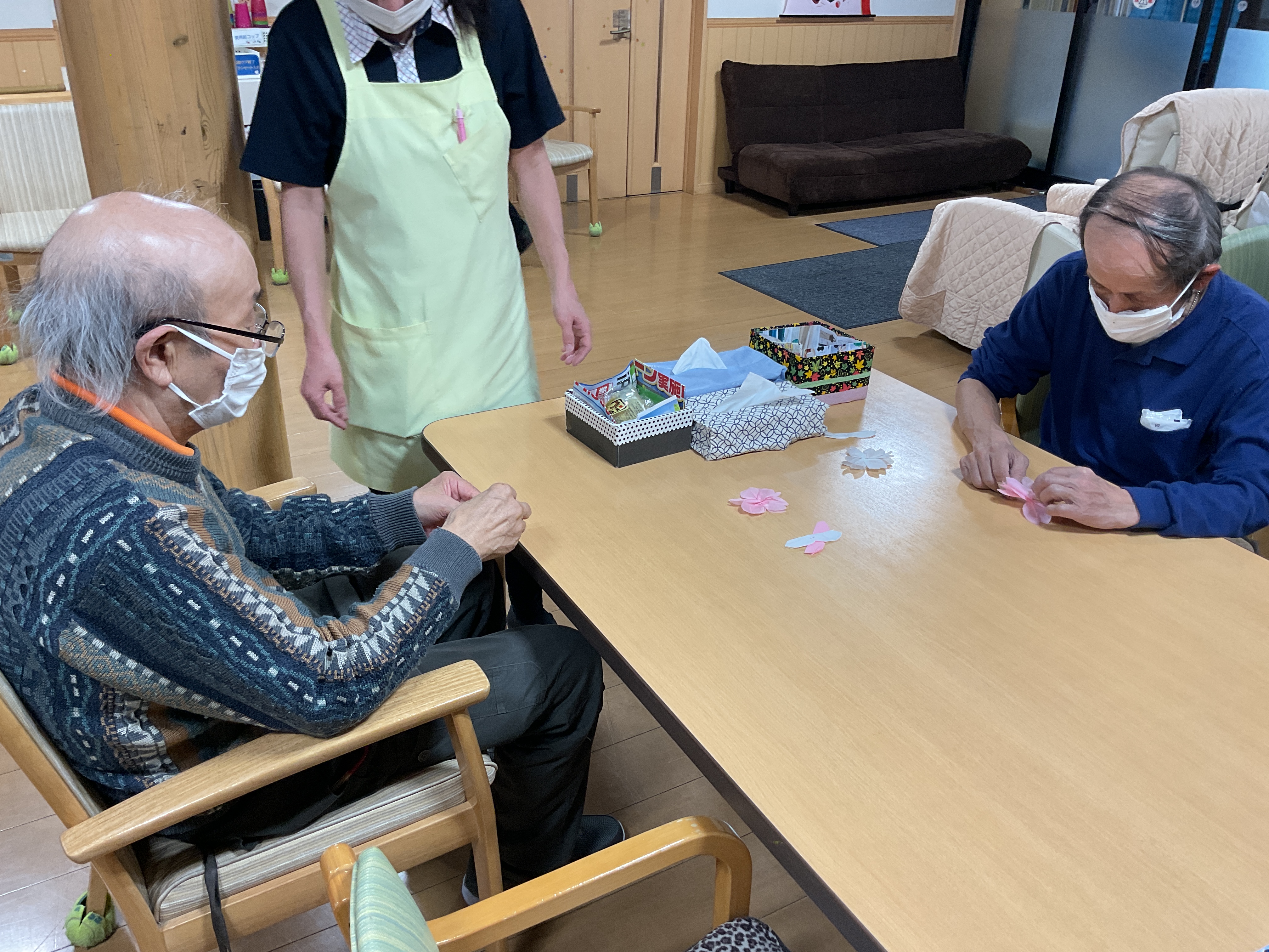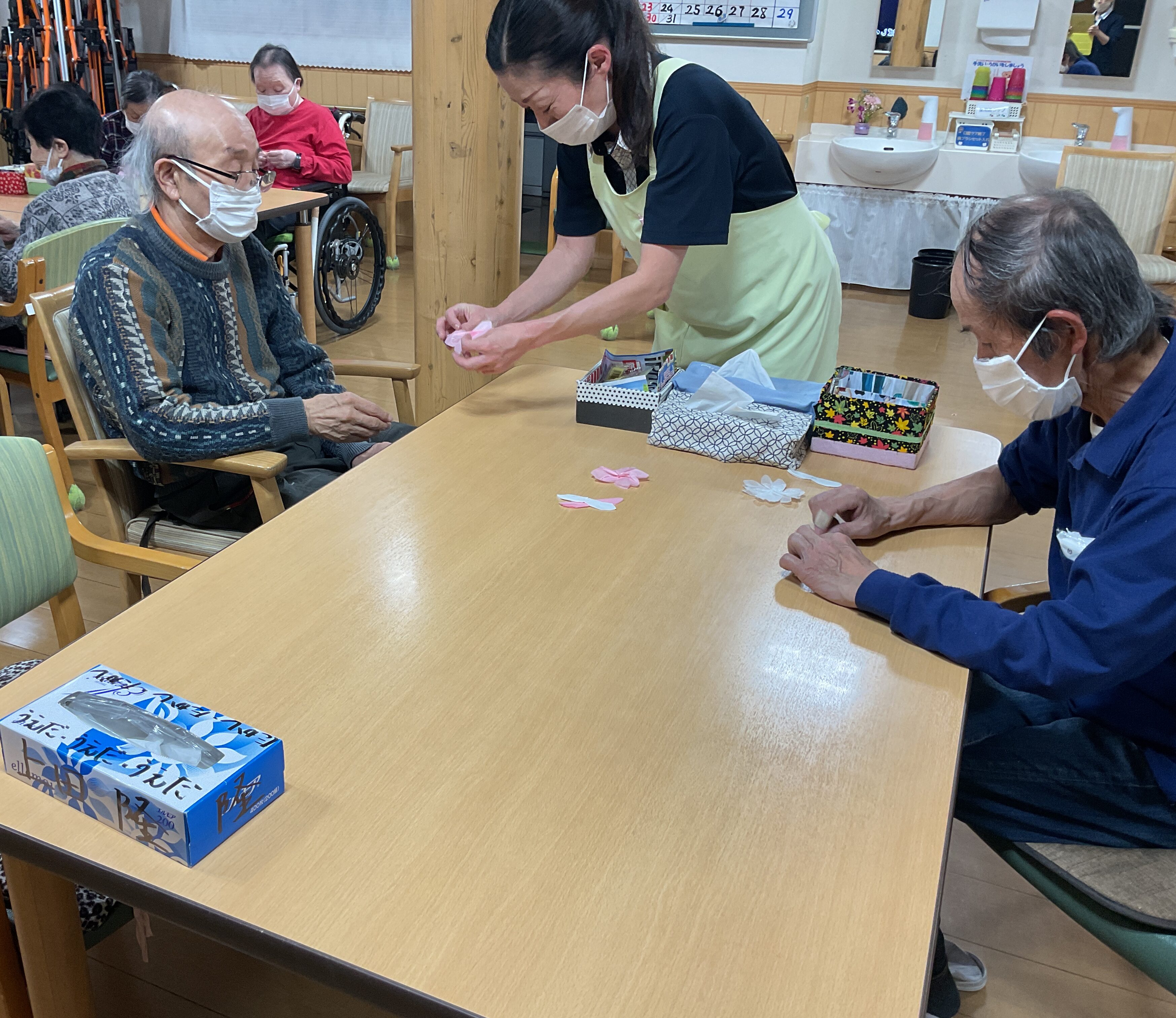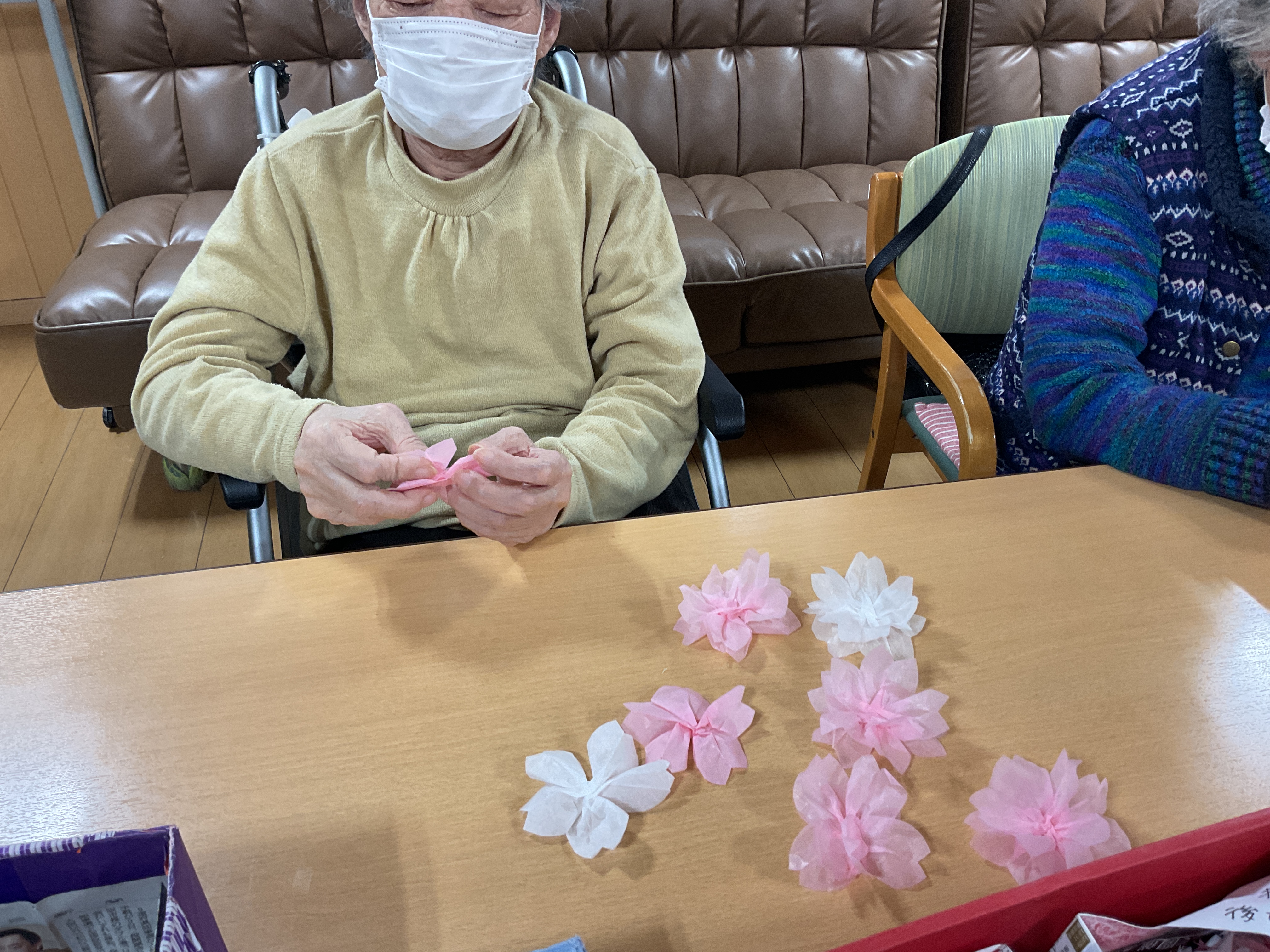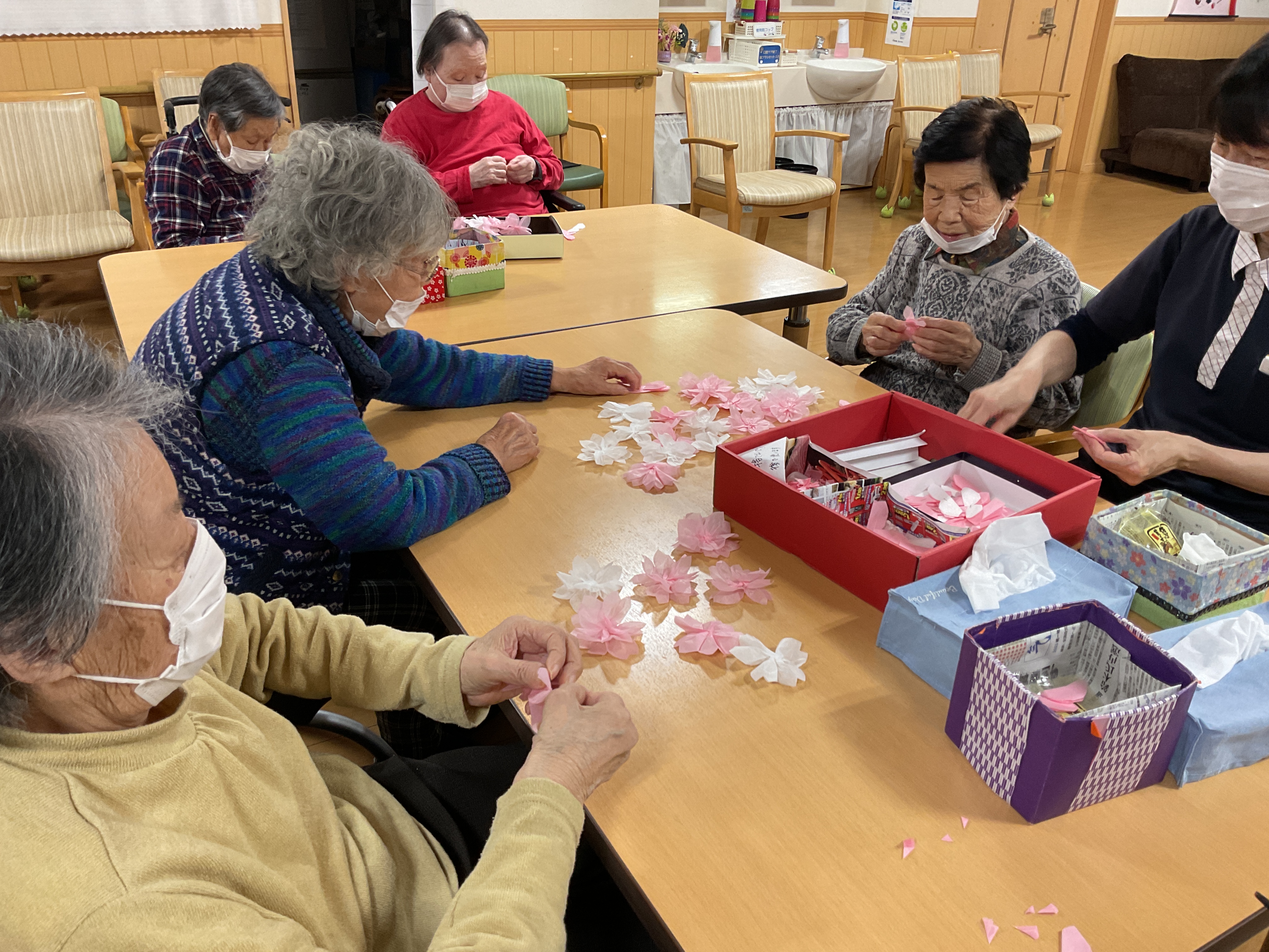 みんなで毎日、コツコツ桜の装飾作り 折ったり広げたり、手先のリハにもなりますね~ どんな桜の装飾ができるかはお楽しみ♬