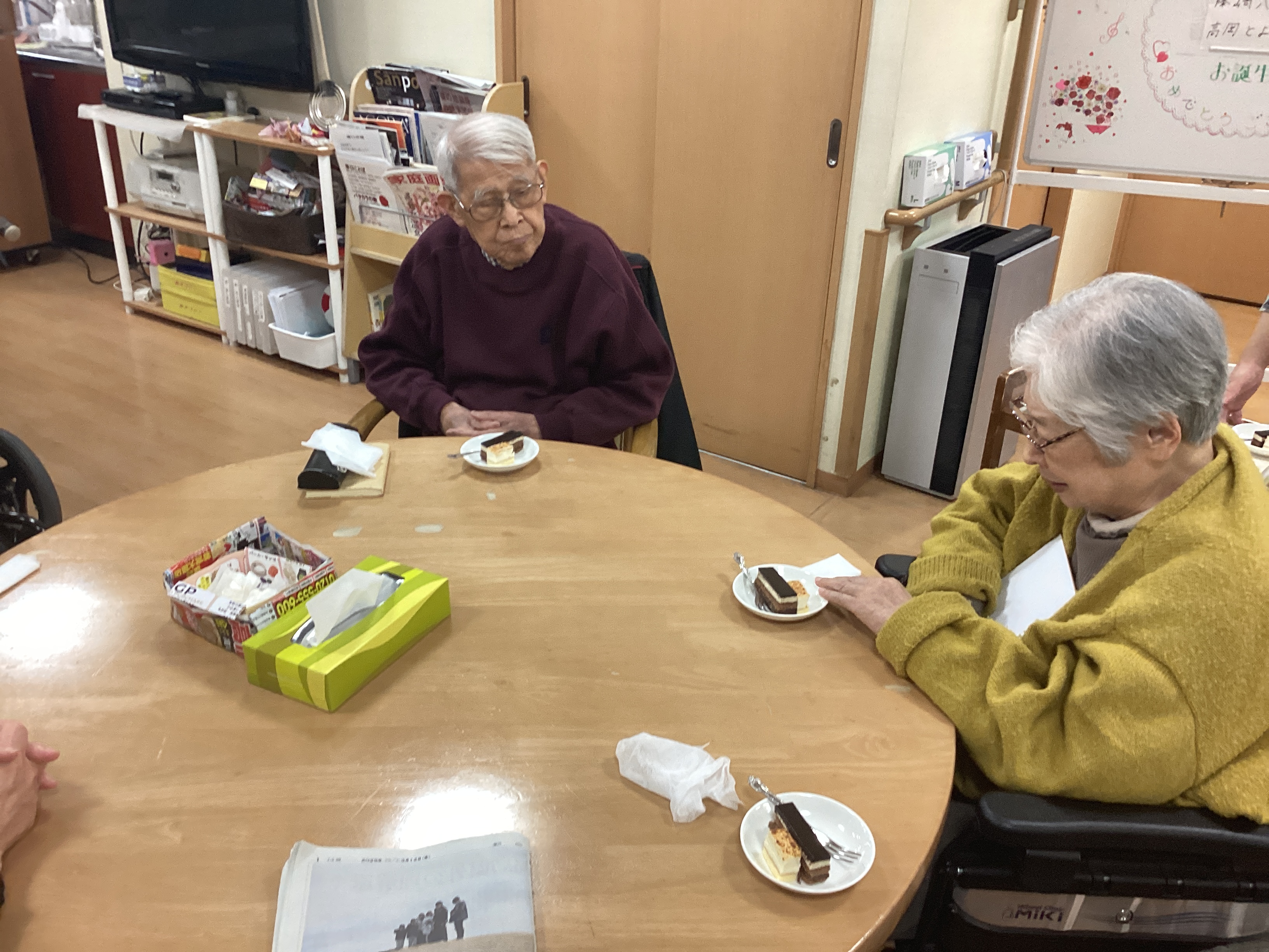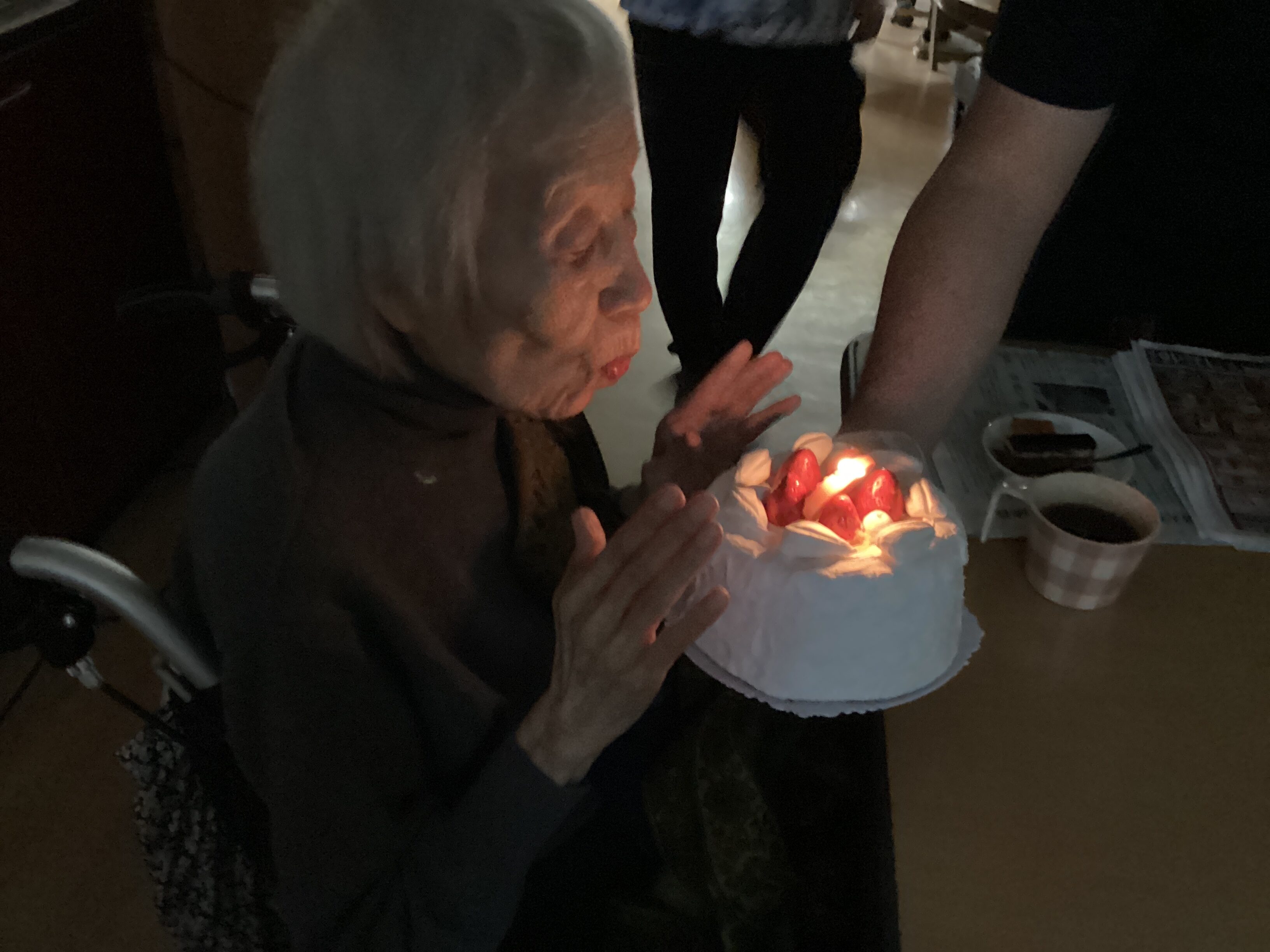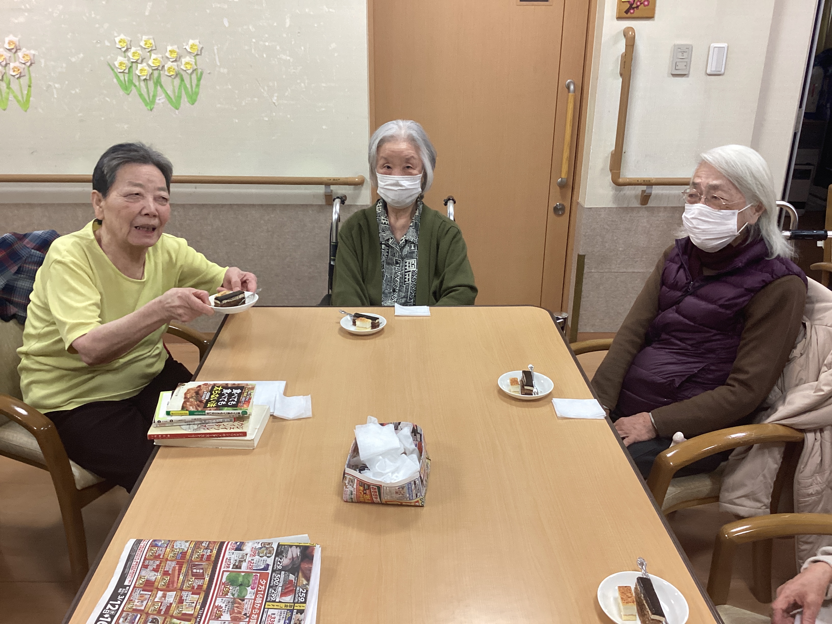 今日は3月前半生まれの誕生日会、それぞれロウソク消しに乙女のようでした。利用者のみんなで一緒にケーキでお祝いしました。